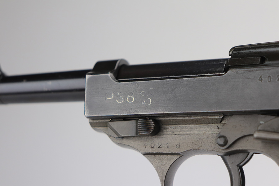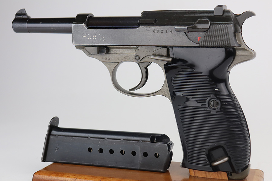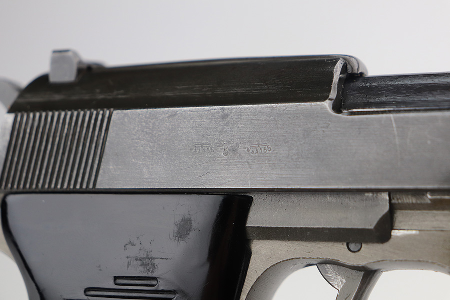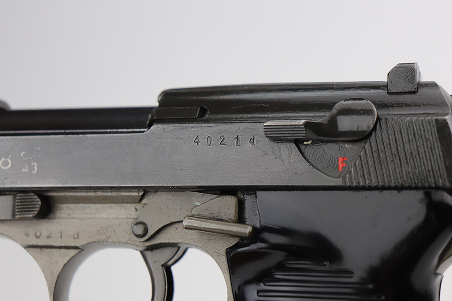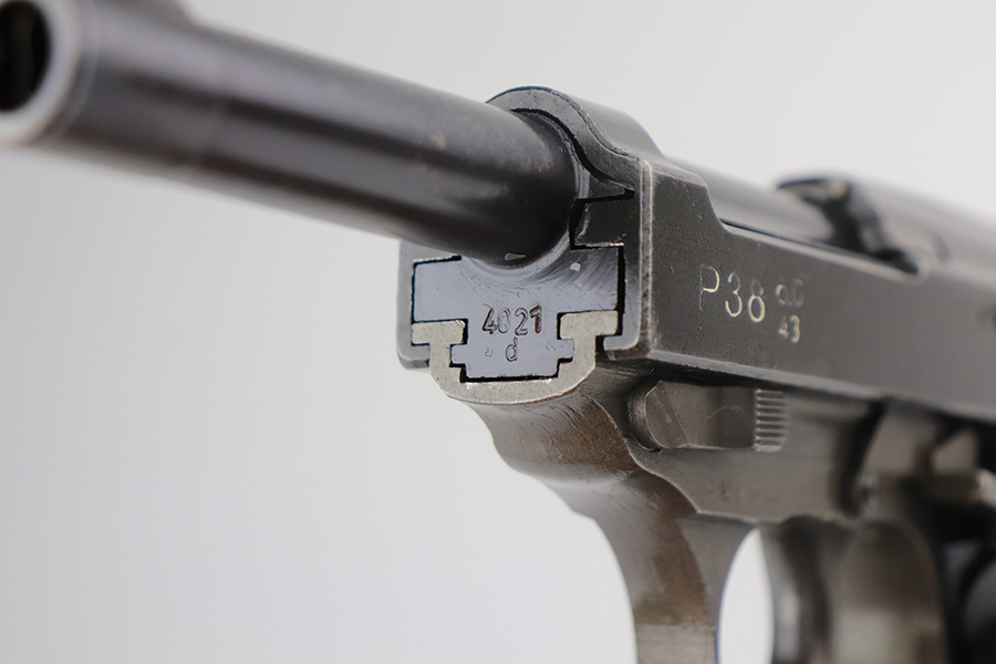 6/16/21 – This is a very nice example of a dual-tone Mauser P.38 issued to the Nazi military in 1943. This one has a rare FN-manufactured slide. It gets its dual-to appearance from a phosphate frame and slide and a blued barrel. It is all matching and has the proper “Waffen 135” military proofs. It has retained about 95% of its original finish. There is just a hint of wear on the left front edge of the slide and some very light surface scratches on the right side of the slide. A few tiny handling marks on the barrel and a hint of thinning on the front strap. There is some spotty oxidation here and there, typical with these phosphate-finished guns. Comes with excellent grips and a period-correct Mauser magazine. The bore is shiny with strong rifling with very minor freckling in the grooves. De-cocker is functional.