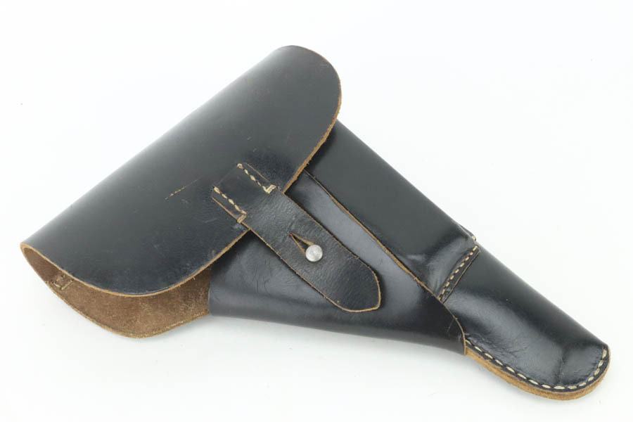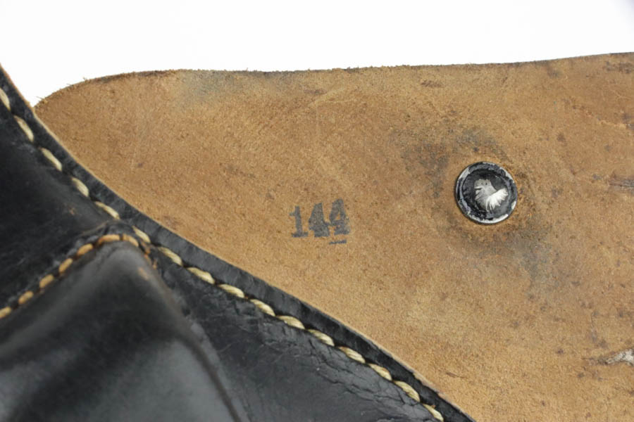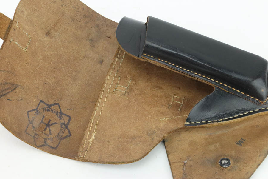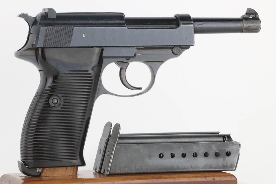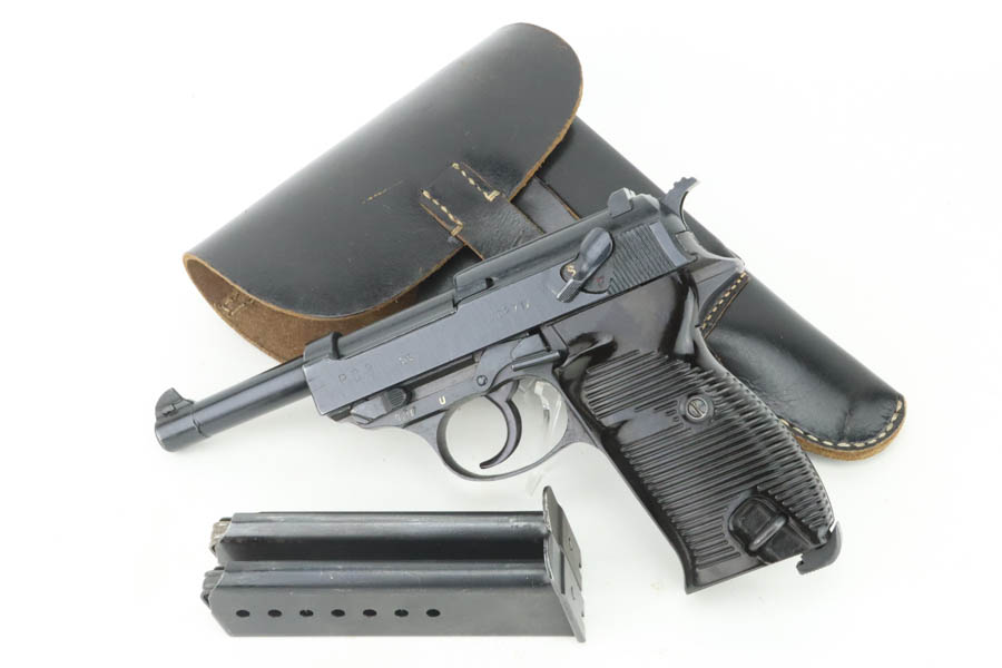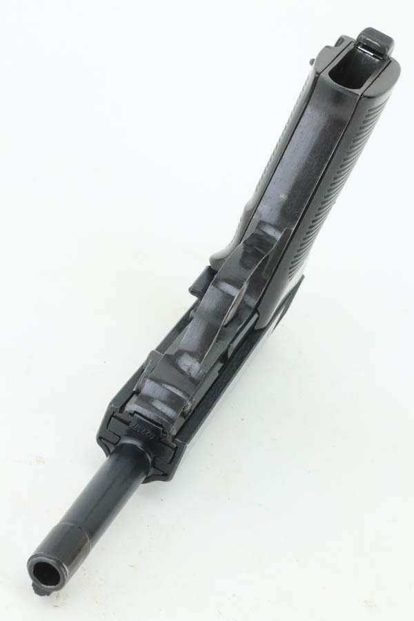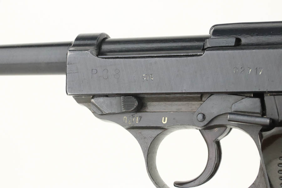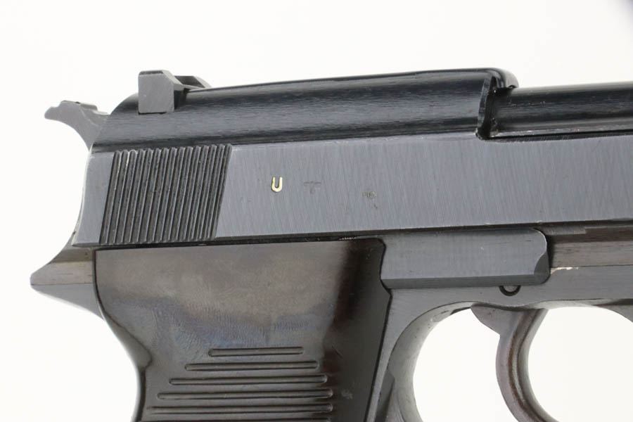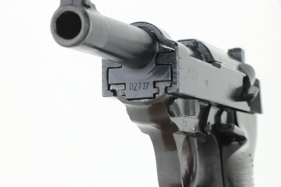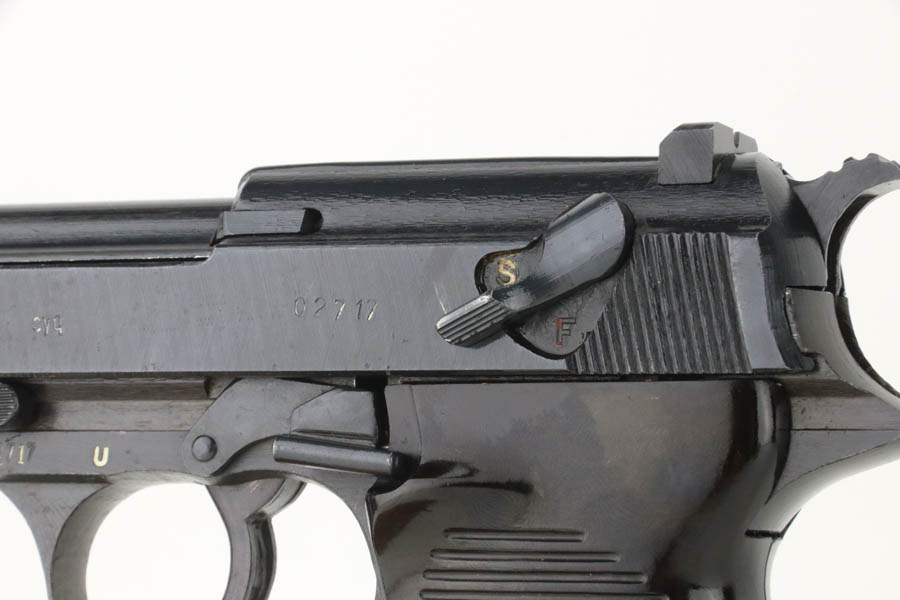 8/7/24 – This is a near-mint example of a rare zero-series Spreewerk P.38 manufactured in 1945. It is all matching and has the proper end-of-war “U” proofs. It comes as a rig with two jvd magazines and an un-issued 1945-dated soft shell holster (ink stamp on the inside, but we’re not sure what it stands for). The gun itself has retained nearly all of its finish with just hints of wear around the muzzle and on the front edges of the slide. Fitted with correct blackish-brown Walther grips. The bore has strong rifling, but there is some very light pin-pricking. De-cocker is functional.