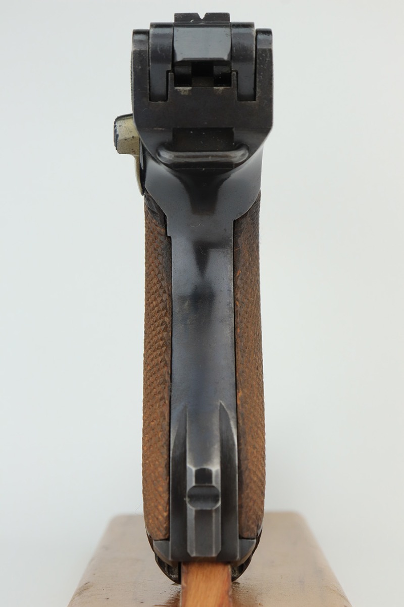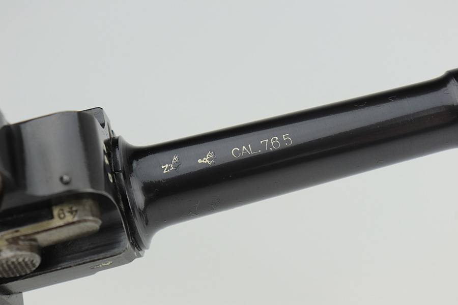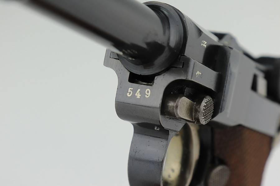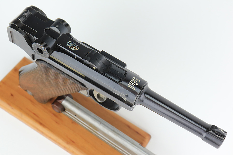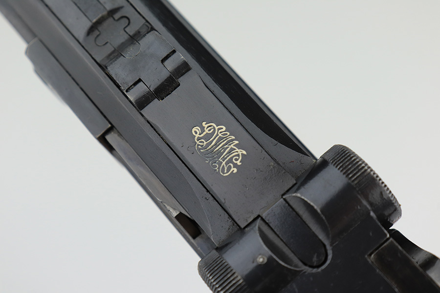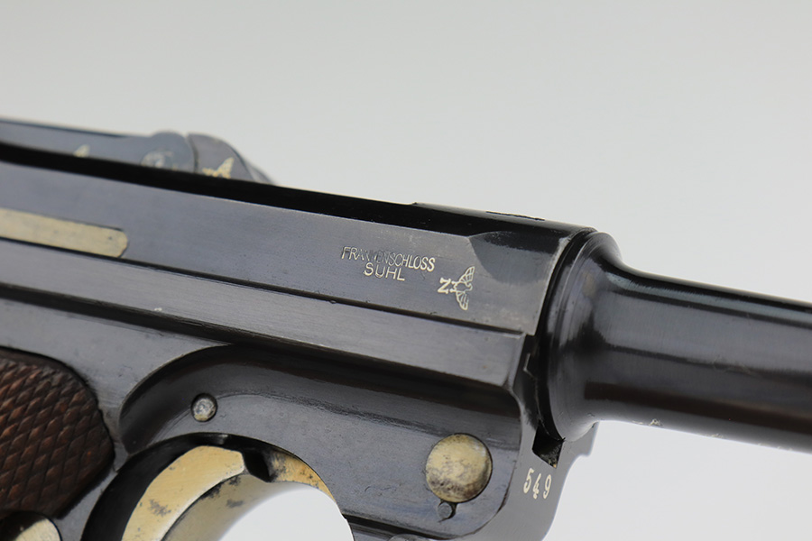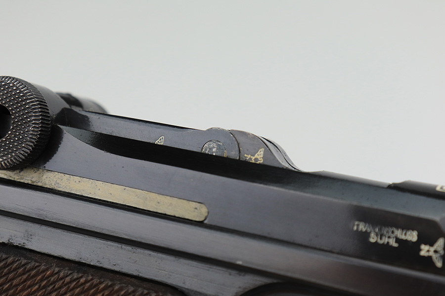 1/23/23 – This is a rare and very unusual DWM Luger with little documented facts on the variation. The pistol appears outwardly as a commercial 1920s variation of the DWM Luger in 7.65mm caliber. . The barrel extension is stamped in small letters; “FRANKENSCHLOSS- SUHL” and the top of the chamber area has been marked with the “Lithuanian Crest” (Pillars of Gediminas) as seen the Lithuanian contract Browning High Power pistols. The theory on these very unusual or rare Lugers is that they were actually early commercial lugers that were purchased or owned by the small Baltic country of Lithuania on the Baltic Sea, (prior to being taken over by Russia) . The Lithuanian government issued a contract to the small shop of Frankenschloss in Suhl, German in the providence of Thüringen to rework or rebarrel these in the late 1930s or early 1940s. There is no documented proof on this theory, however several have been reported over the years, with the story being that they were liberated during the post Cold War years from Lithuanian Border Guards. The finish on this pistol is in terrific condition with minimal edge wear. The bore has strong rifling but a little frost in the grooves. Excellent, unmarked grips. Magazine base is also unmarked. The pistol has a mix of Crown/N and Eagle/N proofs and matching numbers throughout.