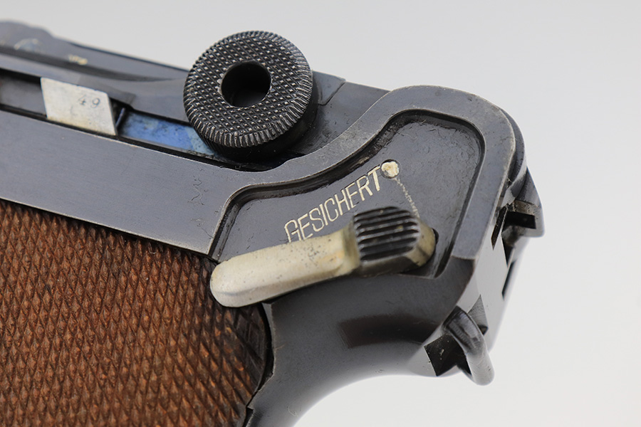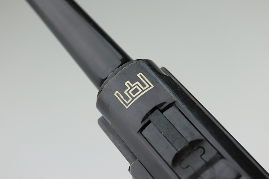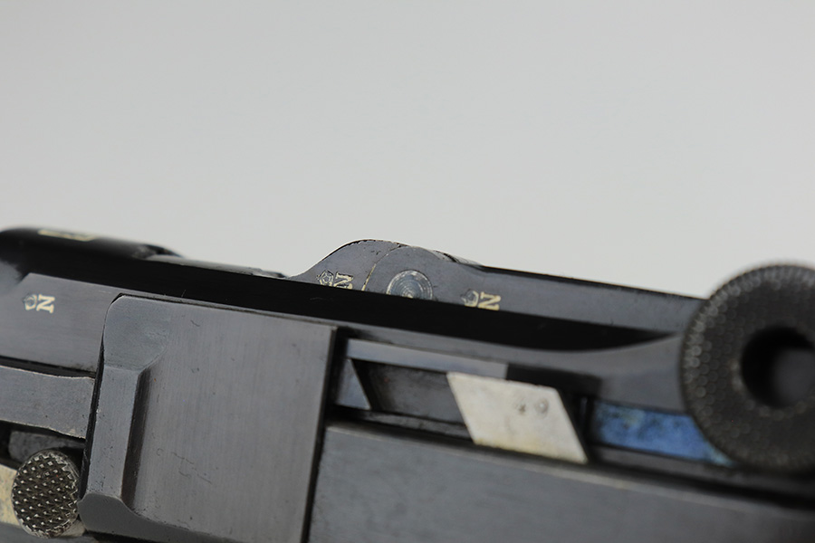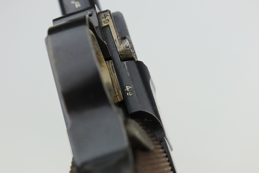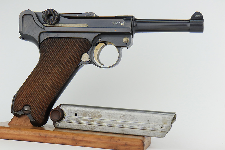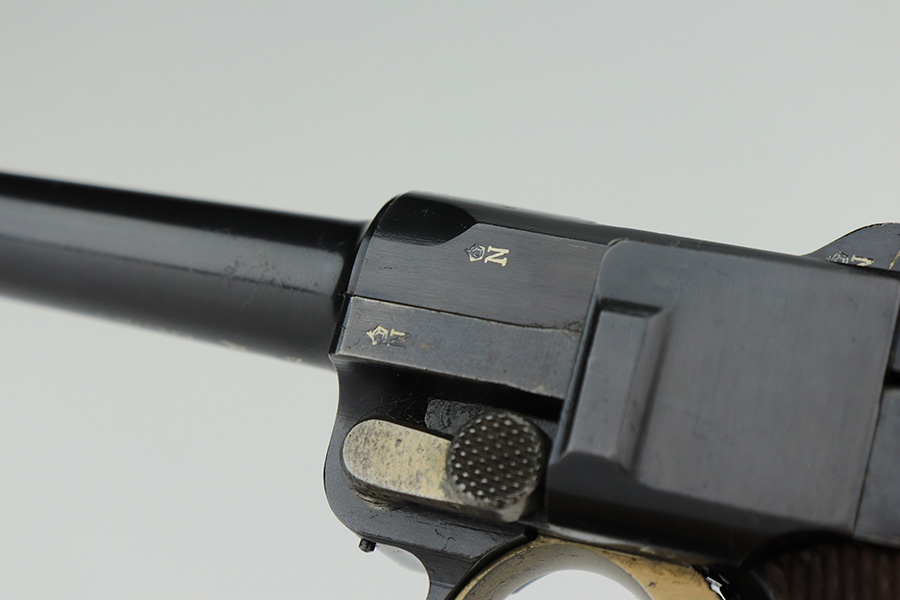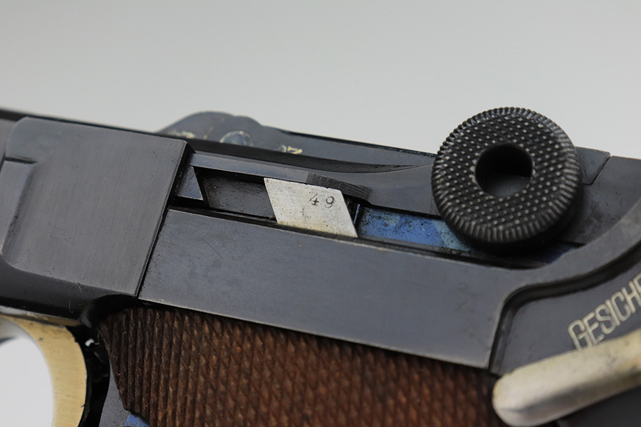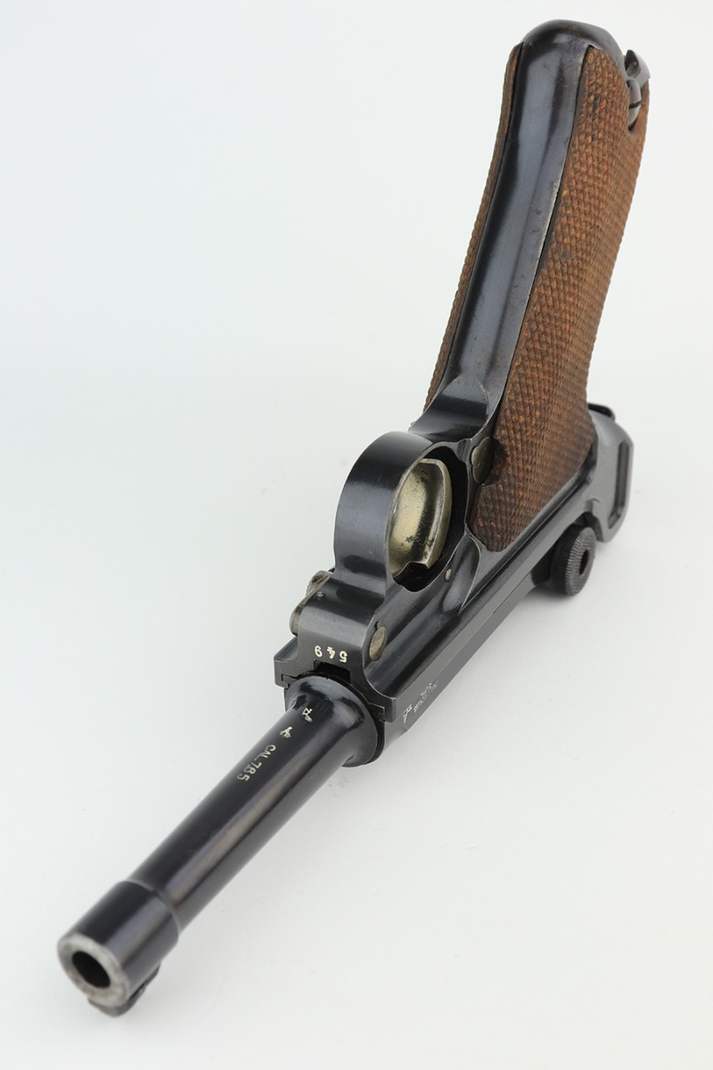 1/23/23 – This is a rare and very unusual DWM Luger with little documented facts on the variation. The pistol appears outwardly as a commercial 1920s variation of the DWM Luger in 7.65mm caliber. . The barrel extension is stamped in small letters; “FRANKENSCHLOSS- SUHL” and the top of the chamber area has been marked with the “Lithuanian Crest” (Pillars of Gediminas) as seen the Lithuanian contract Browning High Power pistols. The theory on these very unusual or rare Lugers is that they were actually early commercial lugers that were purchased or owned by the small Baltic country of Lithuania on the Baltic Sea, (prior to being taken over by Russia) . The Lithuanian government issued a contract to the small shop of Frankenschloss in Suhl, German in the providence of Thüringen to rework or rebarrel these in the late 1930s or early 1940s. There is no documented proof on this theory, however several have been reported over the years, with the story being that they were liberated during the post Cold War years from Lithuanian Border Guards. The finish on this pistol is in terrific condition with minimal edge wear. The bore has strong rifling but a little frost in the grooves. Excellent, unmarked grips. Magazine base is also unmarked. The pistol has a mix of Crown/N and Eagle/N proofs and matching numbers throughout.