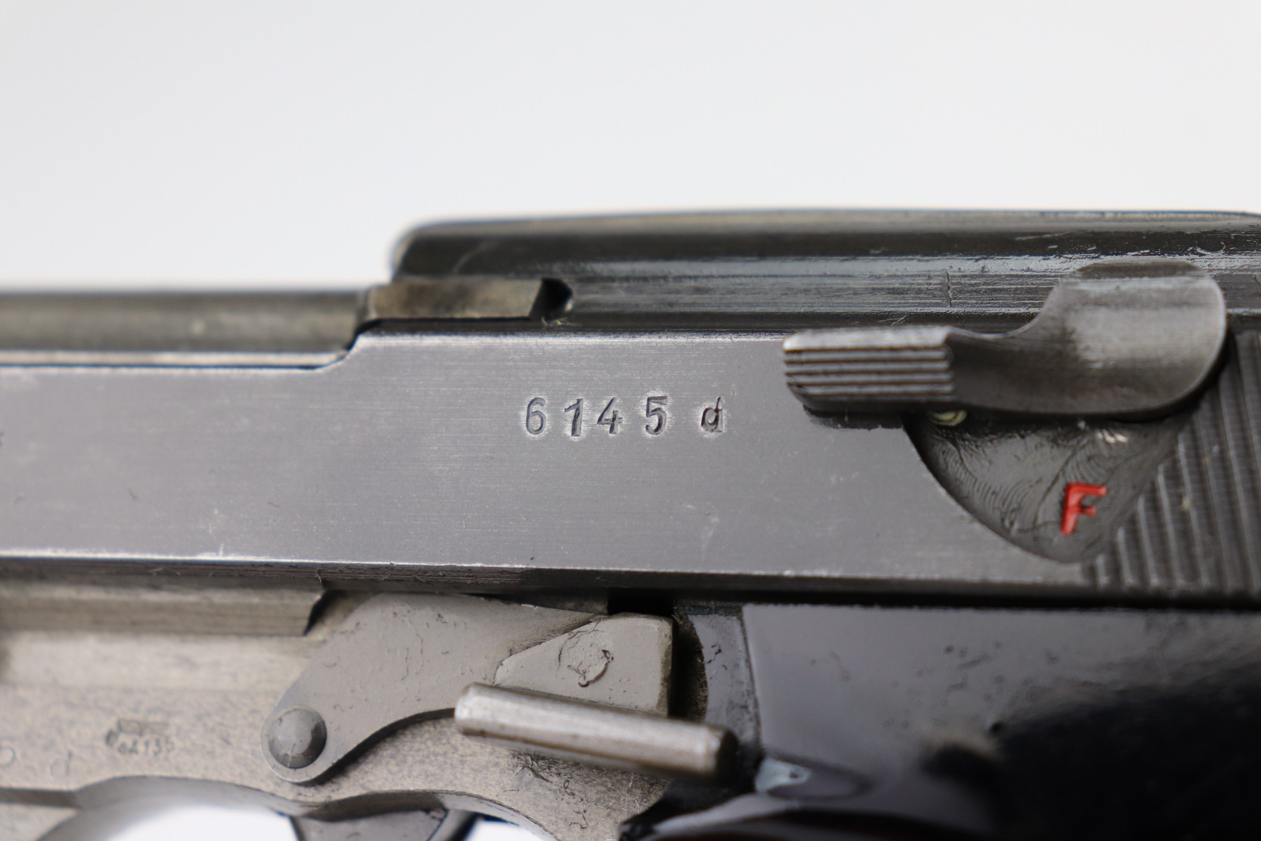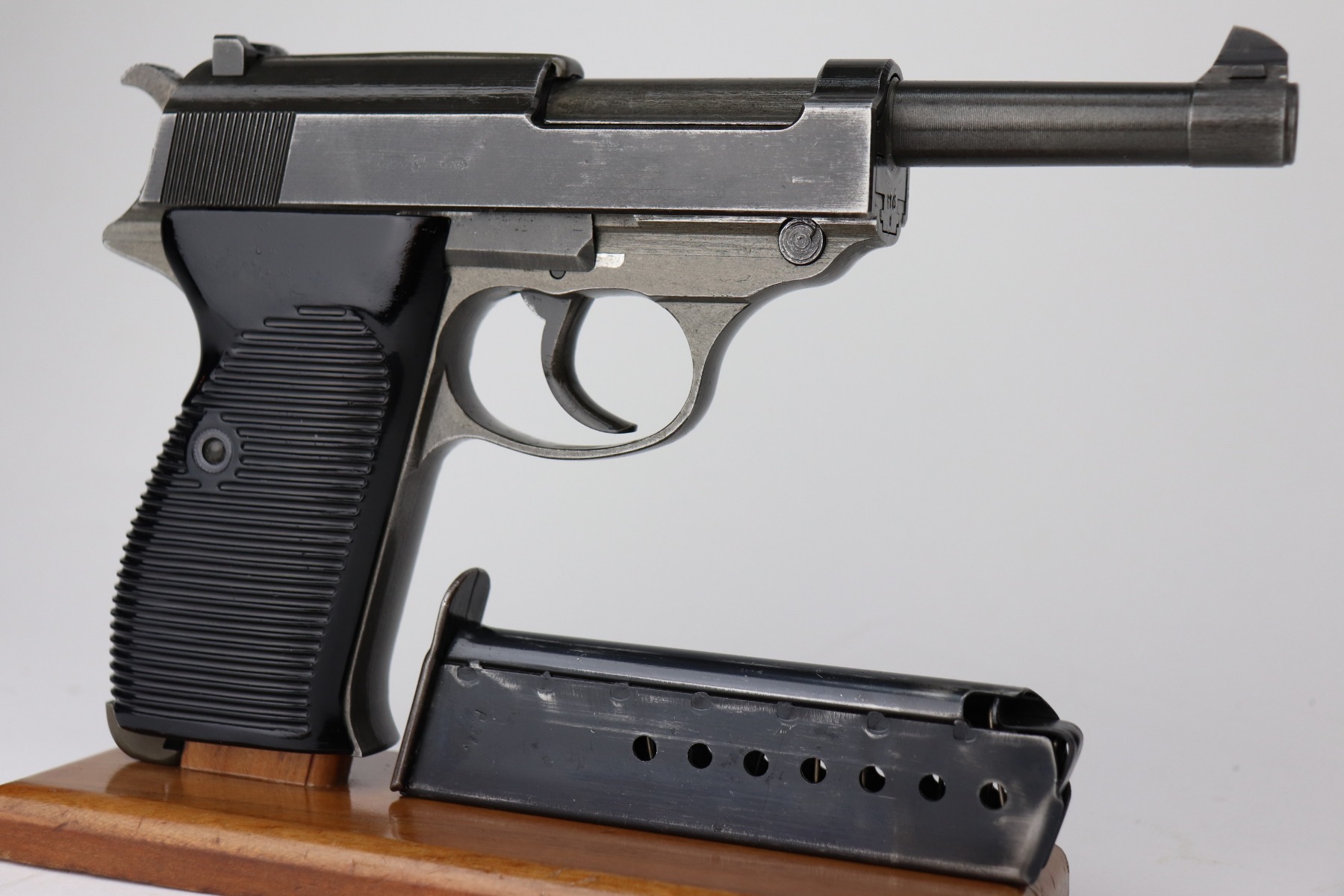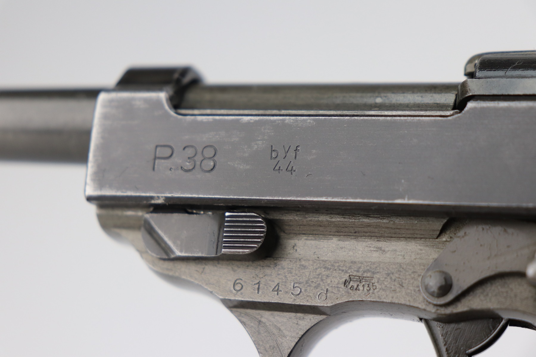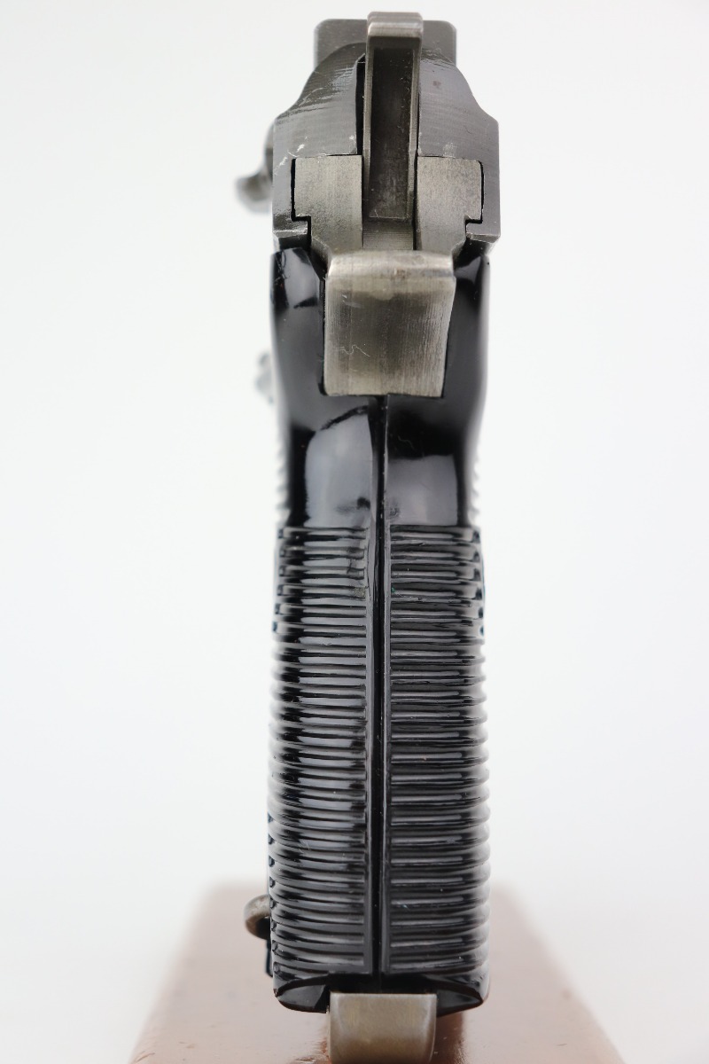 3/17/21 – This is a minty example of a Mauser P.38 issued to the Nazi military in 1944. This one has a rare all-phosphate finish. It is all matching and has the proper “Waffen 135” military proofs. It has retained about 98% of its original finish. There is just very minor wear on the high edges of the slide. The underside of the frame and front strap shows rough machining and the appearance of thinning, but this is just the nature of the phosphate. Spotty oxidation here and there, typical with these guns. Comes with excellent grips and a period-correct magazine. Mint bore. De-cocker is functional.