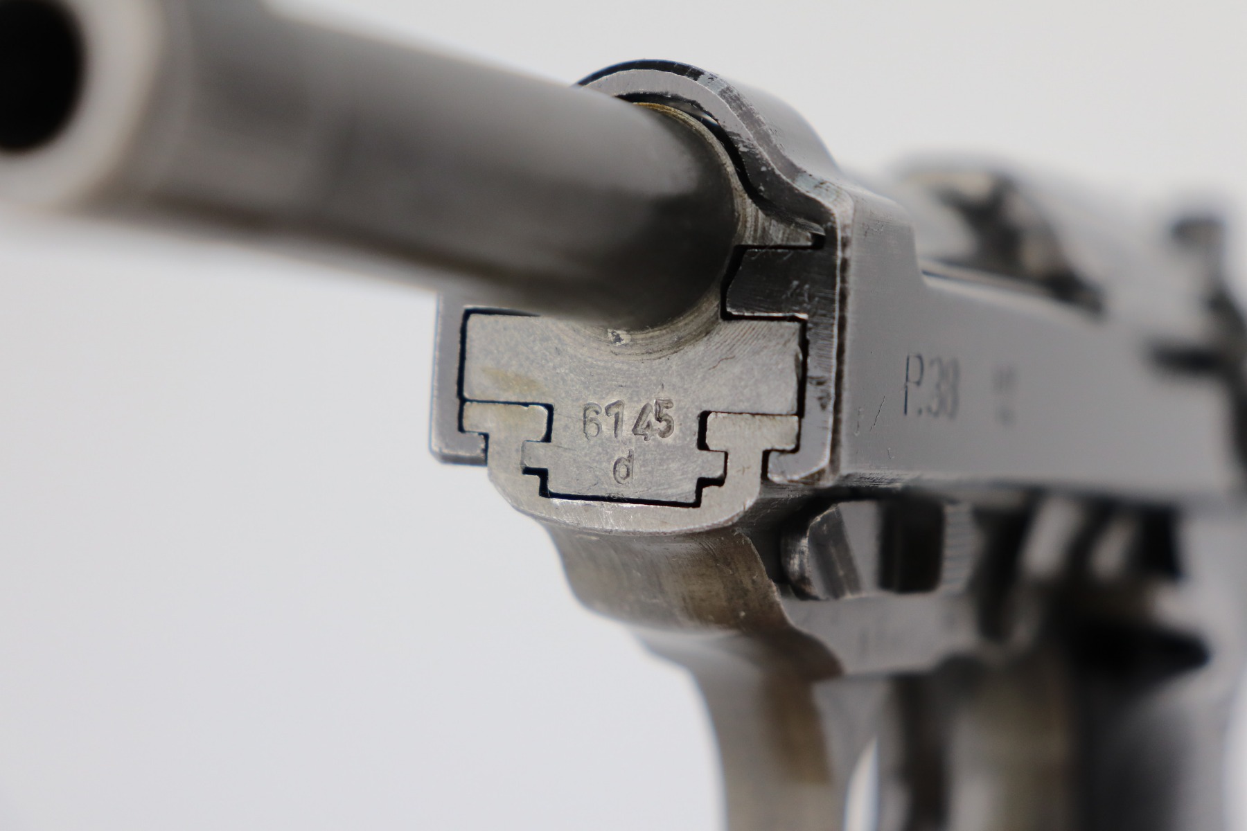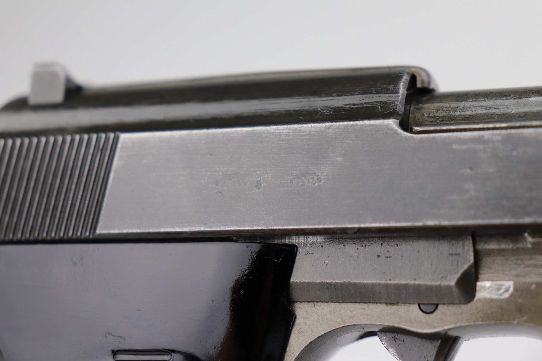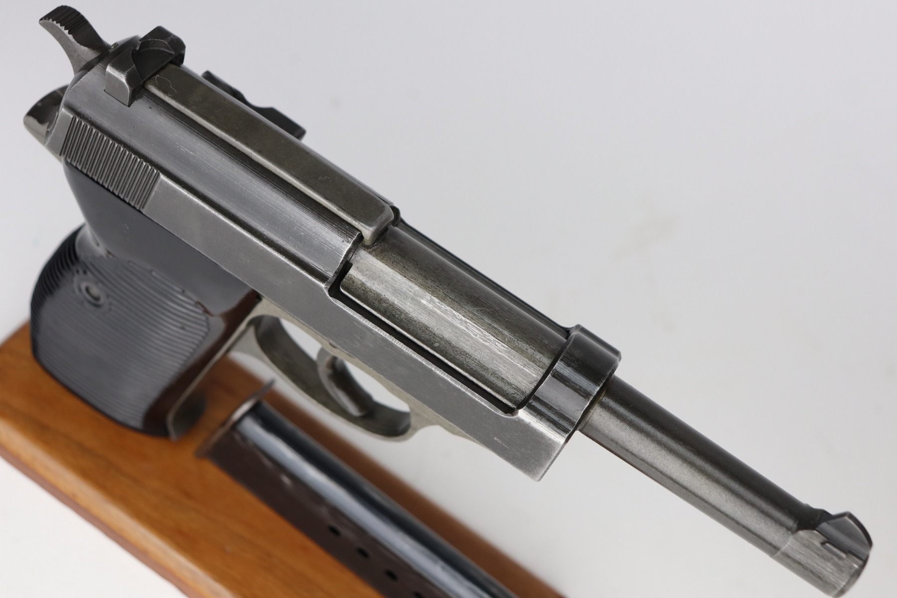 3/17/21 – This is a minty example of a Mauser P.38 issued to the Nazi military in 1944. This one has a rare all-phosphate finish. It is all matching and has the proper “Waffen 135” military proofs. It has retained about 98% of its original finish. There is just very minor wear on the high edges of the slide. The underside of the frame and front strap shows rough machining and the appearance of thinning, but this is just the nature of the phosphate. Spotty oxidation here and there, typical with these guns. Comes with excellent grips and a period-correct magazine. Mint bore. De-cocker is functional.