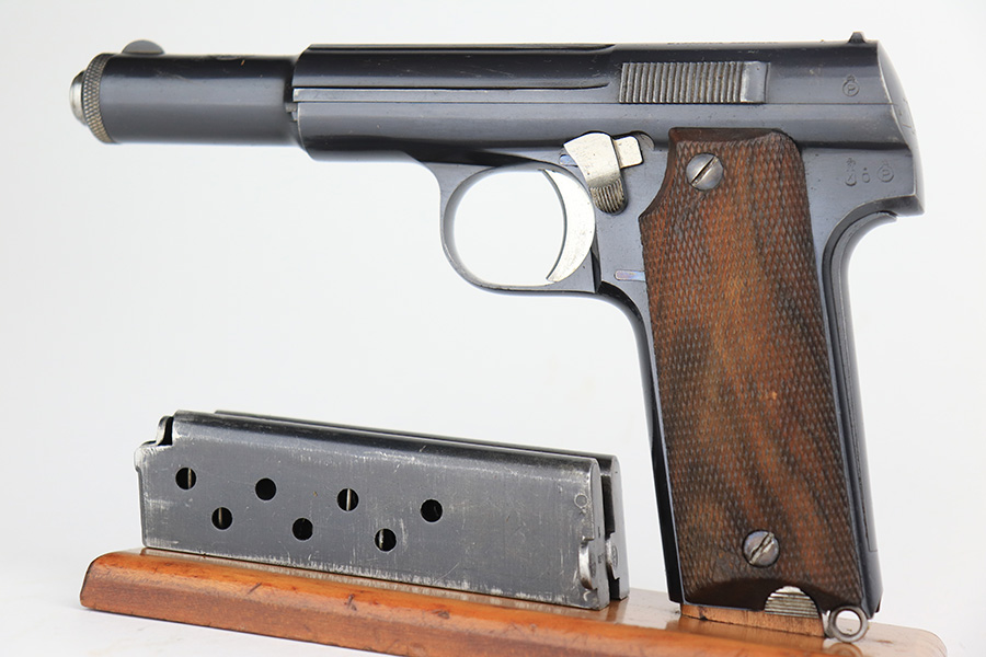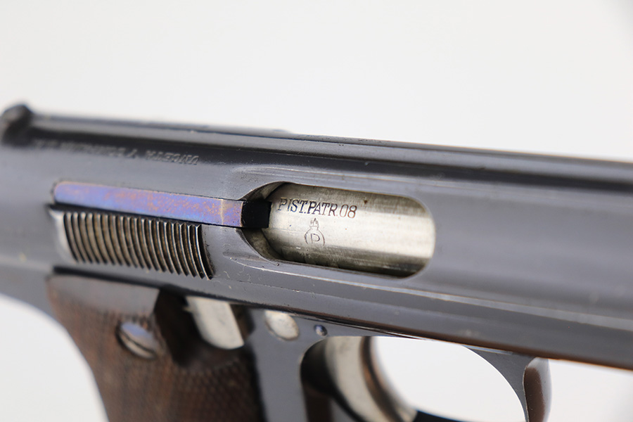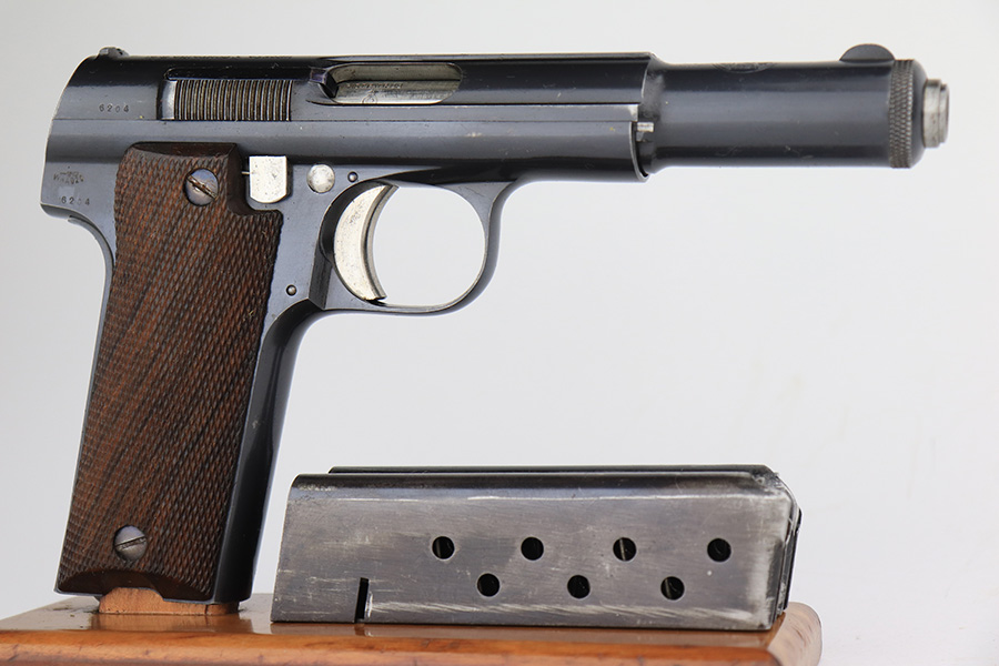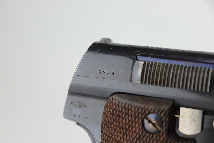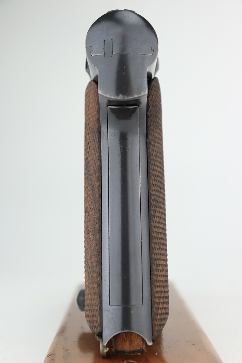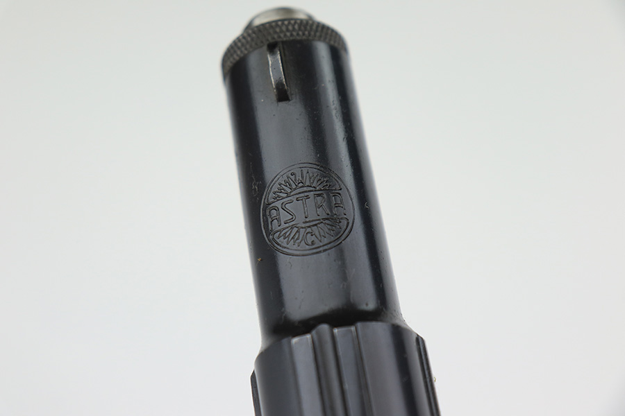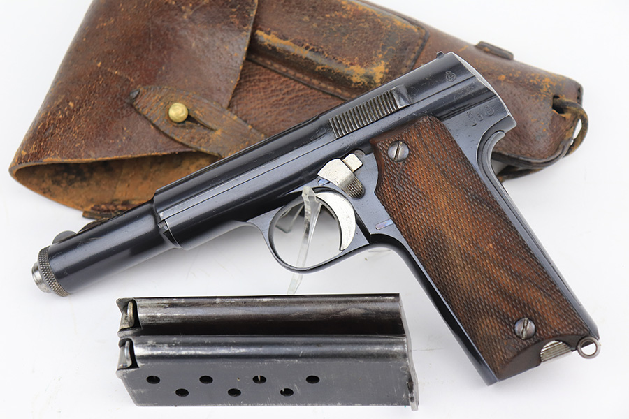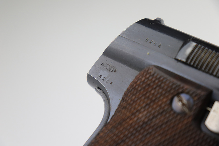 2/20/23 – This is a beautiful example of a Spanish Astra Model 600 issued to the Nazi military in 1944. This particular gun was delivered on June 23rd and was part of a shipment of only 5,000 guns to the Nazi military. It is all matching and has the proper “Waffen D20” military acceptance proof on the right side of the frame. It is in near-mint condition, retaining about 98% of its original finish. There are just hints of wear on some of the high edges and some tiny handling marks here and there. Comes with minty wood grips. The bore is near-mint. The rig includes a proper spare magazine, and has an unmarked and modified holster with it.