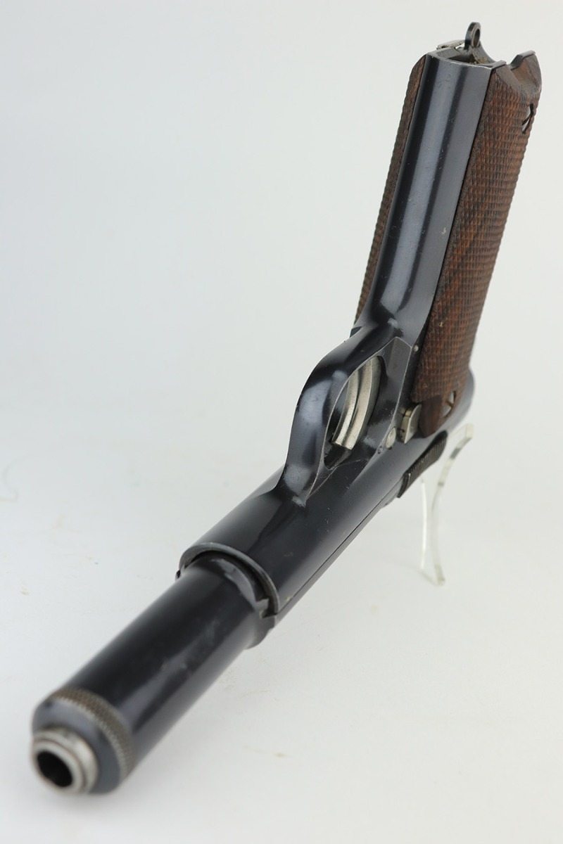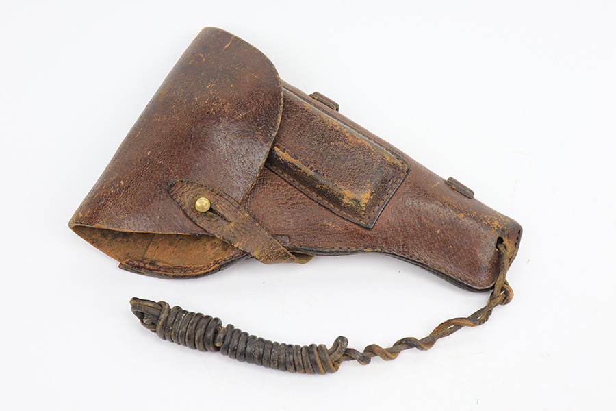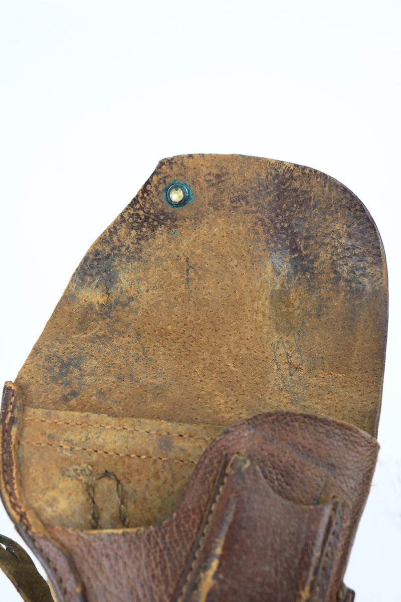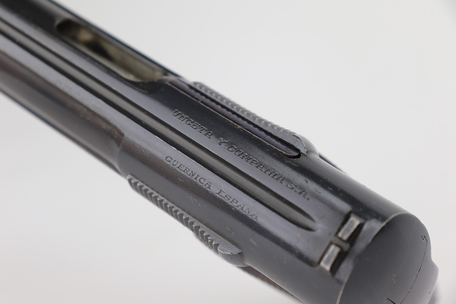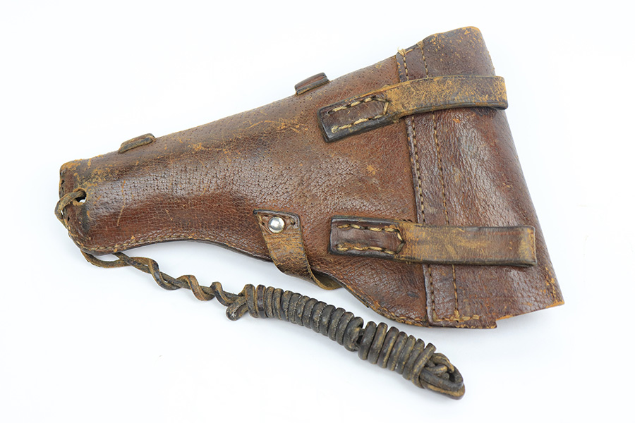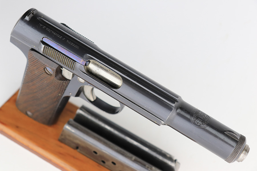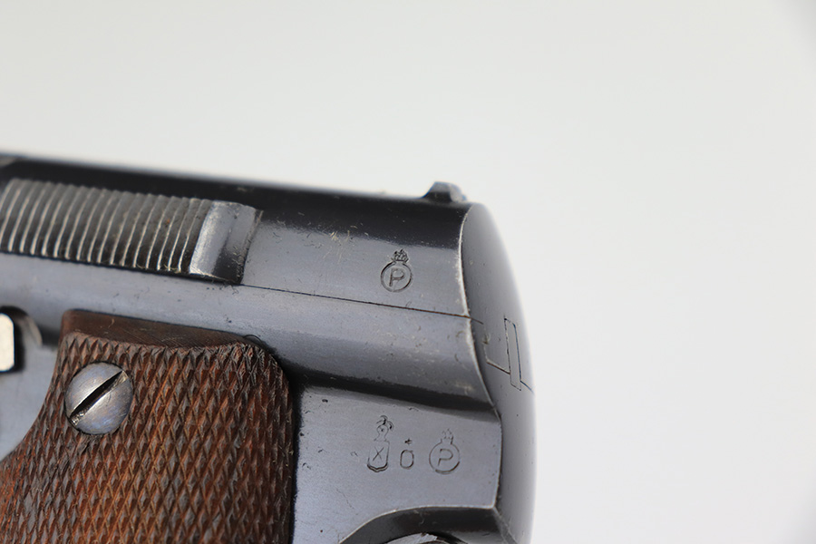 2/20/23 – This is a beautiful example of a Spanish Astra Model 600 issued to the Nazi military in 1944. This particular gun was delivered on June 23rd and was part of a shipment of only 5,000 guns to the Nazi military. It is all matching and has the proper “Waffen D20” military acceptance proof on the right side of the frame. It is in near-mint condition, retaining about 98% of its original finish. There are just hints of wear on some of the high edges and some tiny handling marks here and there. Comes with minty wood grips. The bore is near-mint. The rig includes a proper spare magazine, and has an unmarked and modified holster with it.