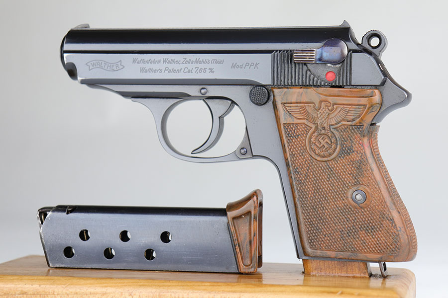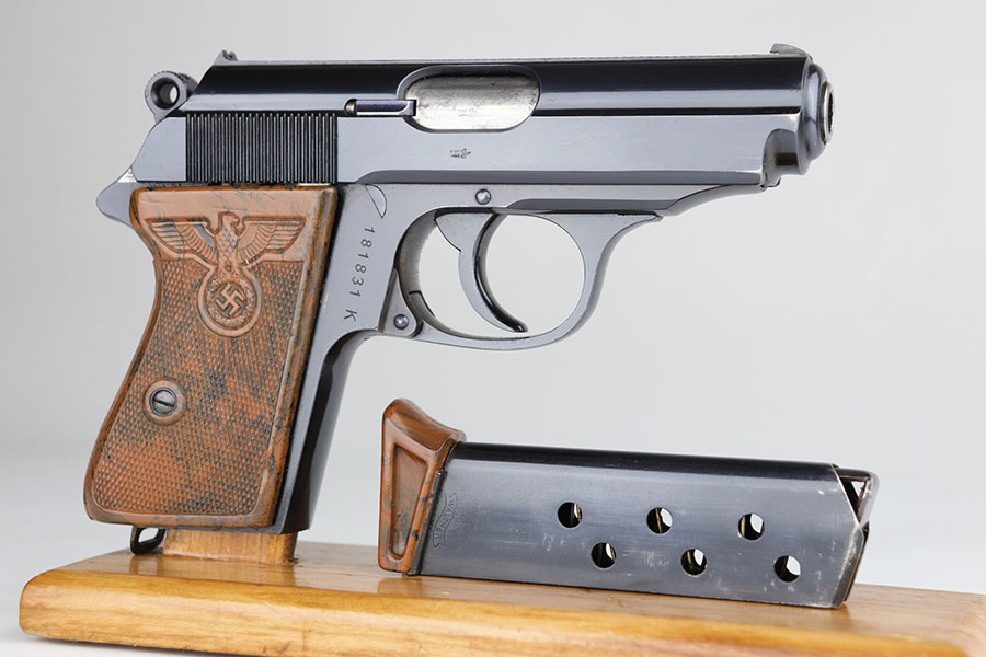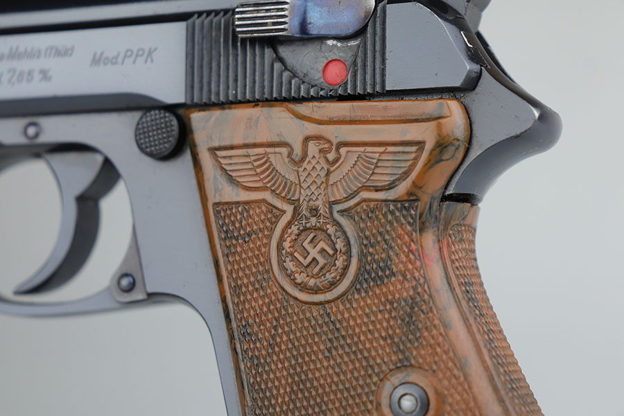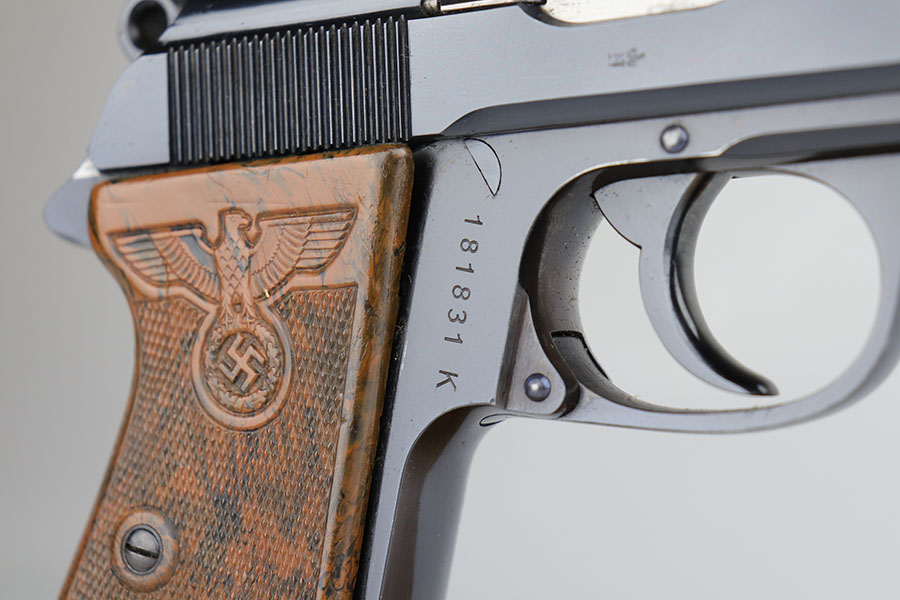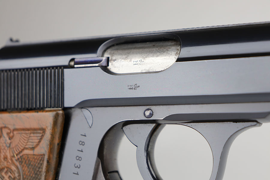 The Walther PPK with Party Leader Grips was the “Honor Weapon of the Political Leaders”. The Hoheitsabzeichen or High Insignia is the Eagle over Swastika found on either side of the grips where the Walther banner is normally located. The person entitled to wear the honor weapons that were awarded them by the Fuhrer were the Political Leaders of the national, regional and district territories, as well as leaders of local and support units. The persons who wore the honor weapon had their authorizations listed in the district personnel offices, and had to have in their possession a weapons permit issued by the police, which was obtained through official channels. These rare pistols were estimated to number around 3,500, and are widely faked, but this one is guaranteed original.