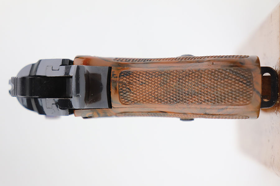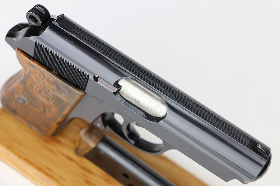 3/22/21 – This is a rare, near-mint Party Leader Walther PPK from the Nazi era. The original blue rates at about 99%, with only minor bluing loss on either side of the muzzle. The serial number on the interior of the slide is matching with the frame. The serial dates it to 1938, and is in the correct range for the issuance of the Party Leader “Honor” Grip. The grip is in excellent condition with a nice color swirl. It has no major defects – guaranteed original. It has very slight warping in the corners but this is extremely common for PPK grips. Minty bore. Excellent finger extension magazine, also without cracks or chips.