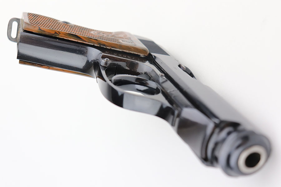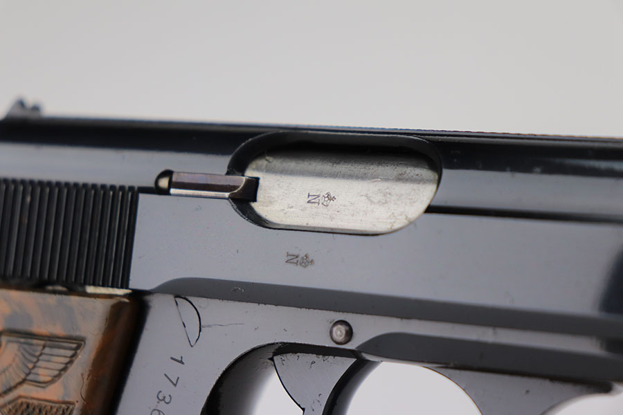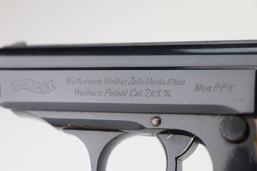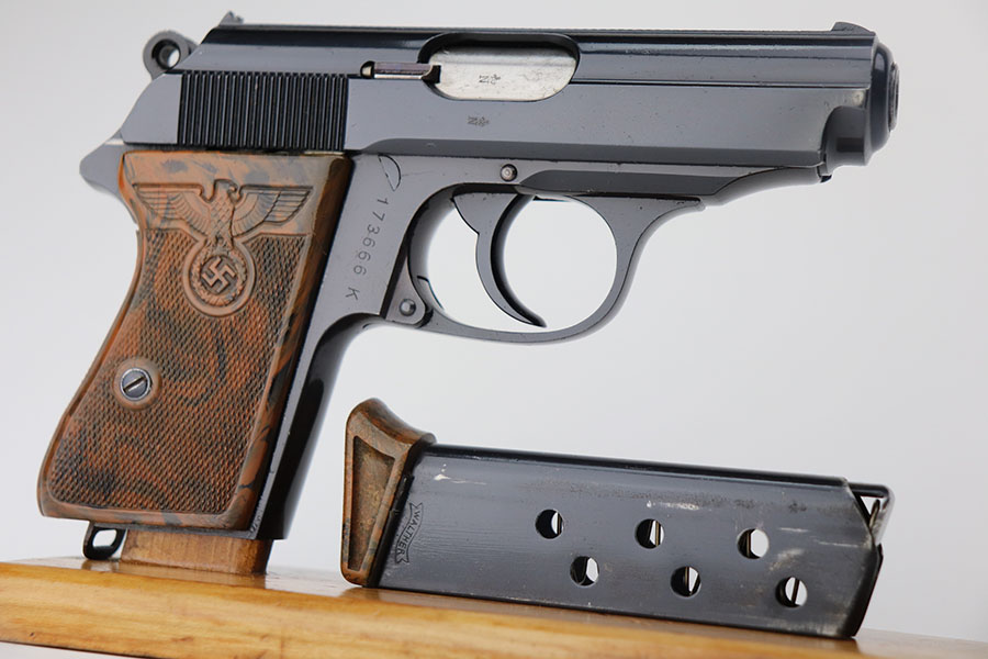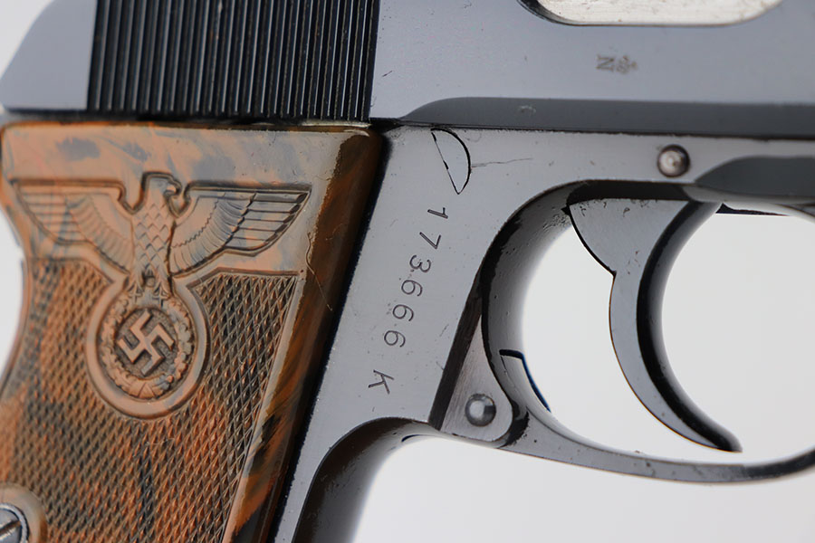 The Walther PPK with Party Leader Grips was the “Honor Weapon of the Political Leaders”. The Hoheitsabzeichen or High Insignia is the Eagle over Swastika found on either side of the grips where the Walther banner is normally located. The person entitled to wear the honor weapons that were awarded them by the Fuhrer were the Political Leaders of the national, regional and district territories, as well as leaders of local and support units. The persons who wore the honor weapon had their authorizations listed in the district personnel offices, and had to have in their possession a weapons permit issued by the police, which was obtained through official channels. These rare pistols were estimated to number around 3,500, and are widely faked, but this one is guaranteed original.