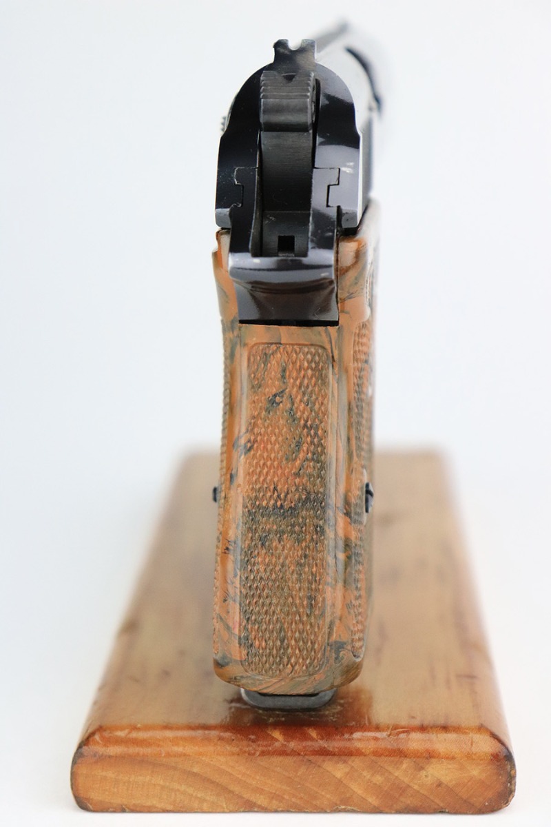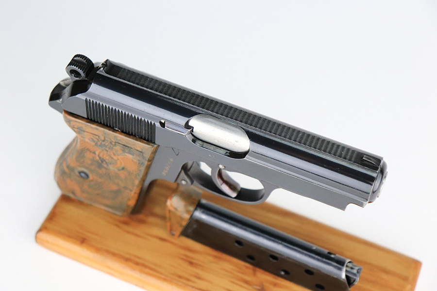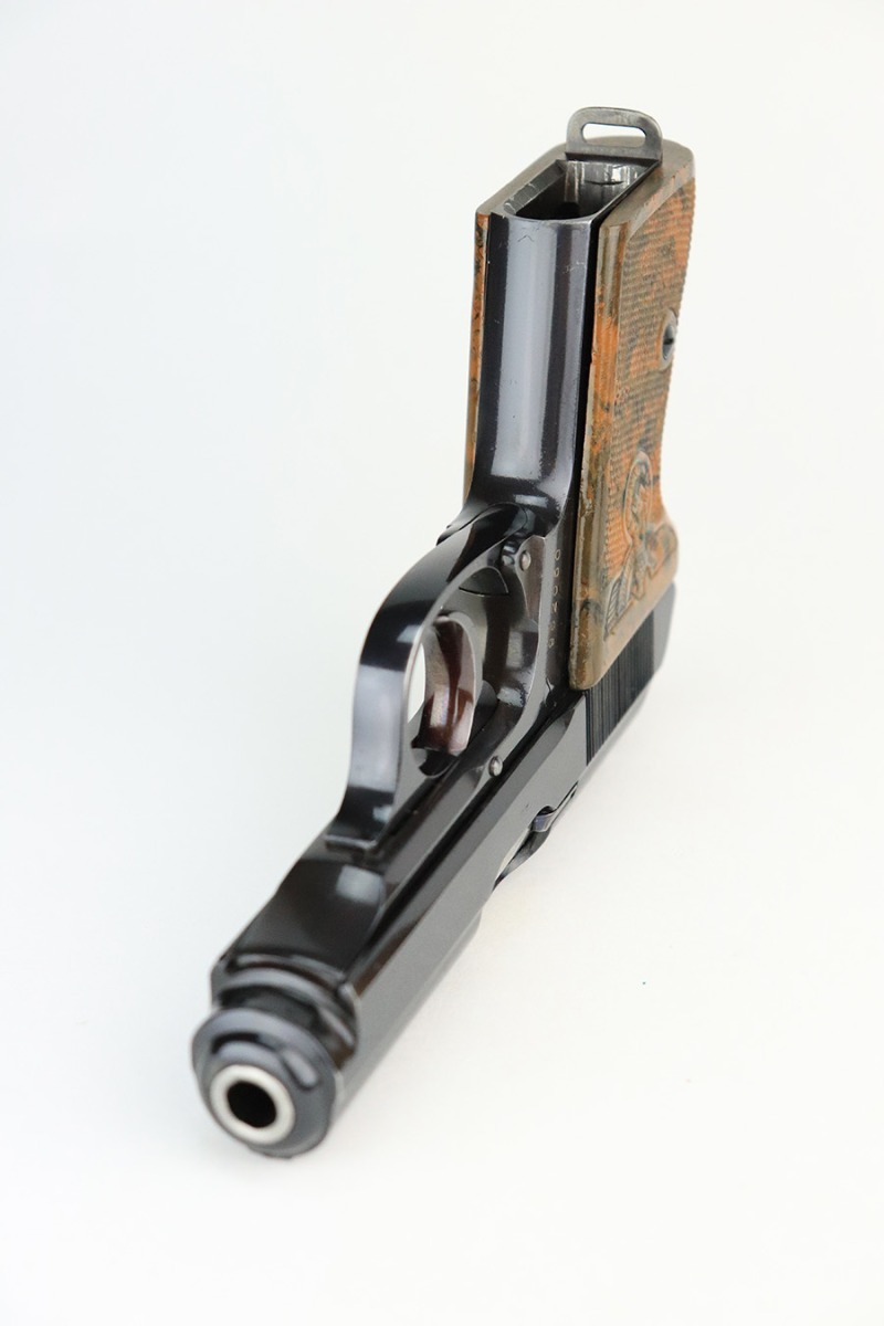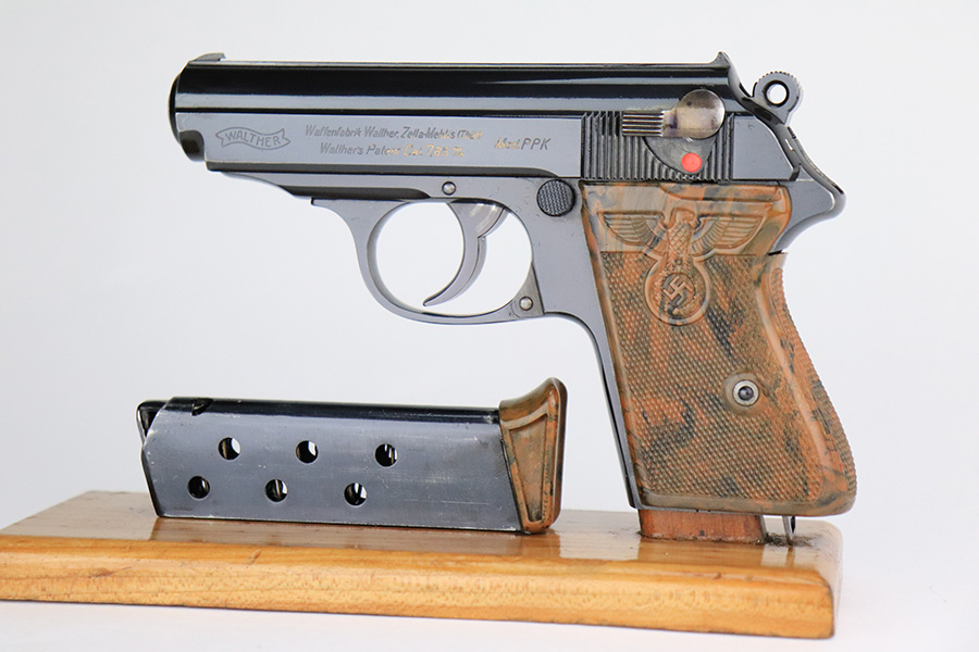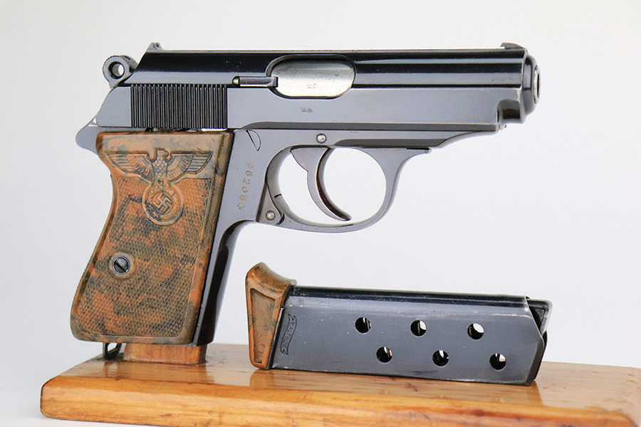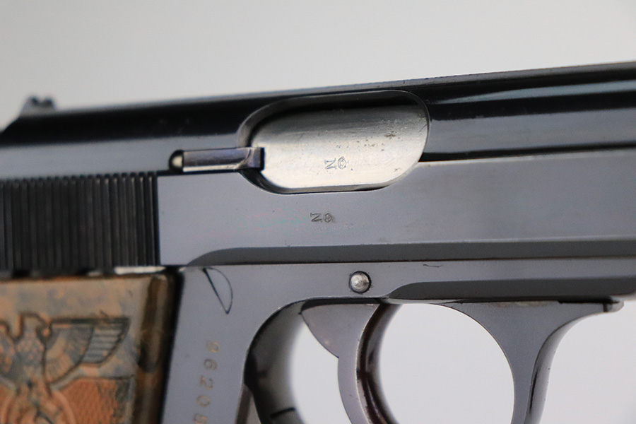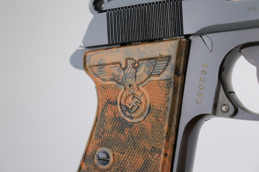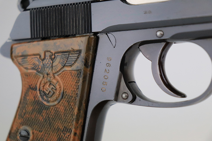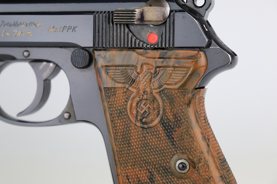 7/25/23 – This is is a stunning example of a rare Nazi Party Leader Walther PPK. It is all matching and has retained about 99% of its original high polish bluing with just a hint of wear around the muzzle. The Party Leader grip is minty with no chips or cracks – just a few very tiny handling marks here and there. Comes with a period-correct brown finger extension magazine. The bore is mint. The serial number dates the gun to 1937, which is not in the most commonly accepted serial range of a 1938-39 manufactured pistol. The pistol and grip are independently 100% original, but we can’t say with any certainty that this pistol was ordered with this grip on it in 1937. The Walther PPK with Party Leader Grips was the “Honor Weapon of the Political Leaders”. The Hoheitsabzeichen or High Insignia is the Eagle over Swastika found on either side of the grips where the Walther banner is normally located. The person entitled to wear the honor weapons that were awarded them by the Fuhrer were the Political Leaders of the national, regional and district territories, as well as leaders of local and support units. The persons who wore the honor weapon had their authorizations listed in the district personnel offices, and had to have in their possession a weapons permit issued by the police, which was obtained through official channels. These rare pistols were estimated to number around 3,500.