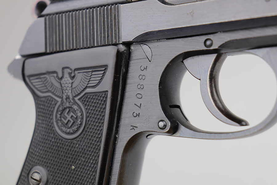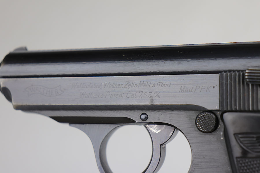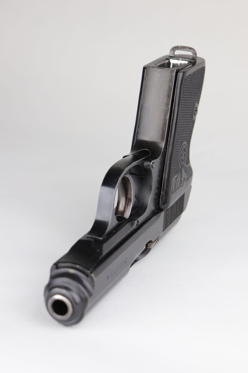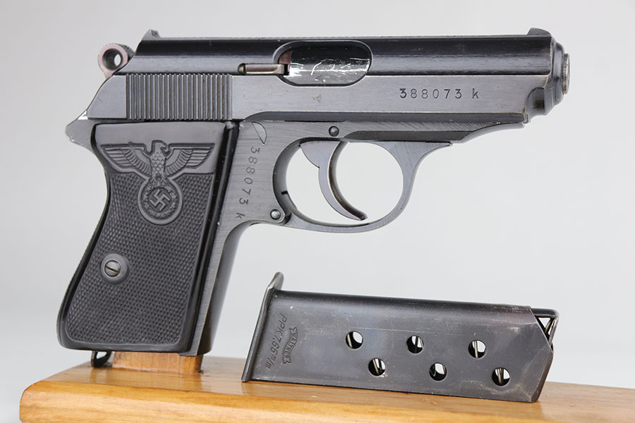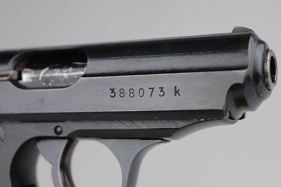 5/19/20 – This is a rare Party Leader Walther PPK with black grip, in pristine condition. We observe far less of the black grips than the brown, but research on the black grips is also less extensive and there is some debate over whether they were ever made by the Walther factory. This particular example has a duraluminum frame, and was made in 1942-43. The finish rates at 98-99% with a hint of muzzle wear and a hint of thinning on the front strap. The grip has the proper metal insert and no cracks or defects. Mint bore.
