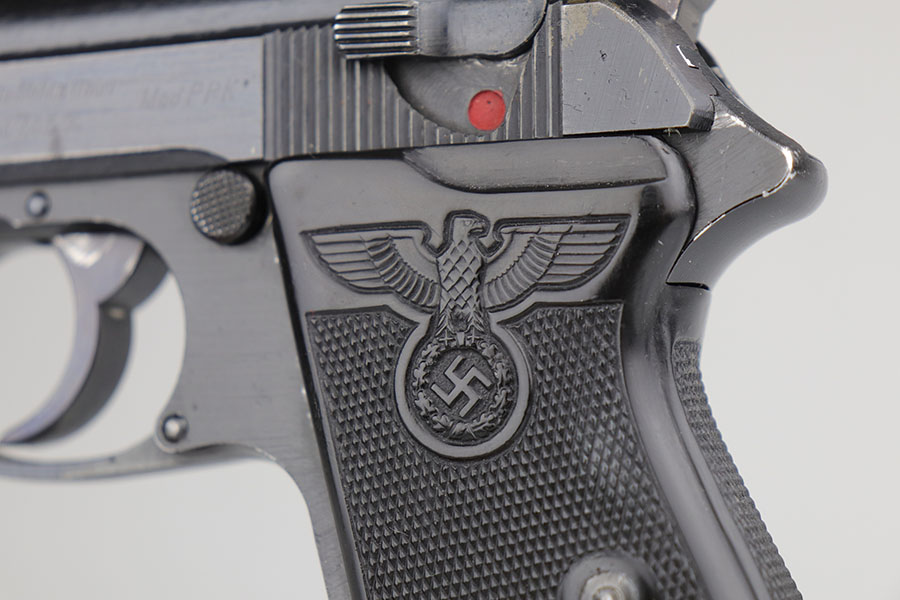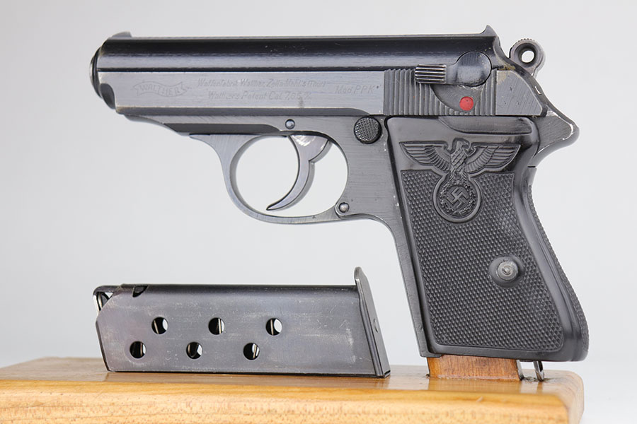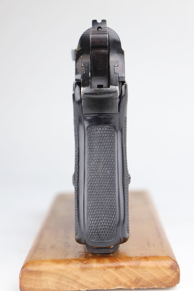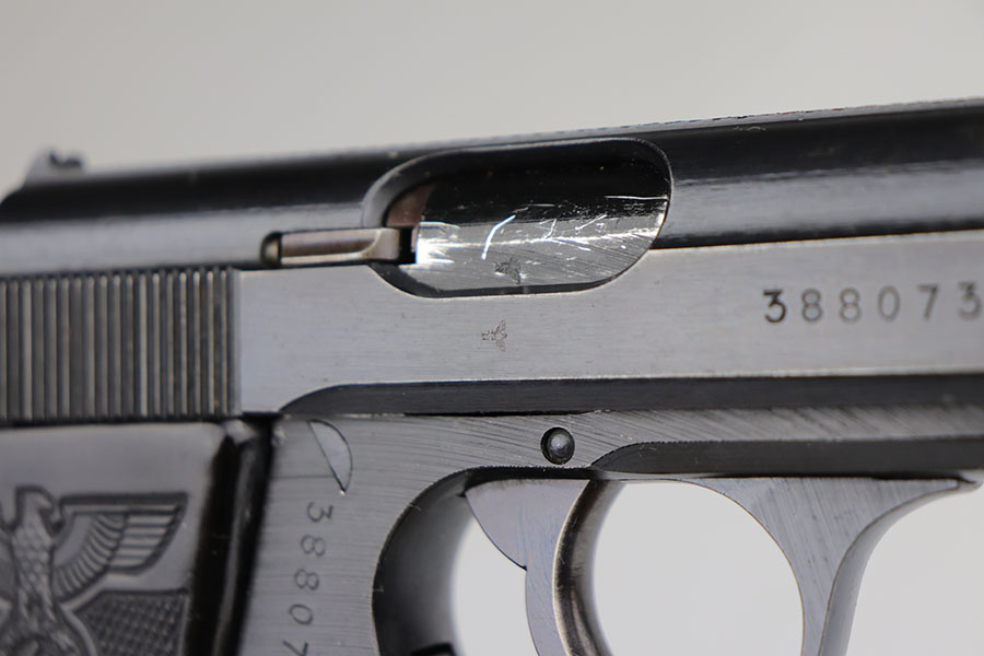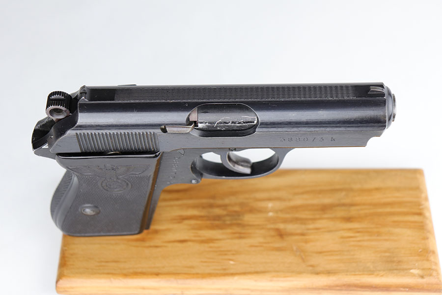 5/19/20 – This is a rare Party Leader Walther PPK with black grip, in pristine condition. We observe far less of the black grips than the brown, but research on the black grips is also less extensive and there is some debate over whether they were ever made by the Walther factory. This particular example has a duraluminum frame, and was made in 1942-43. The finish rates at 98-99% with a hint of muzzle wear and a hint of thinning on the front strap. The grip has the proper metal insert and no cracks or defects. Mint bore.
