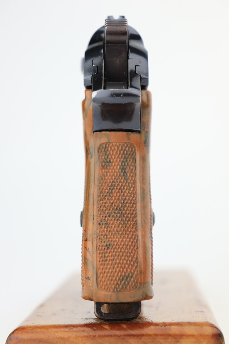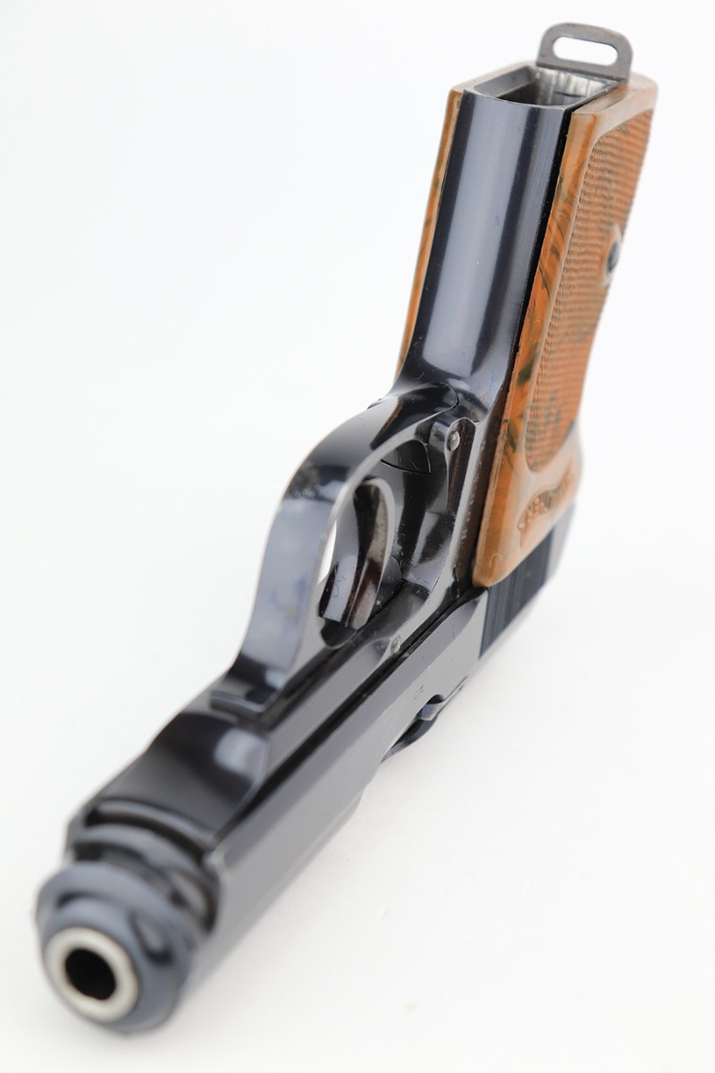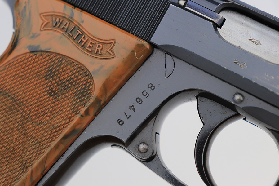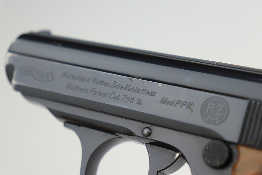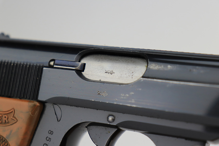 3/30/23 – This is an original and correct RZM marked Walther PPK from 1935 in minty condition. The RZM (Reichs Zeug Meisterei) was the equipment office of the NSDAP and was established to contract for equipment. These pistols were commonly thought to be issued to the German political leaders of the time. This one is all matching and is especially rare because it has a later 60-degree safety. Most had the earlier 90-degree safety. It has retained about 98% of its original finish. There is very minor muzzle wear and a few small dots of discoloration with tiny pits on both sides of the slide. Fitted with a nice brown Walther grip – no cracks or chips. Comes with a period-correct Walther banner-only finger extension magazine. Minty bore.
