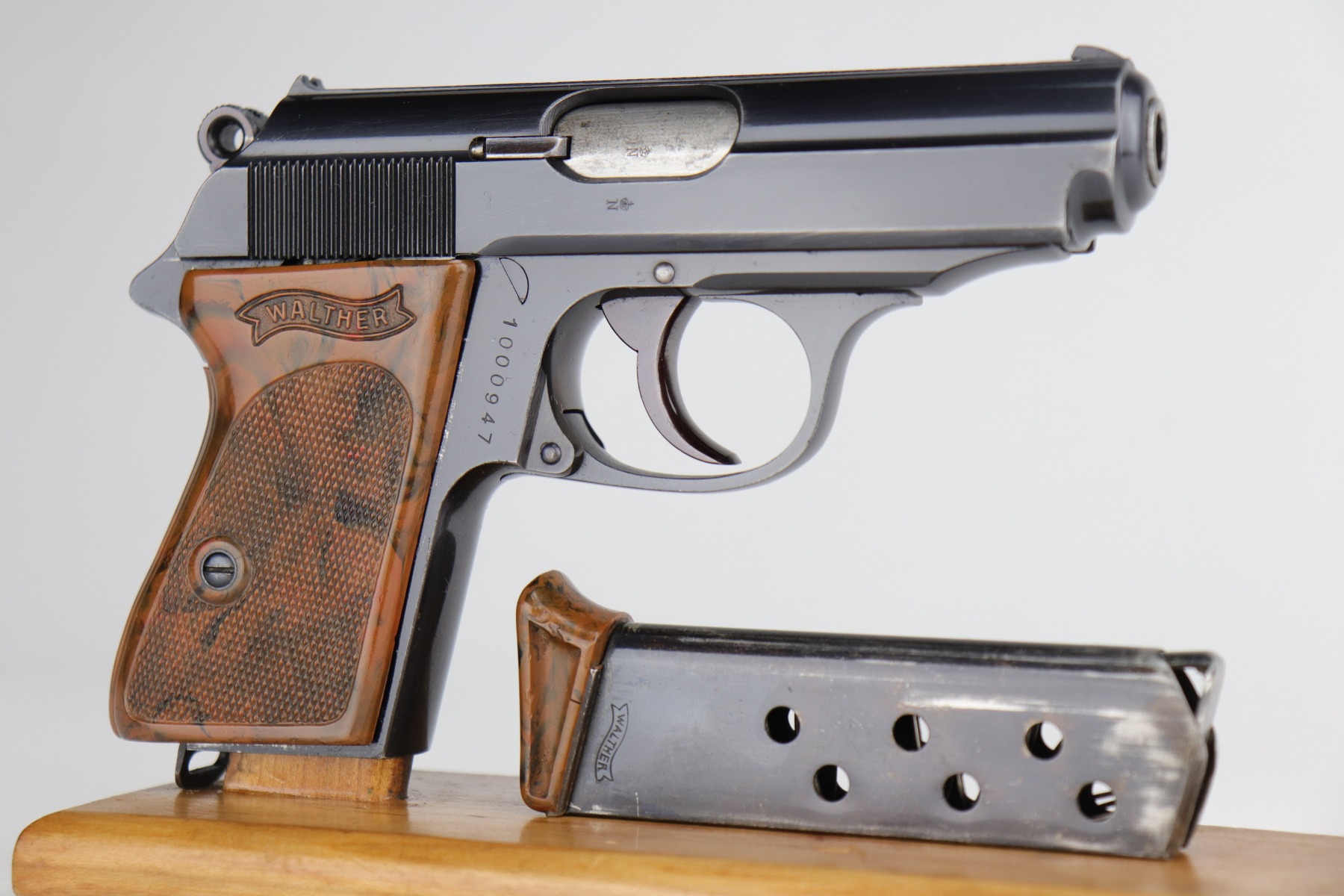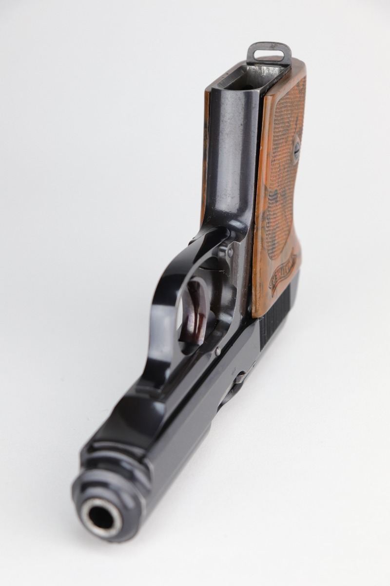 10/7/20 – This is a rare, minty example of a Nazi RZM-marked Walther PPK, manufactured in 1938. The RZM (Reichs Zeug Meisterei) was the equipment office of the NSDAP and was established to contract for equipment. These pistols were commonly thought to be issued to the German political leaders of the time. As an added bonus, this gun is in the one million serial number range! The gun is matching and in minty condition, having retained over 98% of its bluing. There is just a hint of wear on the high edges of the slide and tang. It comes with an excellent brown grip and a brown finger extension magazine. The bore is near-mint.