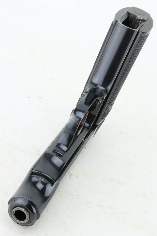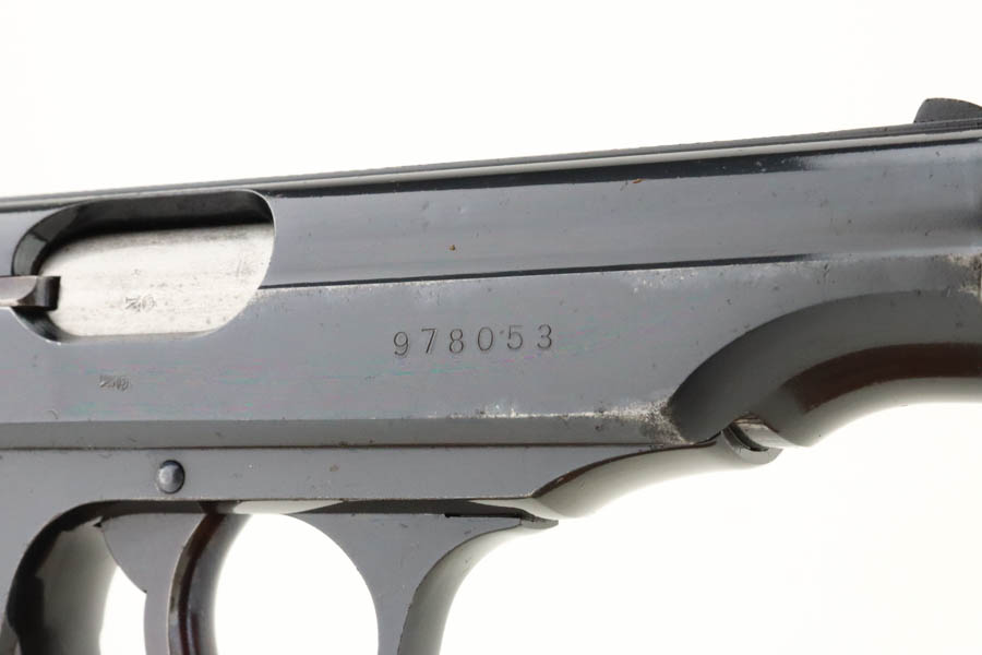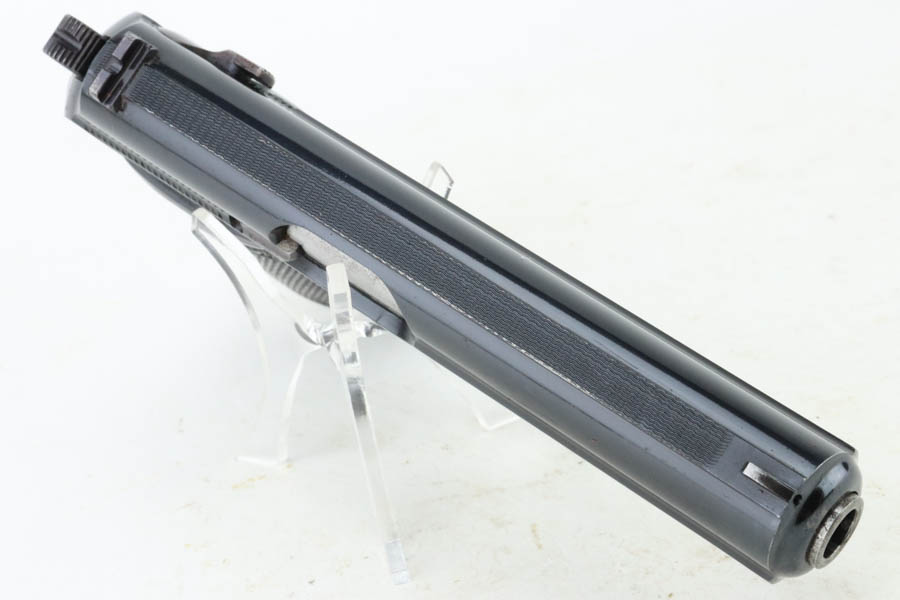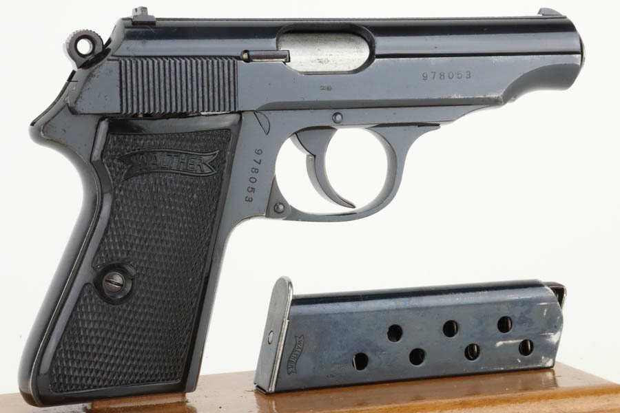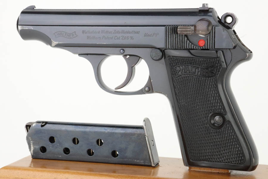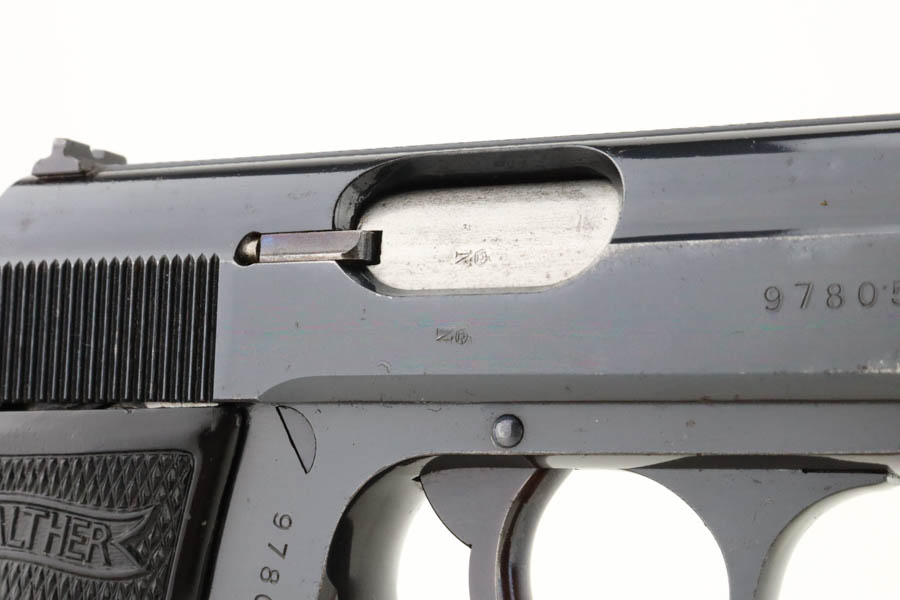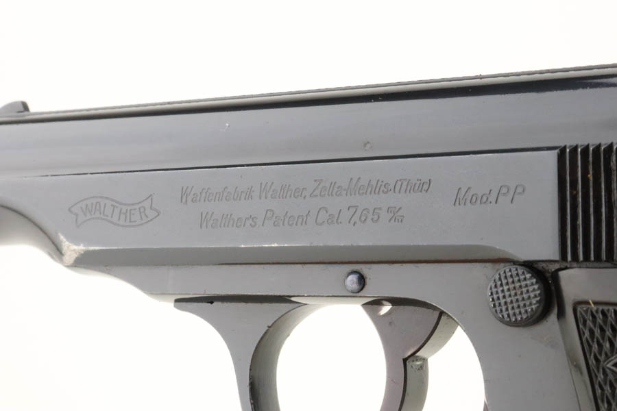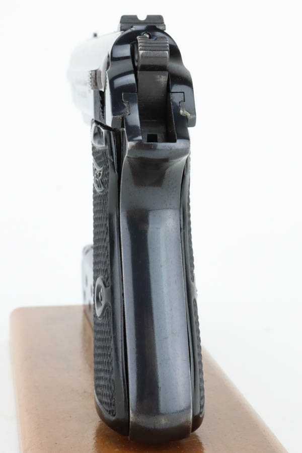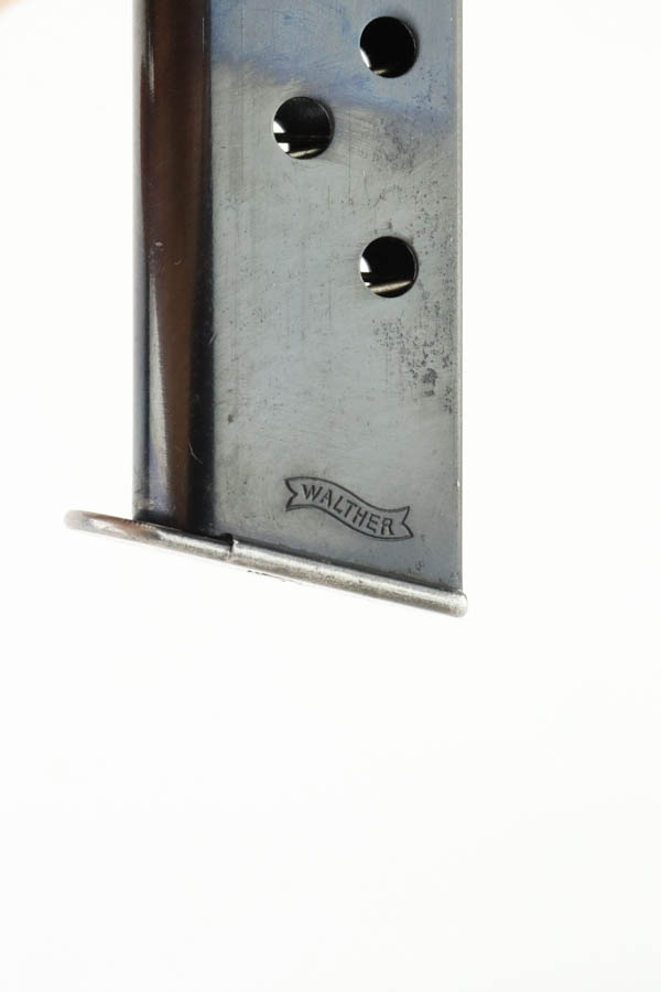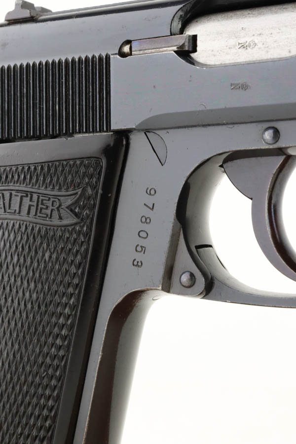 7/15/24 – This is a minty, rare Walther PP from 1937. It is in a solid serial number block of other guns issued to the SS. It comes with a magazine that is numbered and not matching, but it is very close in serial number (#978002). It has retained about 97-98% of its original high polish finish with just very minor muzzle wear. Fitted with period-correct black bakelite grips. Mint bore. The hold-open does not work properly with this magazine.