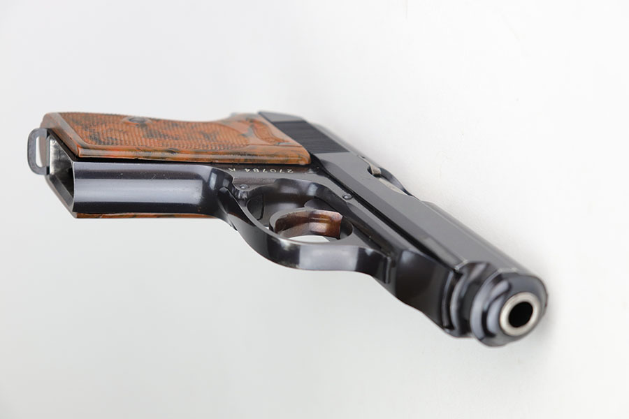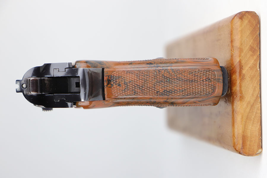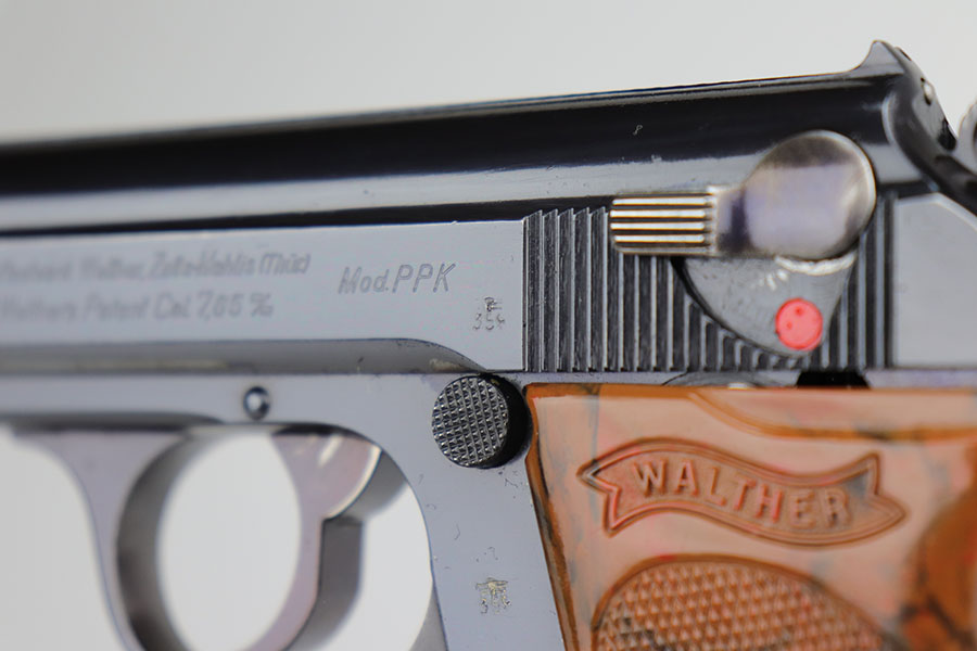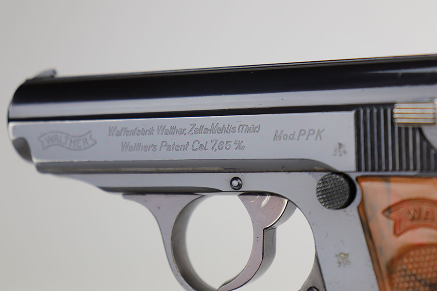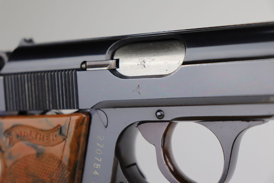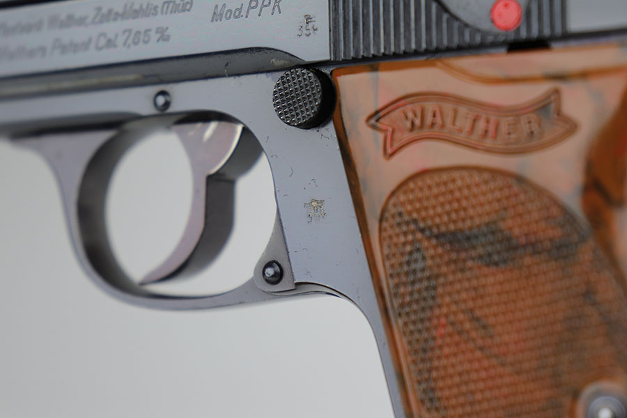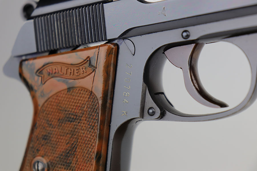 12/16/20 – This is a rare Army Walther PPK in minty, original condition. It’s the rarest variation with high-polish blue and E/359 proofs on slide and frame. There were only 3,500 of this variation produced, and this is one of the nicest we’ve offered. The blue rates at 98% with just a bit of muzzle wear, and a small spot of bluing loss on the trigger guard. Grip is nice aside from a thin crack on the right side. Excellent bore. Finger extension magazine with no cracks or chips.