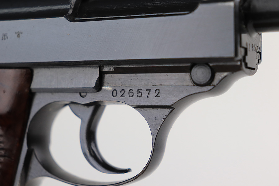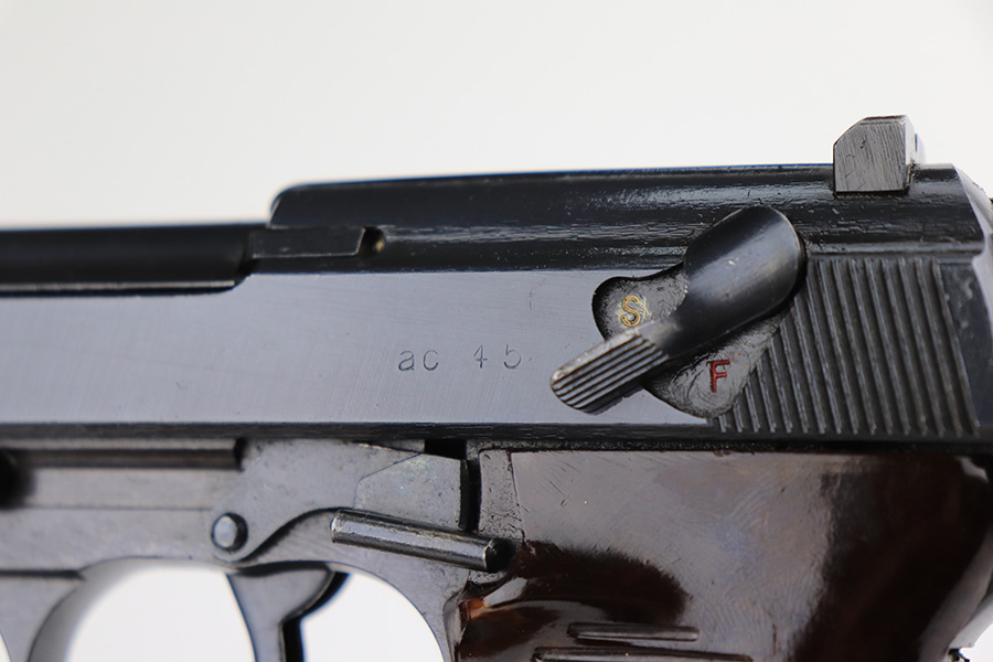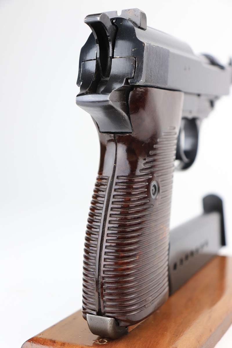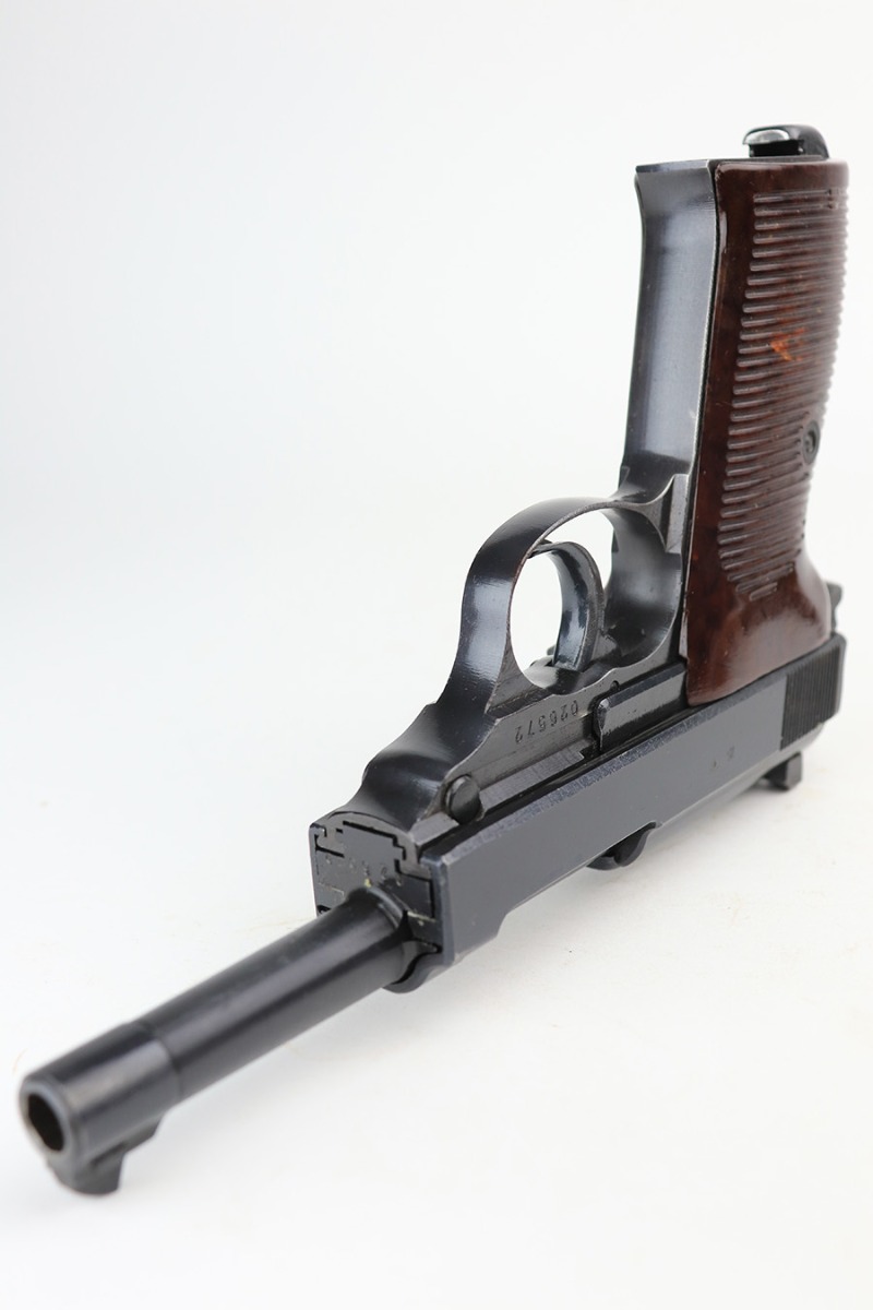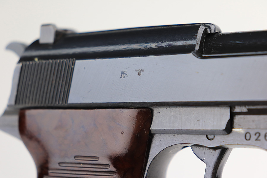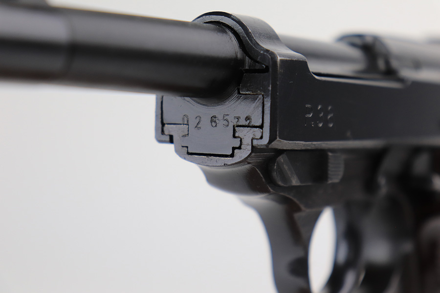 2/28/23 – This is an all matching and original example of a very rare Walther P.38 variation from 1945, one of only 1,800 produced. We’ve seen these referred to as zero series or zero-prefix Walther P.38s, but Krutzek’s P.38 book states this is the last Mod. HP variation. It features two inspection marks on the right side of the slide as it used ‘ac 45’ slides but serializing continued from where Mod. HP production ended. The zero was added to distinguish from the commercial production that preceded it. The pistol is in excellent condition, with about 98% of the original blue remaining. Just a tiny bit of handling wear on the front strap. Bore has strong rifling but a little frost in the grooves. Minty grips.