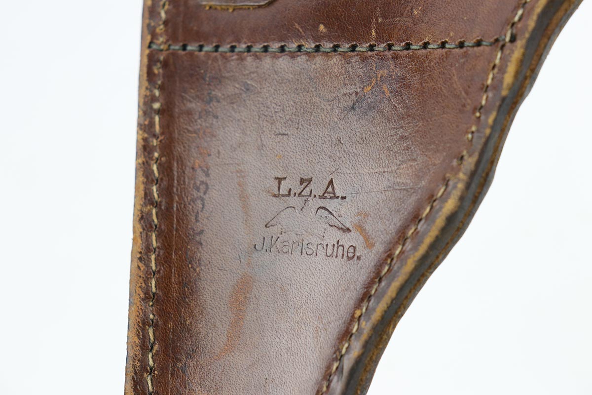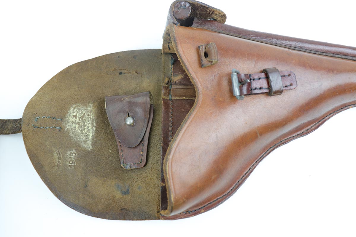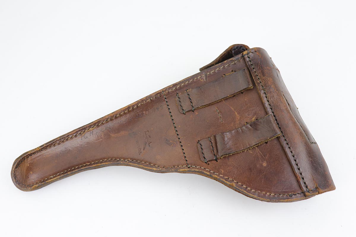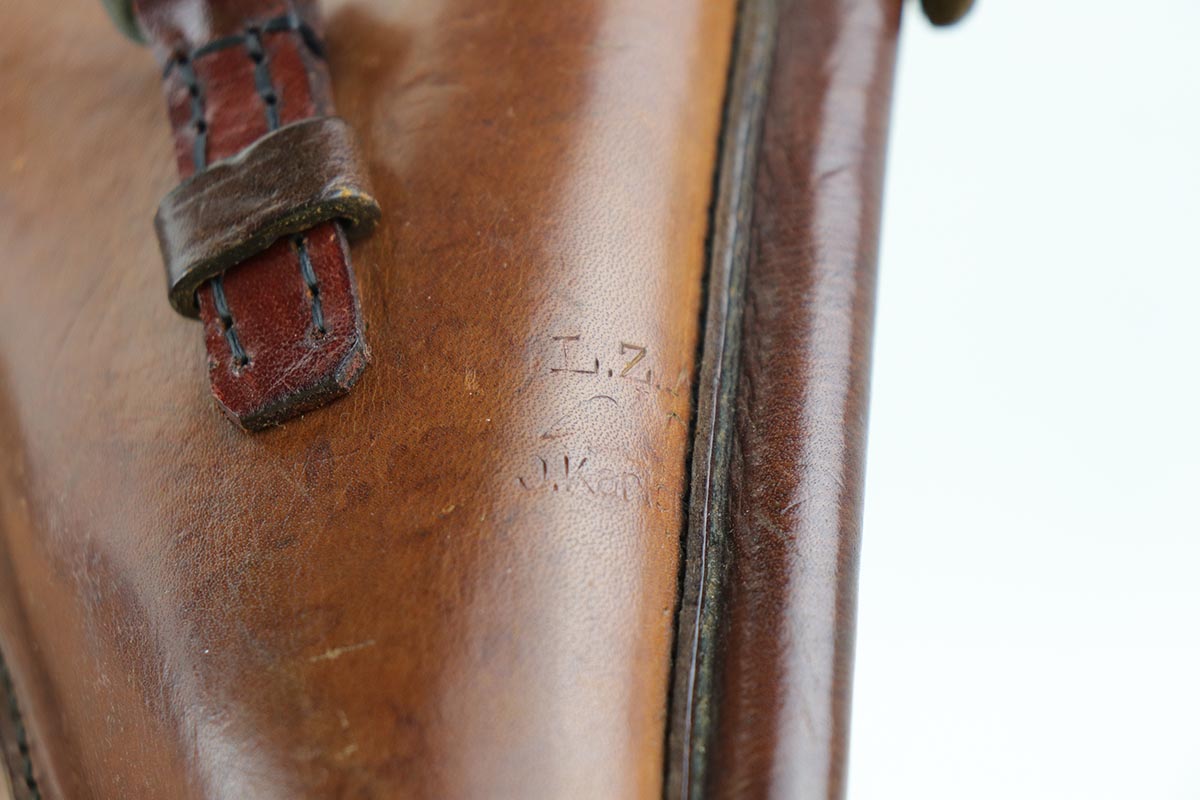 3/5/20 – This is a very nice example of a super rare Luger holster – the M1914 Navy. An example can be seen on page 140 of Still’s Central Powers Pistols, but the holster is all correct and original with 1918 manufacture date. It is marked ‘LZA’ over ‘J. Karlsruhe’ on the back, front and inside the flap. The holster is in great shape aside from a small hall in the top of the front flap, and a previous owner has lightly scratched in their name and social into the back of the holster.