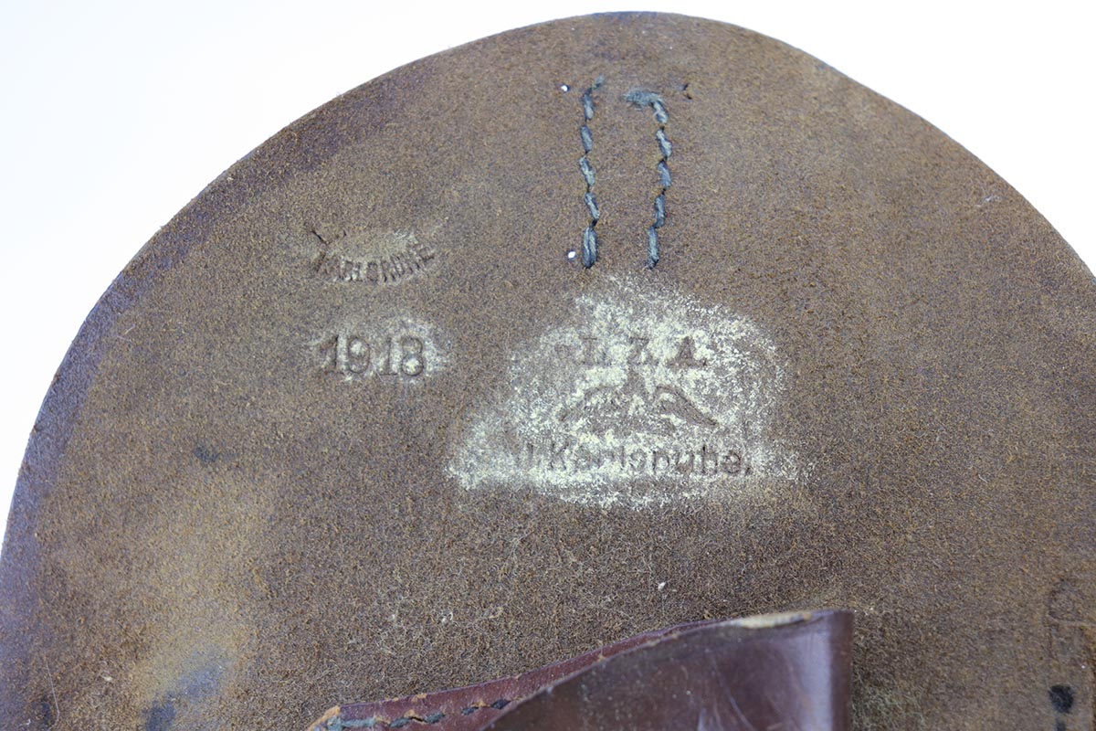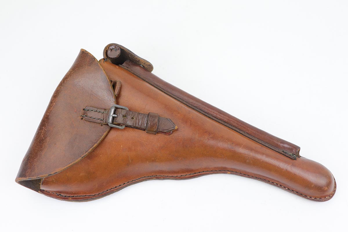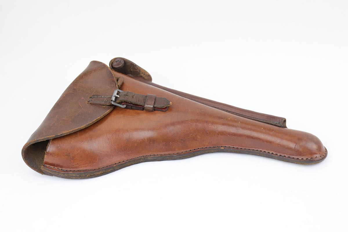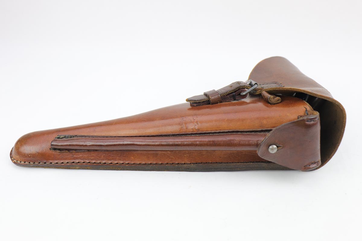 3/5/20 – This is a very nice example of a super rare Luger holster – the M1914 Navy. An example can be seen on page 140 of Still’s Central Powers Pistols, but the holster is all correct and original with 1918 manufacture date. It is marked ‘LZA’ over ‘J. Karlsruhe’ on the back, front and inside the flap. The holster is in great shape aside from a small hall in the top of the front flap, and a previous owner has lightly scratched in their name and social into the back of the holster.