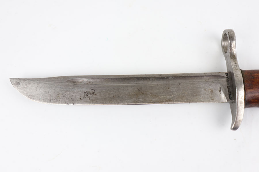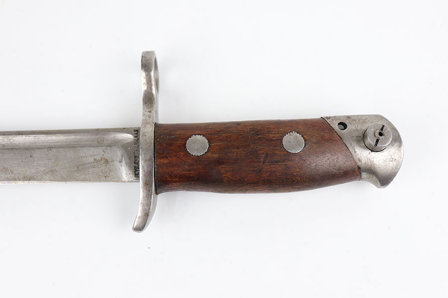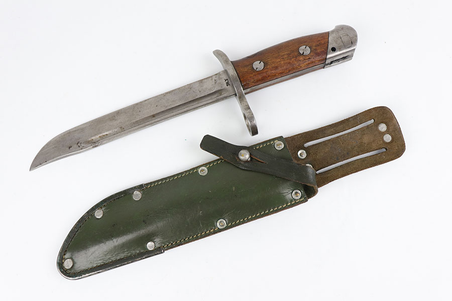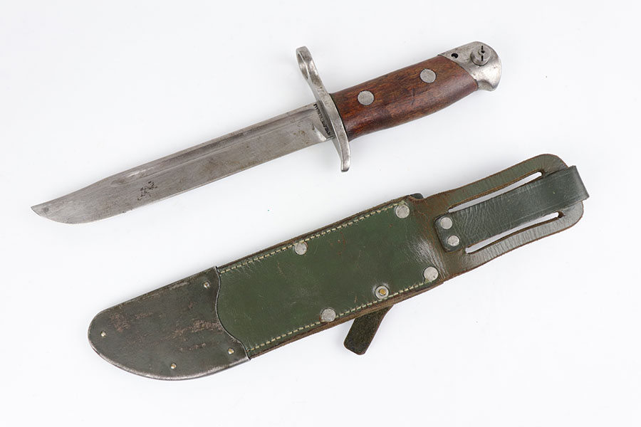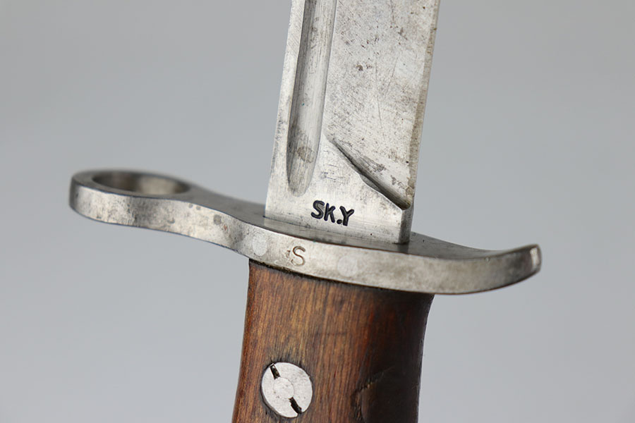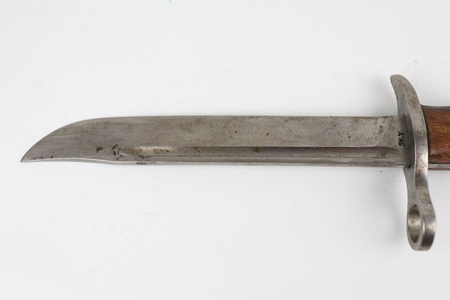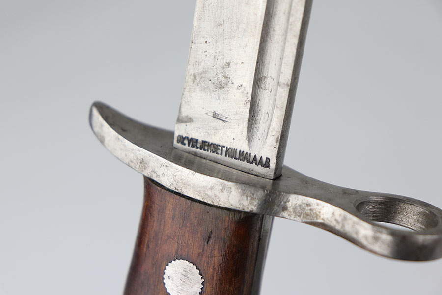 6/24/20 – This is a nice example of a very rare M39 bayonet and scabbard, one of only a few thousand made. It is maker marked O.Y.Veljekset Kulmalaab and both the blade and scabbard are marked Sk.Y, which indicates it’s part of the contract for the Finnish Civil Guard. The blade shows some age and use but no major condition issues. Handle has a ding or two but similar condition. The scabbard is in great condition with a couple spots of discoloration but leather is firm.