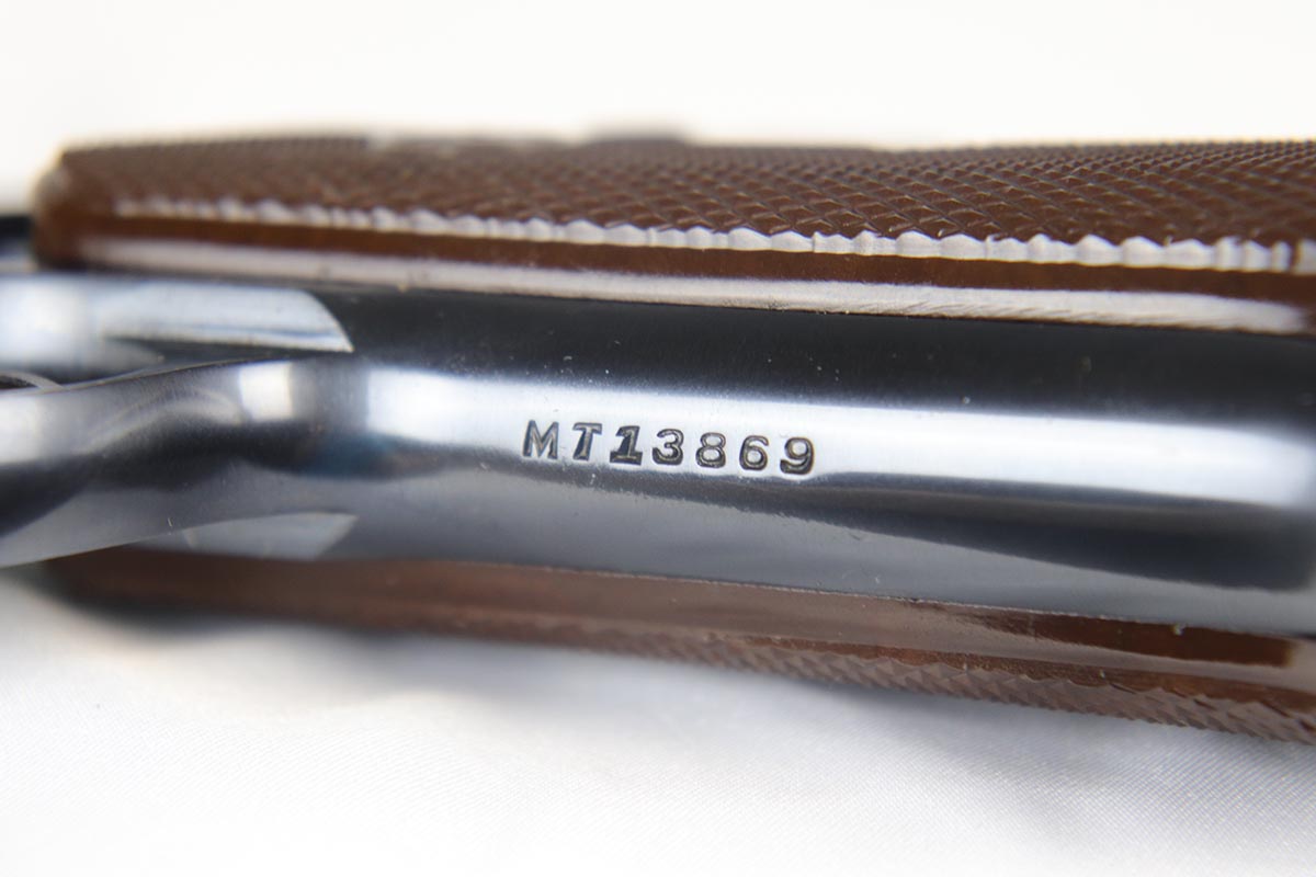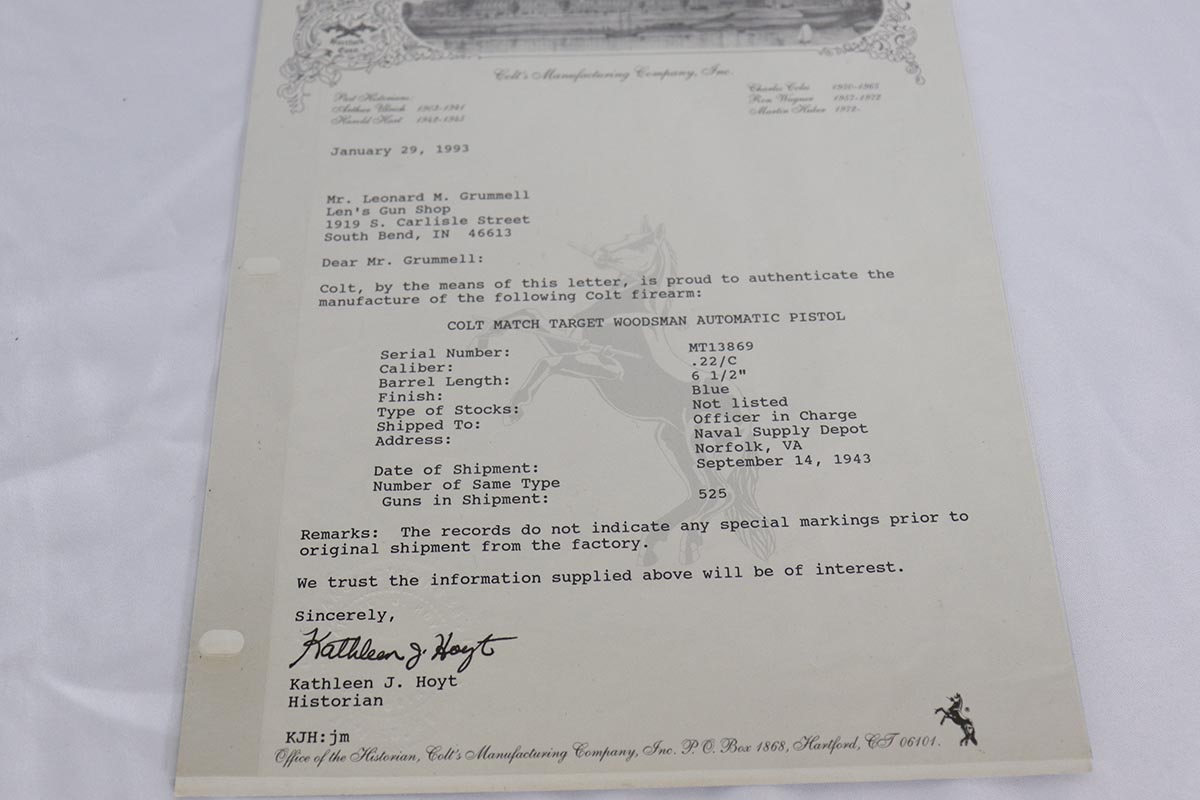 6/13/18 – This is a rare and excellent Colt Woodsman Match Target pistol that was shipped to the US Navy in Norfolk, VA.  This pistol is especially rare as it is military marked, as well as being Navy issued.  This pistol is about as nice as they come, with 96-98% high-polish blue remaining.  It would be a nearly mint gun if not for a lone area of rub wear on the high edge of the rear left side slide.  This pistol comes with a Colt factory letter verifying the Navy shipment.  Minty bore and excellent grips.