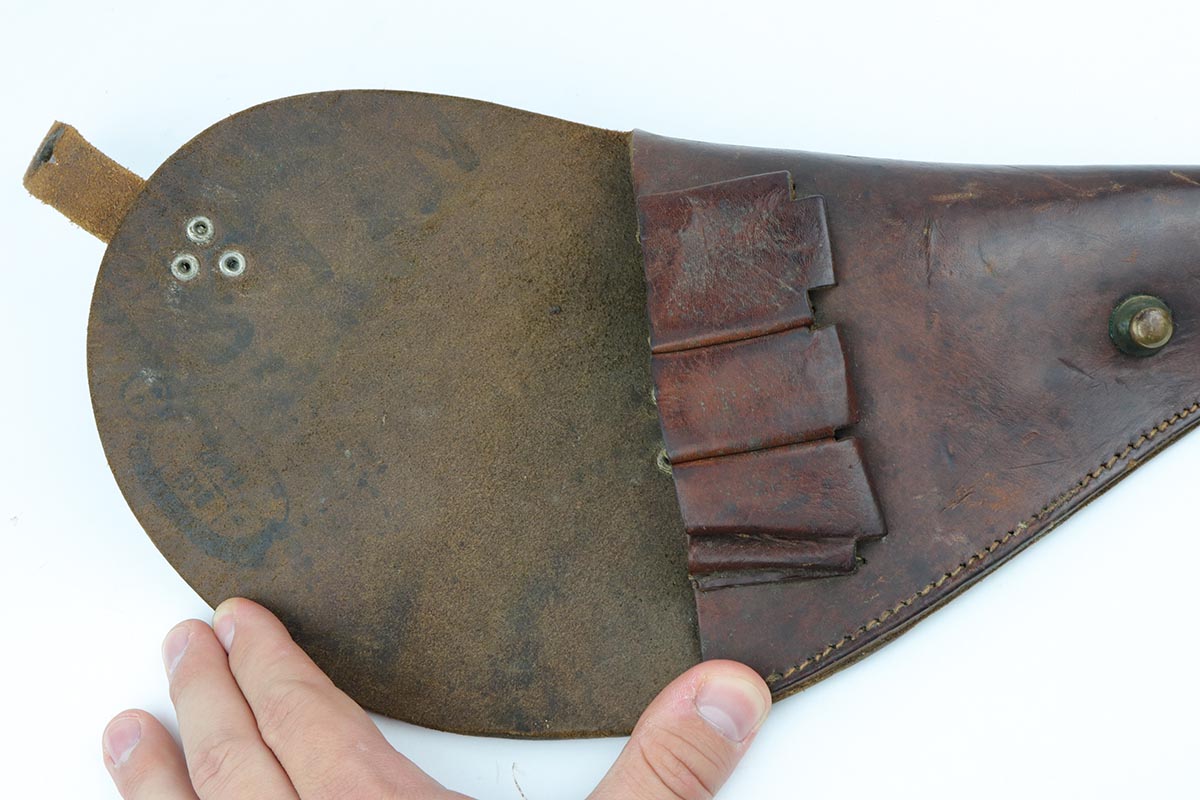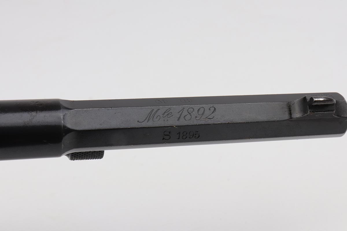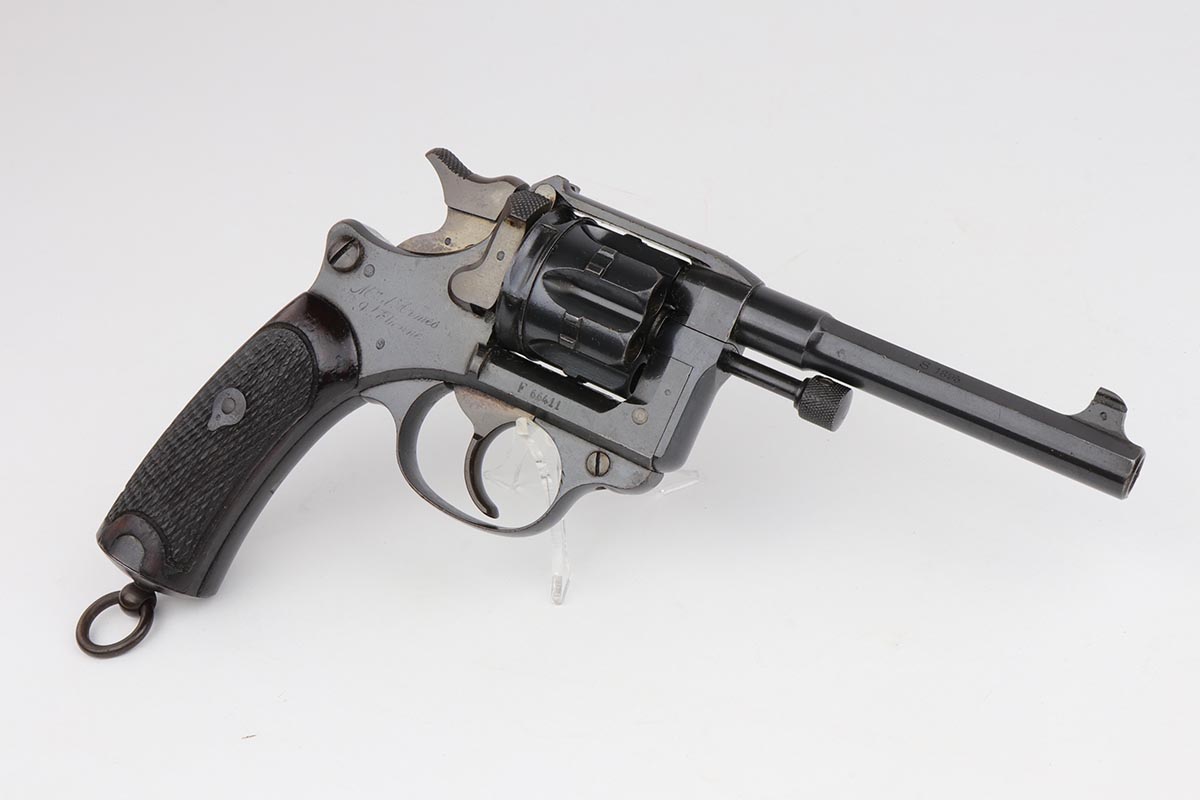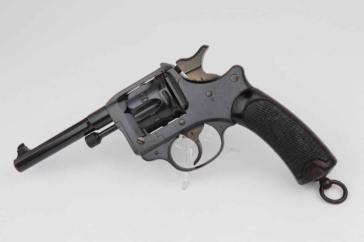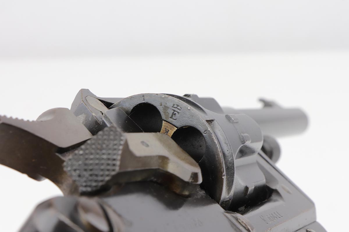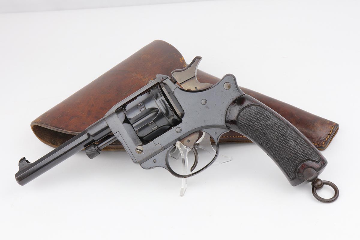 7/30/19 – This is a great example of a very early production Naval French M1892 revolver, made in 1895. The gun is all original with nearly all of its bluing remaining, with just a hint of edge wear and a few tiny freckles here and there – as per pictures. There is also some browning to the finish throughout. The straw on the small parts is still very strong. There is no pitting evident anywhere. The gun is marked S 1895 for the year of production. All the parts match. The grips are in very good condition. Minty bore. The butt is marked with a Naval anchor, denoting issuance to the French Navy. Original holster is in great shape with no defects and a couple of illegible ink stamps inside the lid. Navy marked French M1892 revolvers are extremely scarce and this is the first such example we’ve come across. Antique, so no FFL is required for purchase, unless prohibited by your local laws.