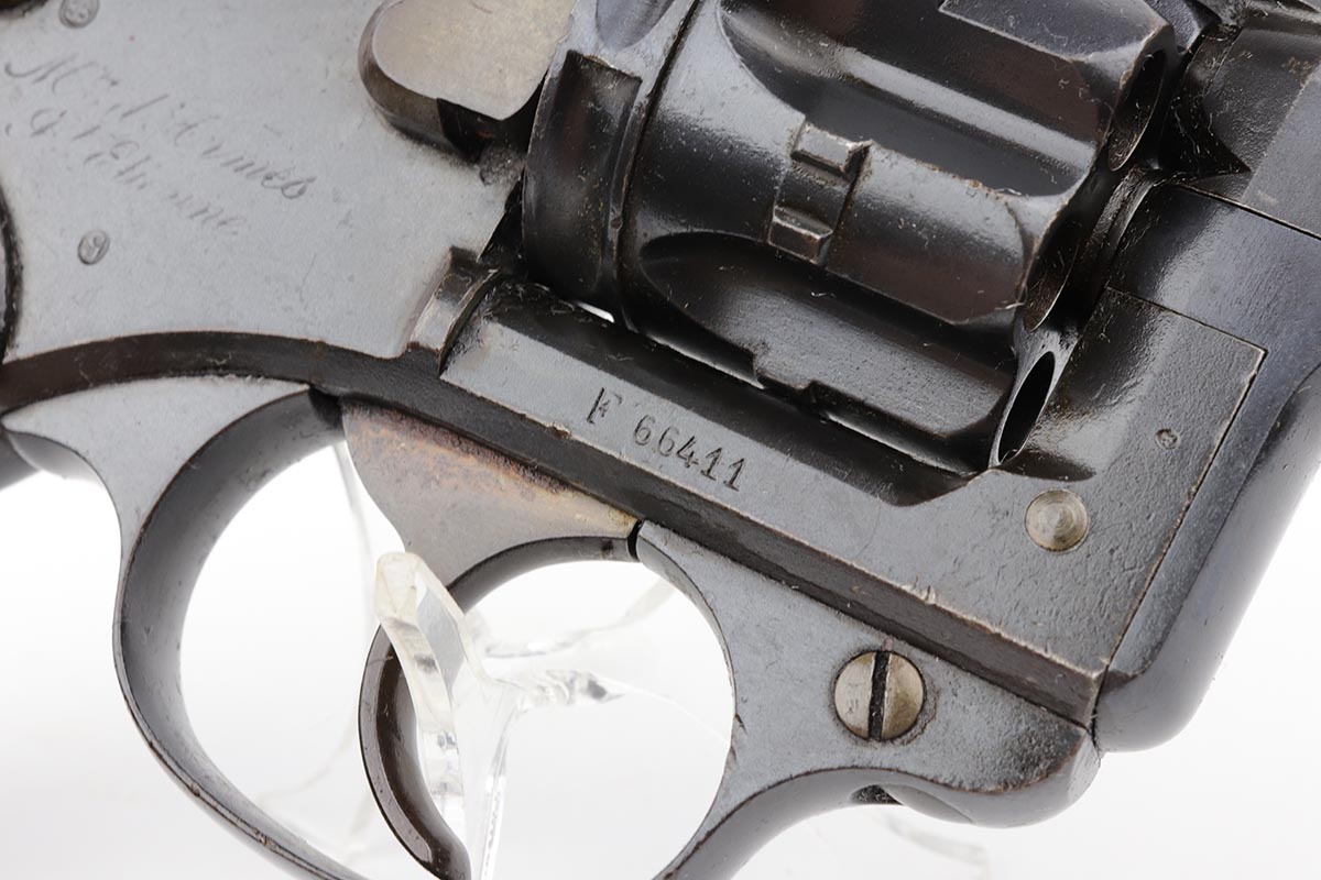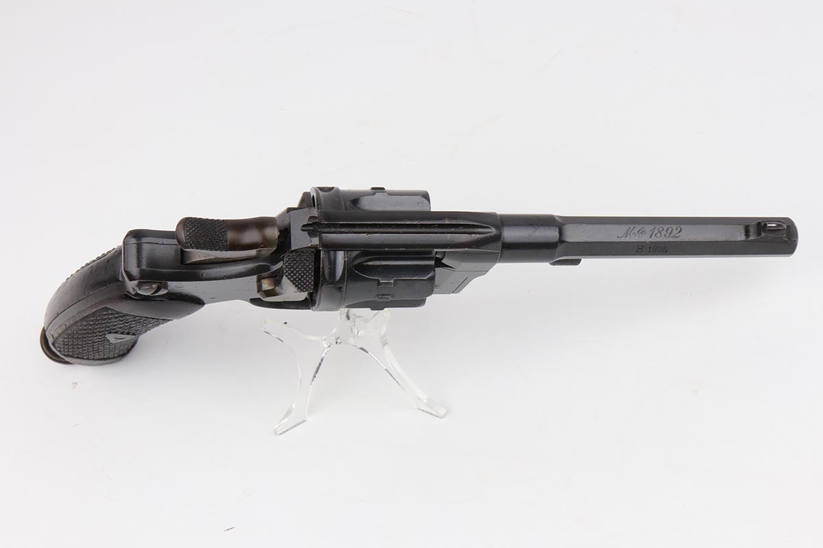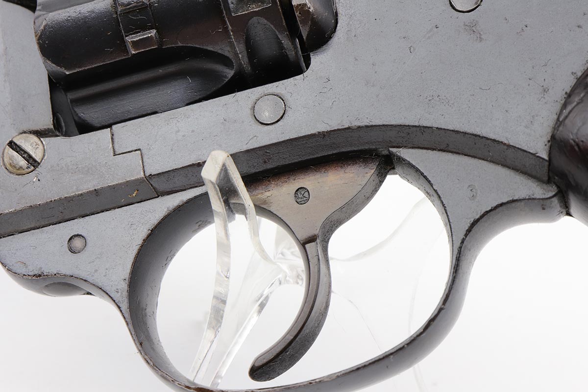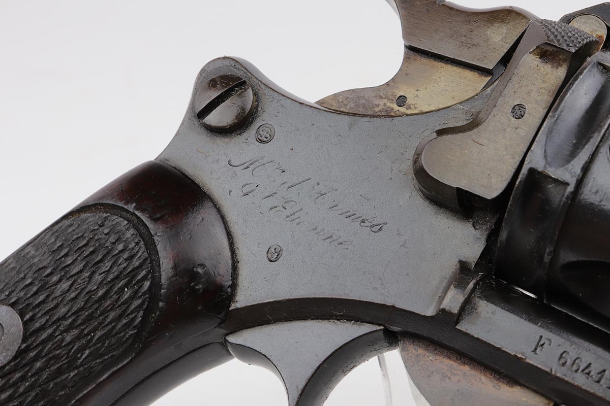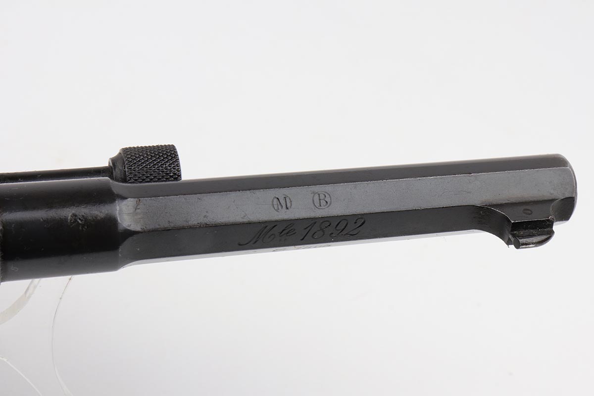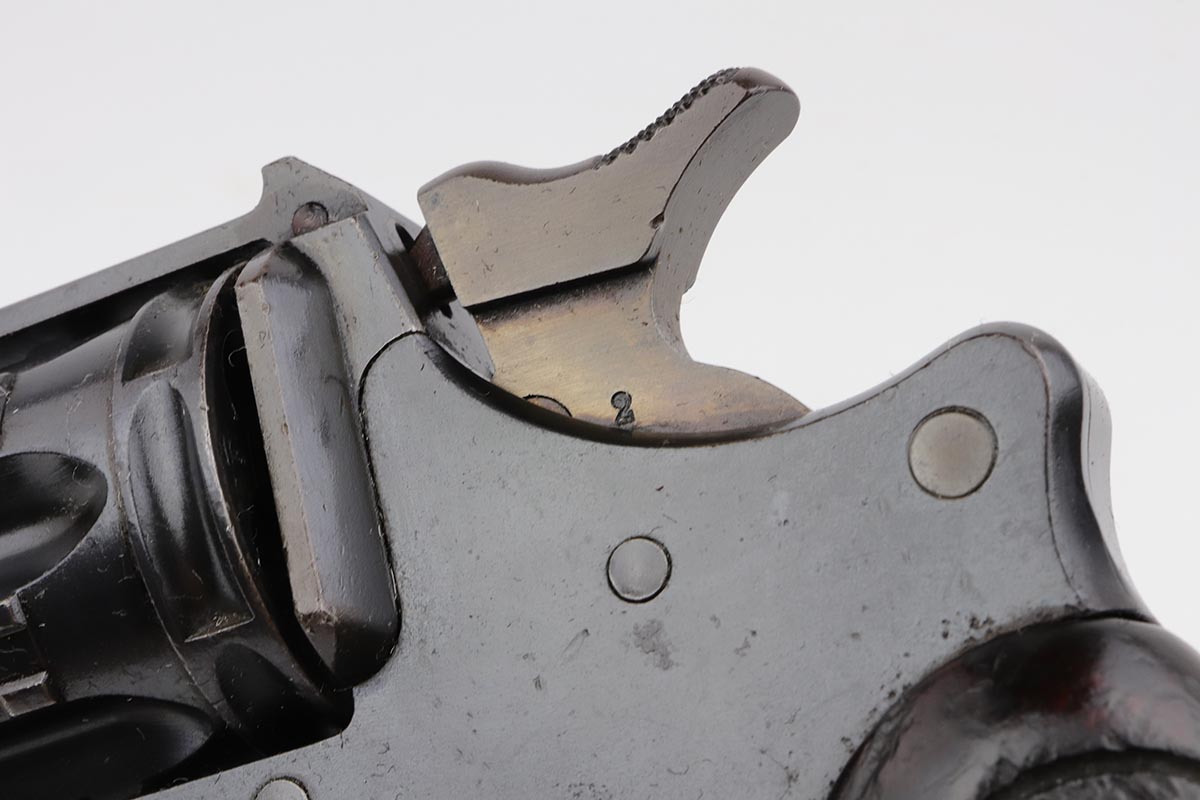 7/30/19 – This is a great example of a very early production Naval French M1892 revolver, made in 1895. The gun is all original with nearly all of its bluing remaining, with just a hint of edge wear and a few tiny freckles here and there – as per pictures. There is also some browning to the finish throughout. The straw on the small parts is still very strong. There is no pitting evident anywhere. The gun is marked S 1895 for the year of production. All the parts match. The grips are in very good condition. Minty bore. The butt is marked with a Naval anchor, denoting issuance to the French Navy. Original holster is in great shape with no defects and a couple of illegible ink stamps inside the lid. Navy marked French M1892 revolvers are extremely scarce and this is the first such example we’ve come across. Antique, so no FFL is required for purchase, unless prohibited by your local laws.