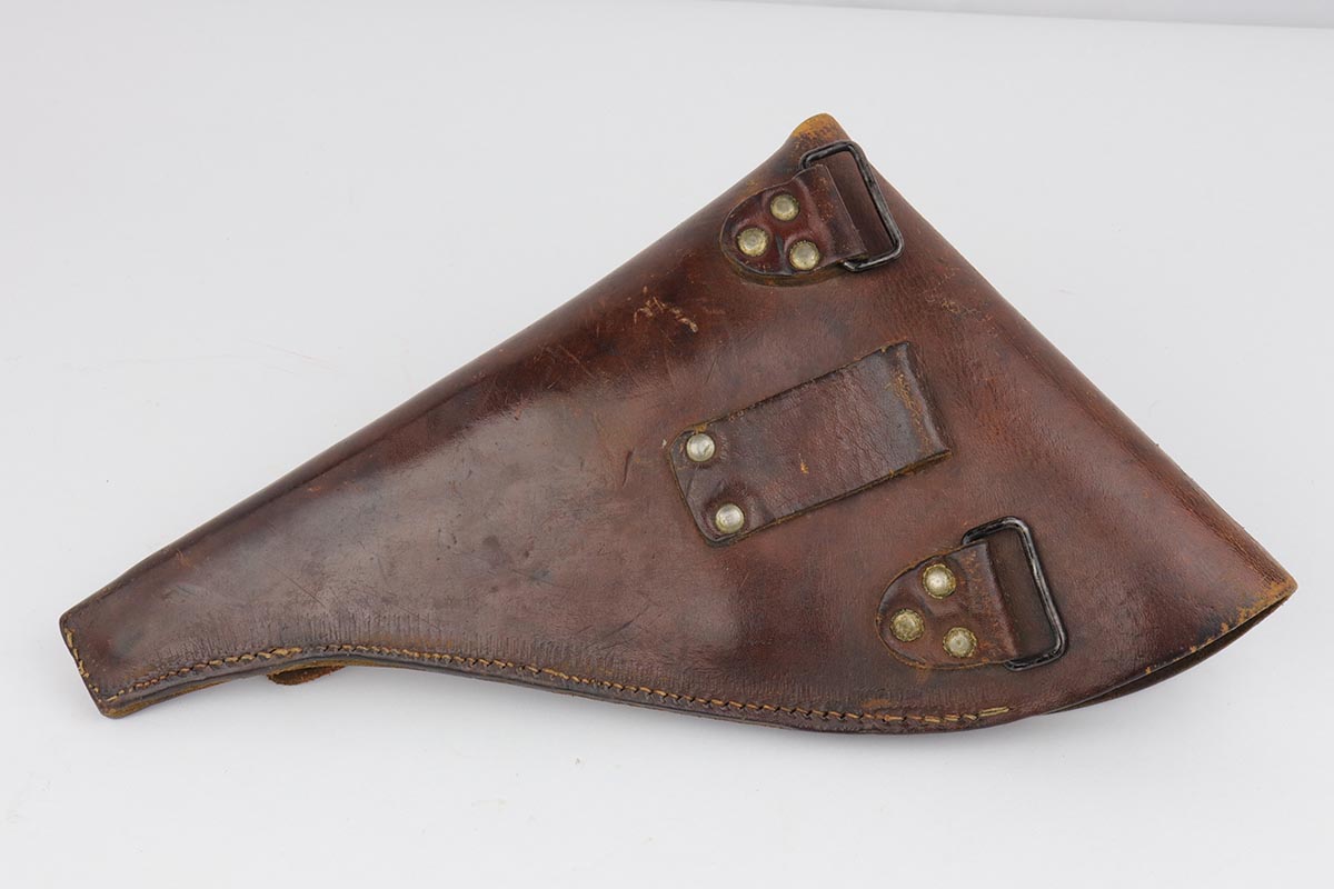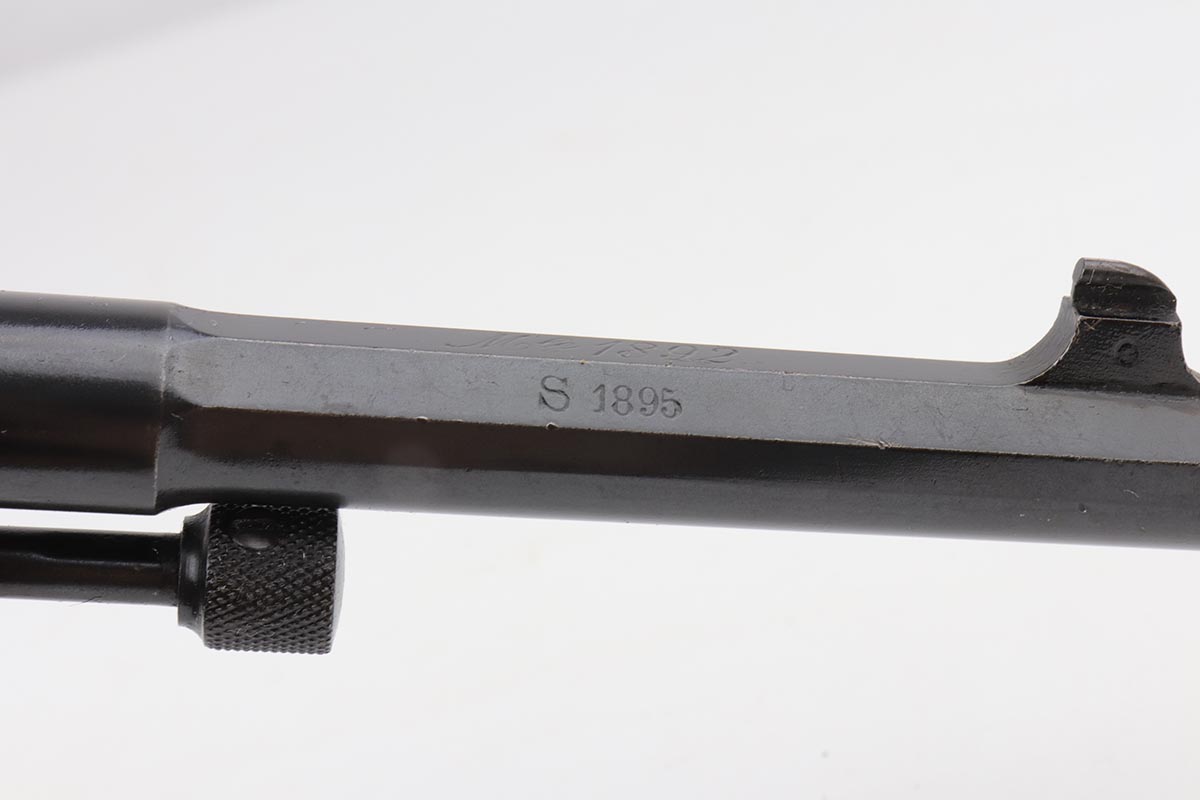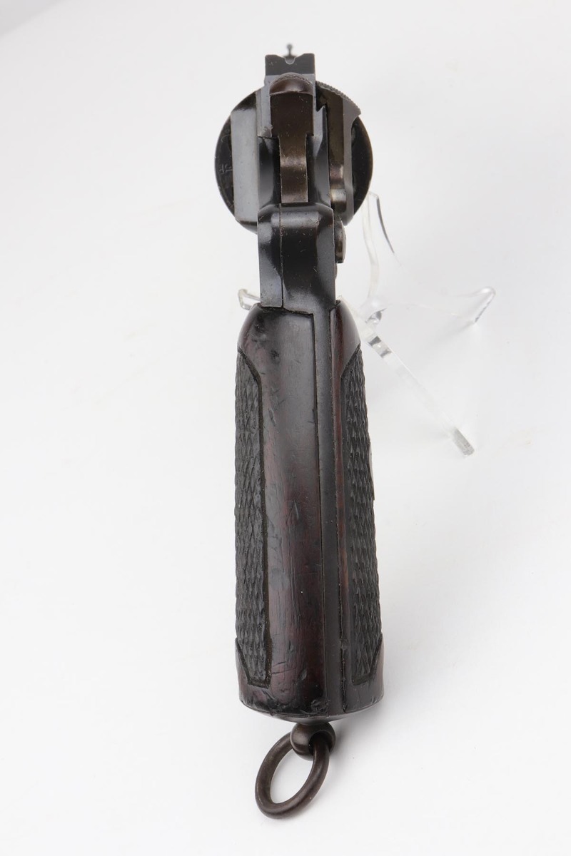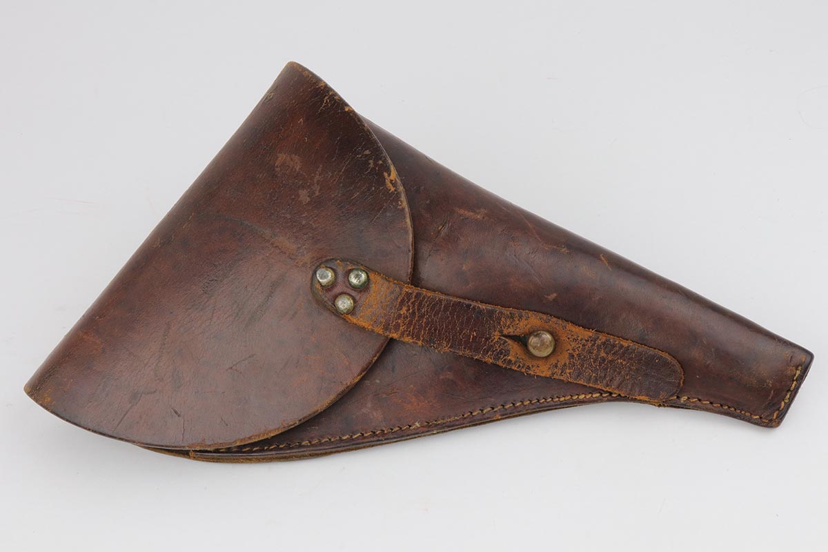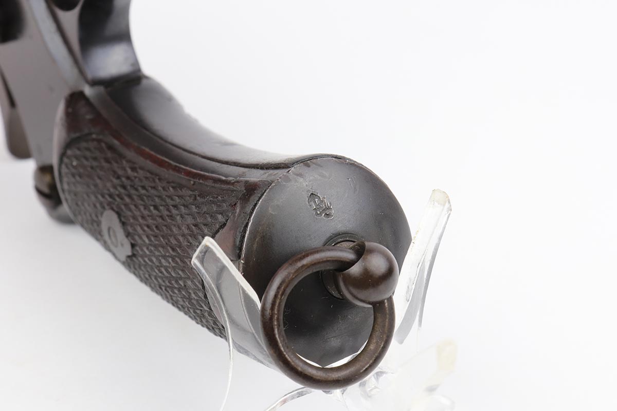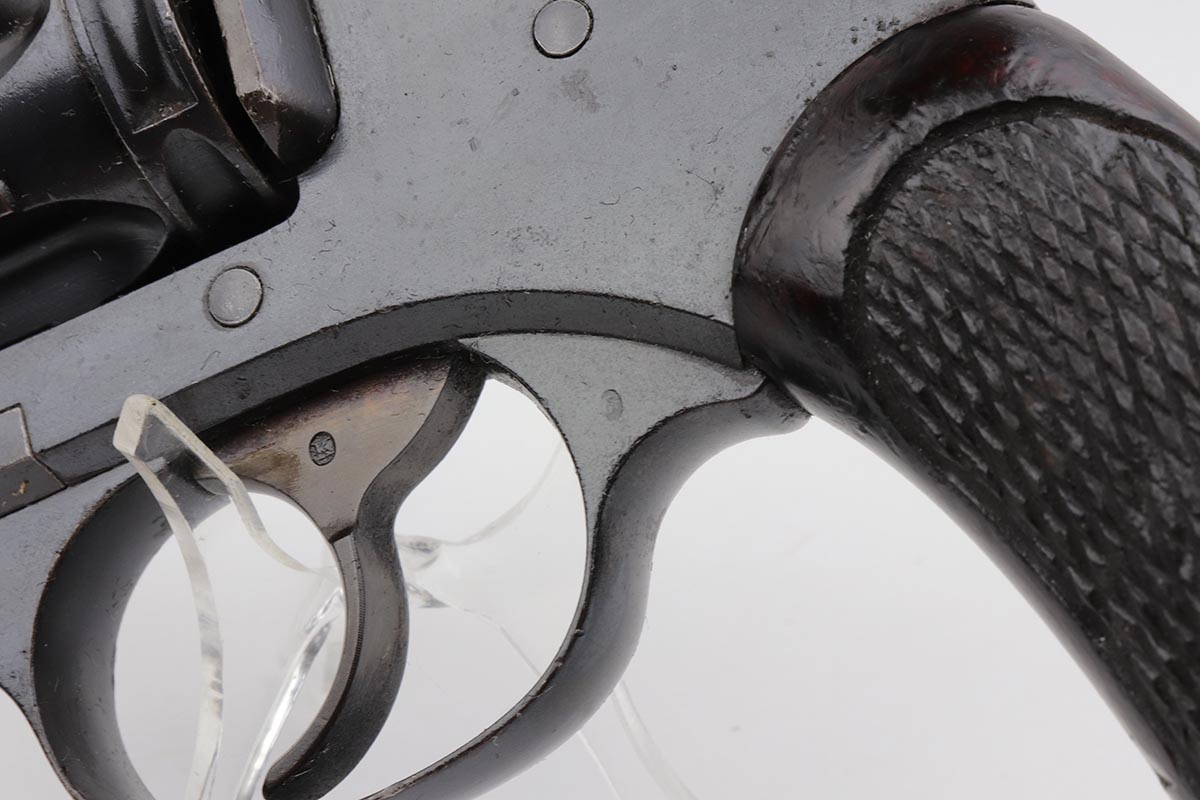 7/30/19 – This is a great example of a very early production Naval French M1892 revolver, made in 1895. The gun is all original with nearly all of its bluing remaining, with just a hint of edge wear and a few tiny freckles here and there – as per pictures. There is also some browning to the finish throughout. The straw on the small parts is still very strong. There is no pitting evident anywhere. The gun is marked S 1895 for the year of production. All the parts match. The grips are in very good condition. Minty bore. The butt is marked with a Naval anchor, denoting issuance to the French Navy. Original holster is in great shape with no defects and a couple of illegible ink stamps inside the lid. Navy marked French M1892 revolvers are extremely scarce and this is the first such example we’ve come across. Antique, so no FFL is required for purchase, unless prohibited by your local laws.