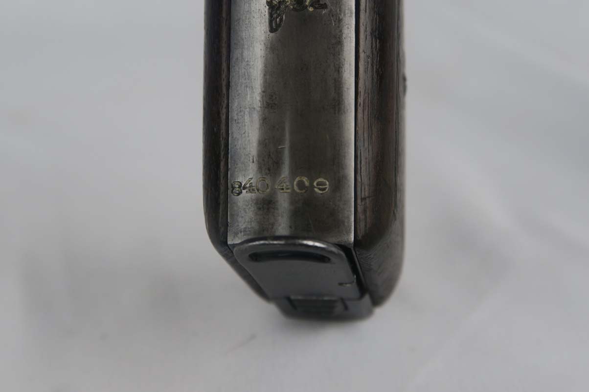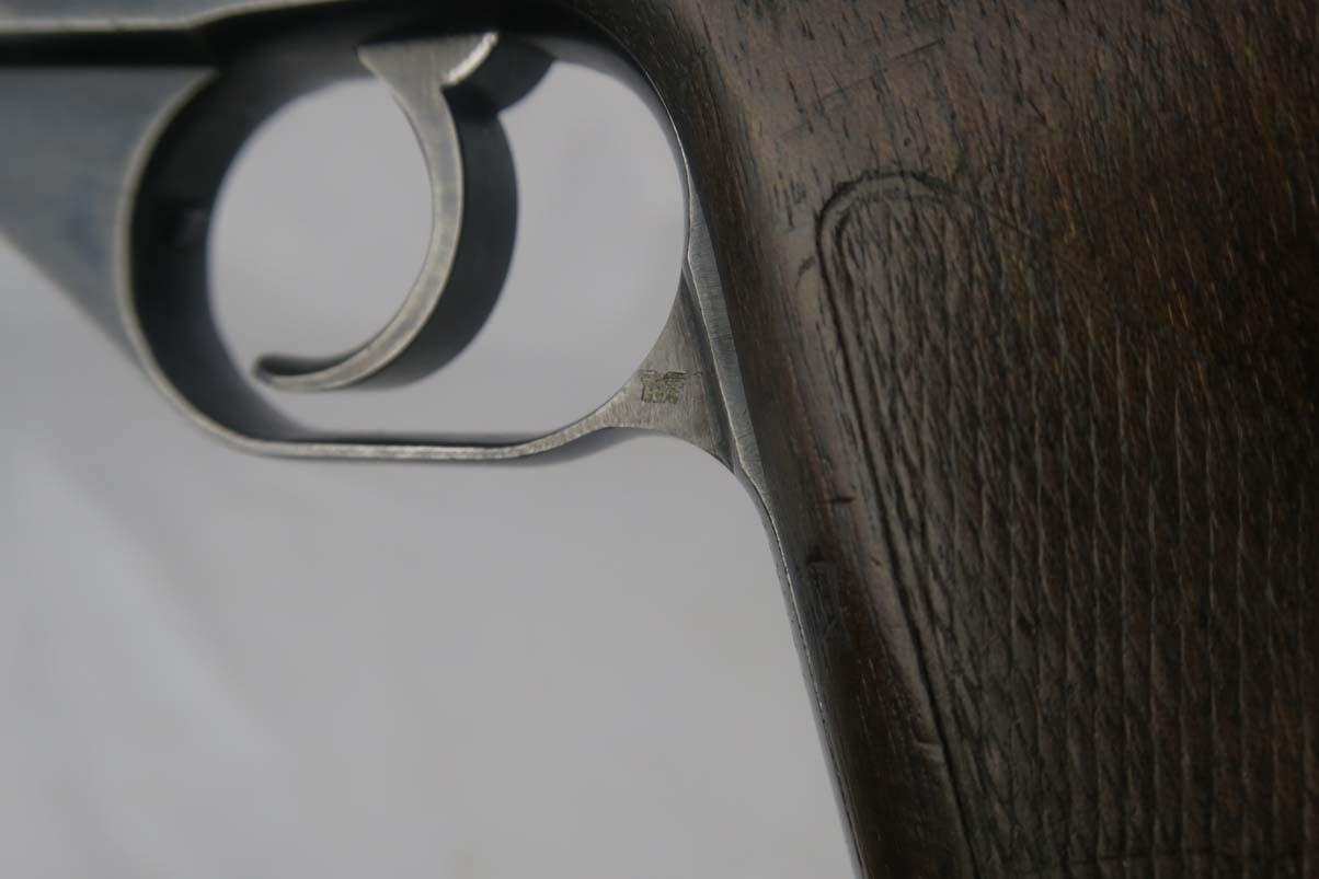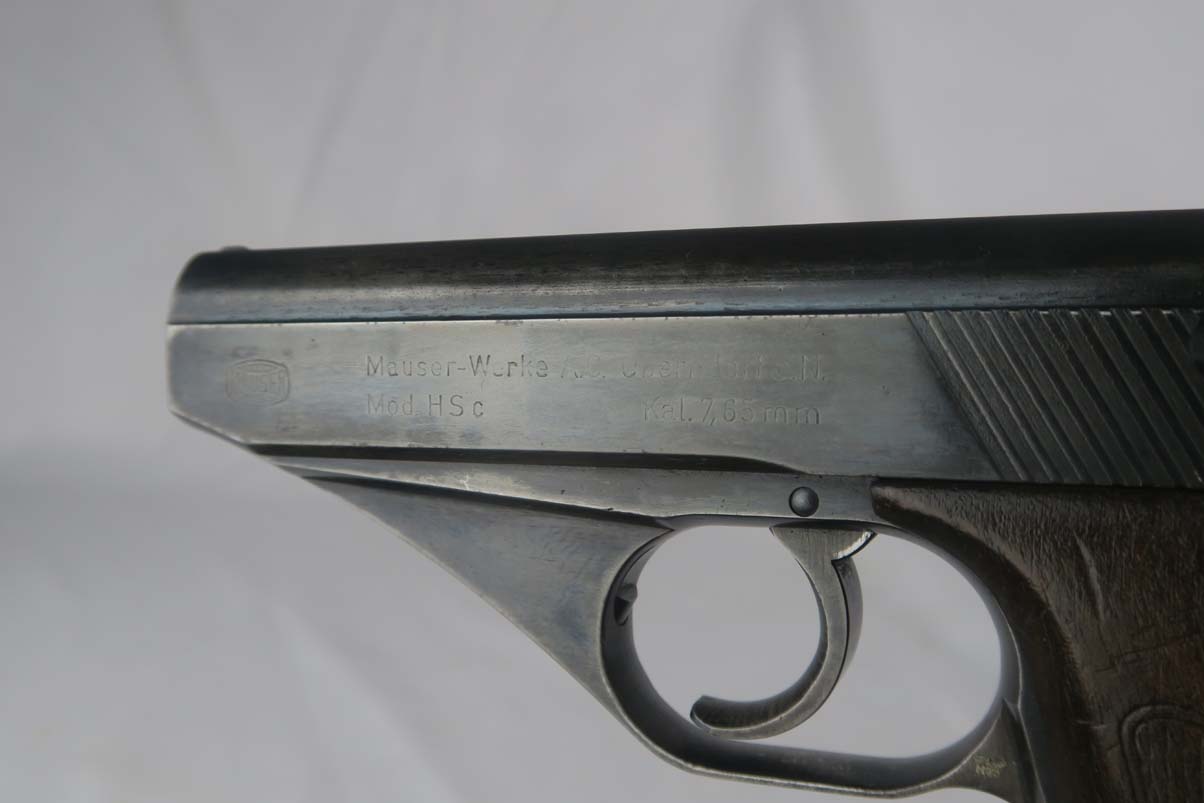 10/6/17 – This is a fairly rare Mauser HSc that was issued to the German Navy during WW2.  It is a variation 3 pistol, meaning it has the Navy eagle on the front strap, as well as a naval proof on the trigger guard.  There were only ~2,000 of this variation produced.  The finish is tough to rate, maybe 75%, as the straps show very little finish remaining and the slide has some thinning, as well.  The grips have some dings but no major cracks or chips.  Half-moon mag.  Excellent bore.