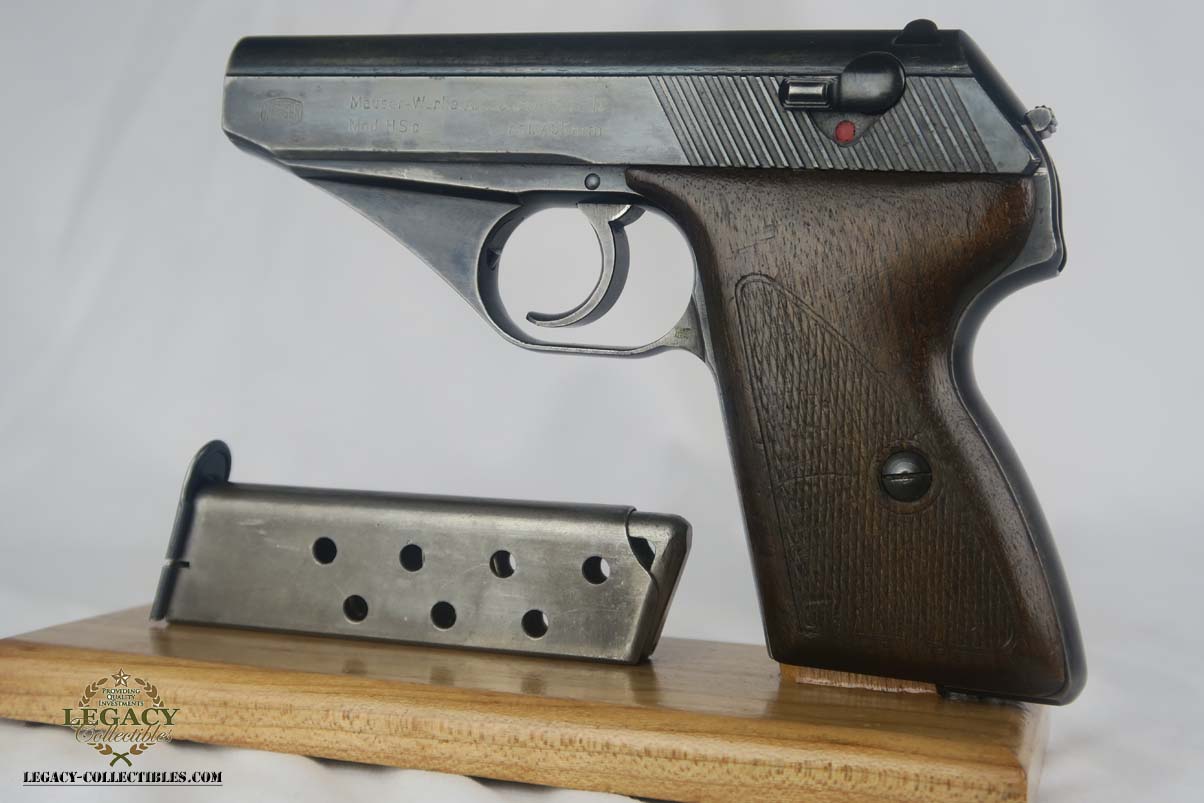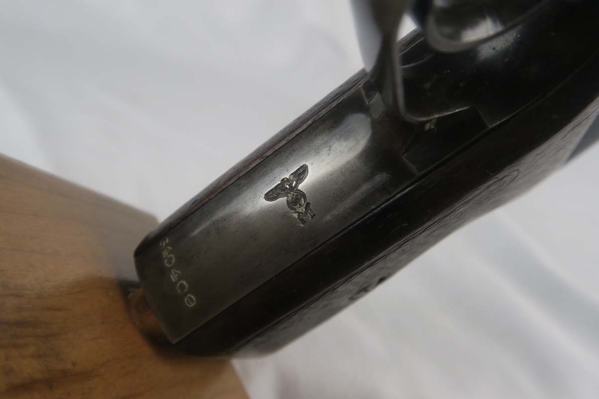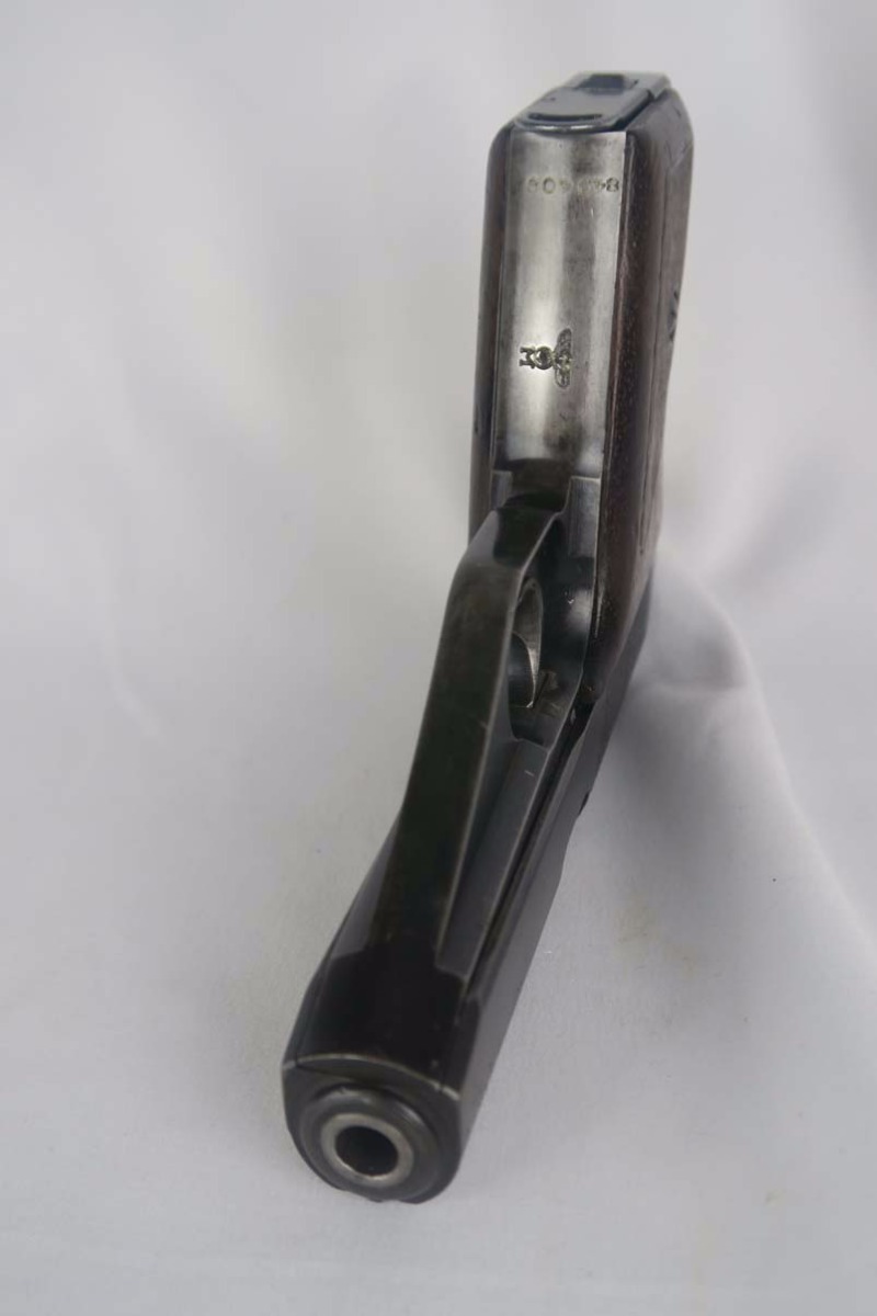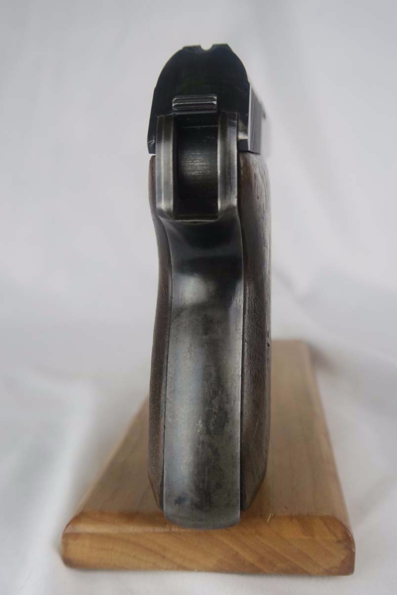 10/6/17 – This is a fairly rare Mauser HSc that was issued to the German Navy during WW2.  It is a variation 3 pistol, meaning it has the Navy eagle on the front strap, as well as a naval proof on the trigger guard.  There were only ~2,000 of this variation produced.  The finish is tough to rate, maybe 75%, as the straps show very little finish remaining and the slide has some thinning, as well.  The grips have some dings but no major cracks or chips.  Half-moon mag.  Excellent bore.