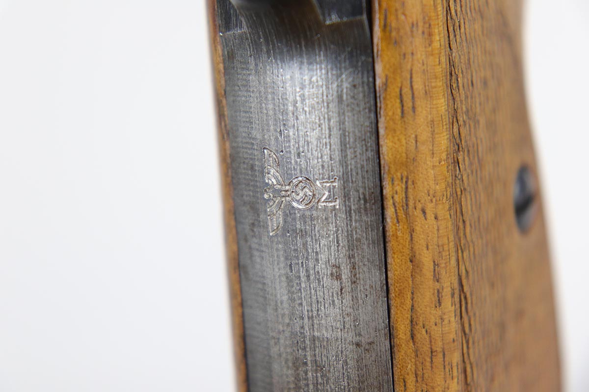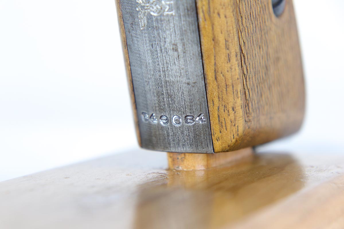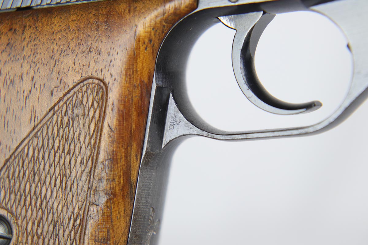 2/21/18 – This is a rare Mauser HSc that was issued to the German Navy during WW2.  It is a variation 3 pistol, meaning it has the Navy eagle on the front strap, as well as a naval proof on the trigger guard.  There were only ~2,000 of this variation produced.  The finish rates at about 90% with a nice slide and profile but thin straps.  Very nice grips with no major cracks or chips.  Half-moon mag.  Minty bore.