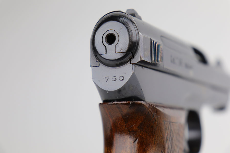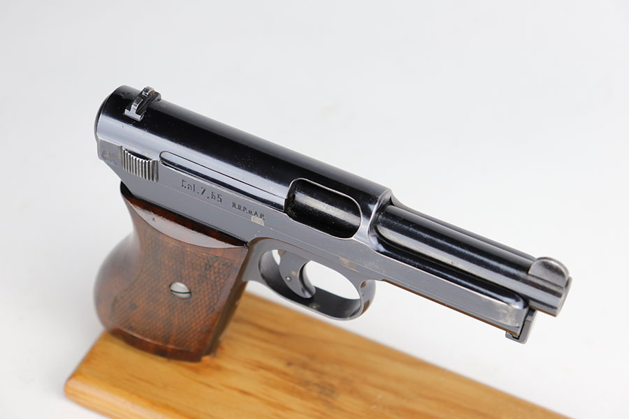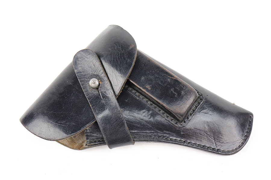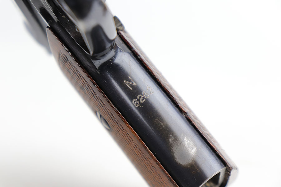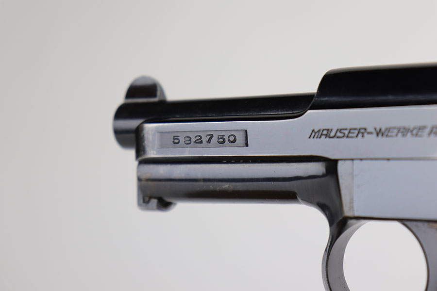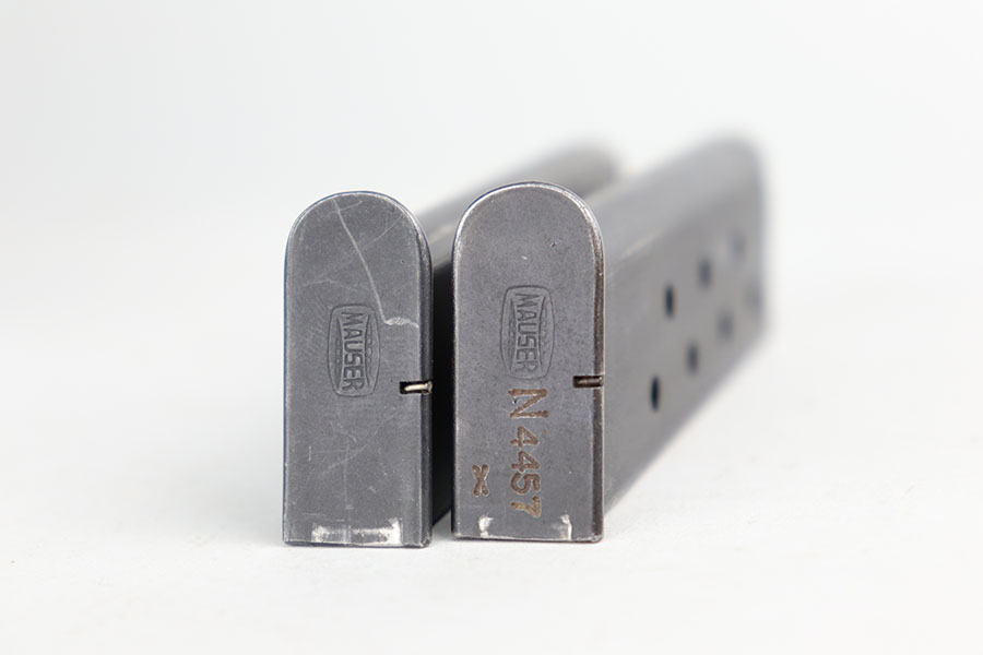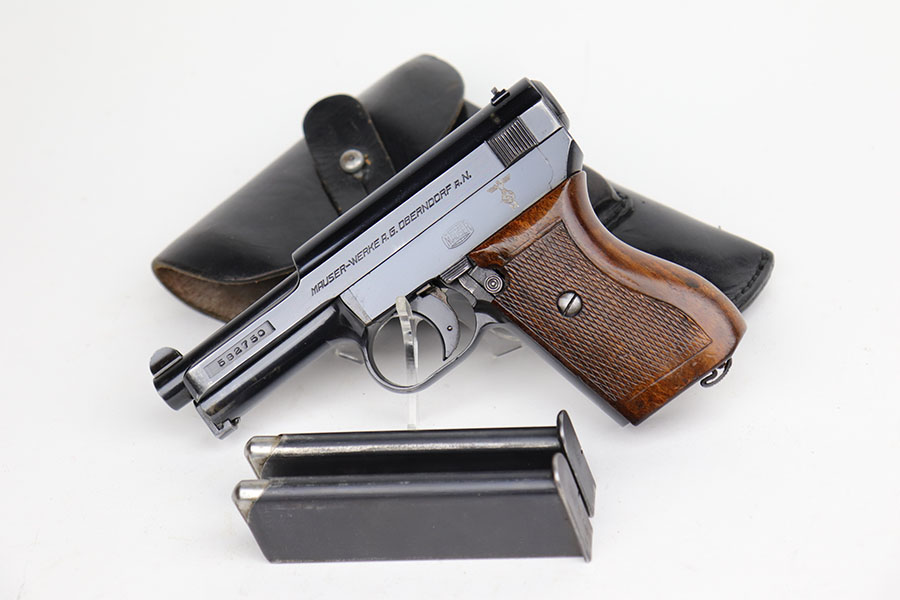 11/18/20 – This is a rare and complete Navy Mauser M1934 rig with holster and spare magazine. It’s a first variation example with Kriegsmarine eagle proof on left side of frame, and Nortsee property mark on front strap. There were only about 8,000 of this variation produced. The pistol has about 90% of the high-polish blue remaining, with high edge wear in common areas and finish loss on the front strap. Also minor spots of wear spattered about. Excellent bore and grip. The rig includes a total of two magazines, one of which is Navy marked but mismatched to the property mark on the gun, while the other is a standard banner variation. The holster is also original but unmarked.