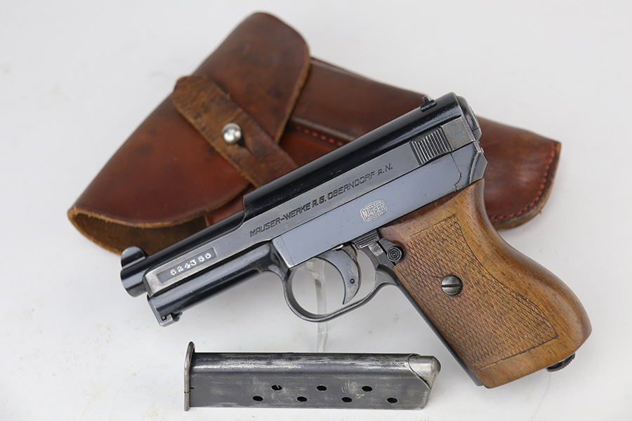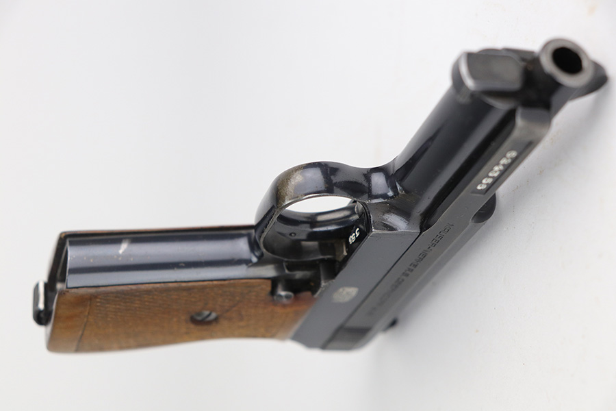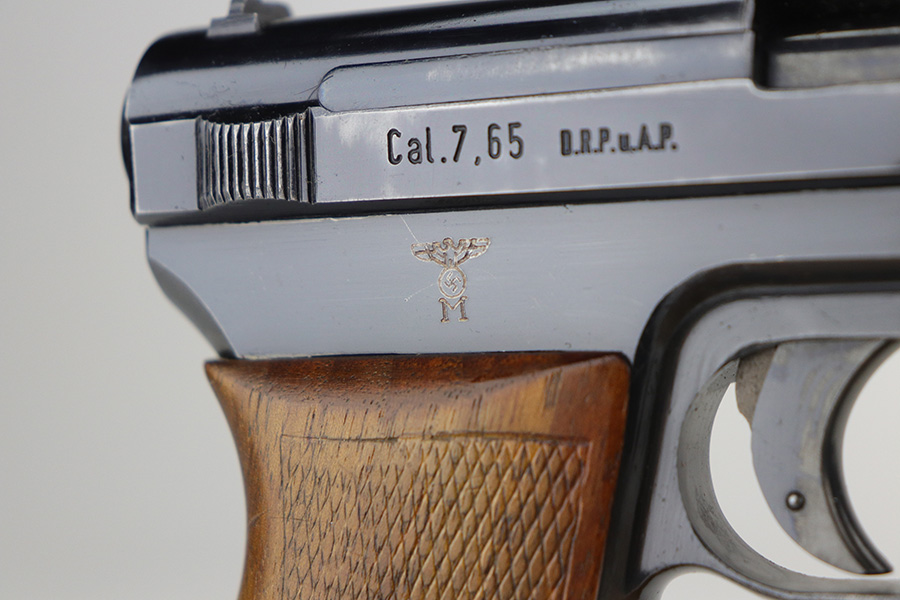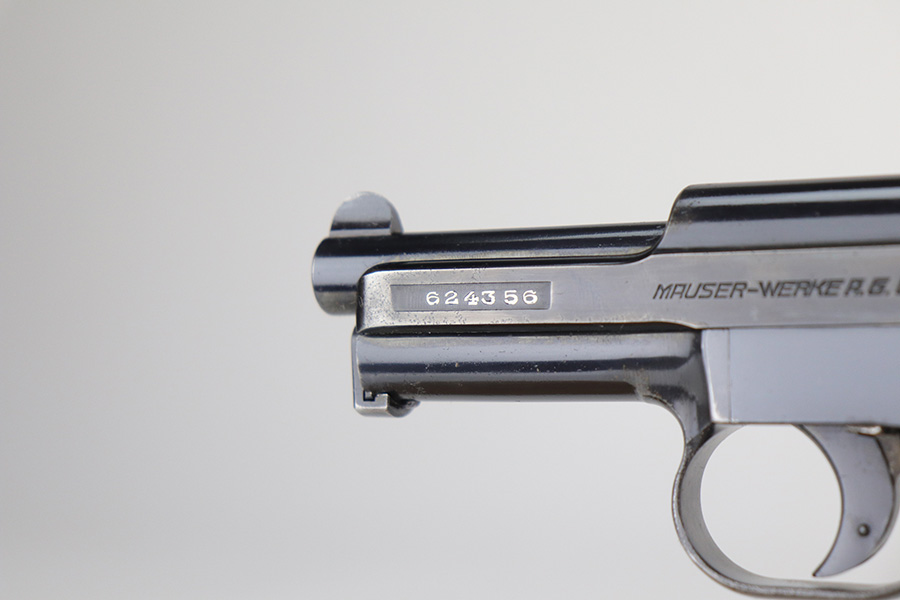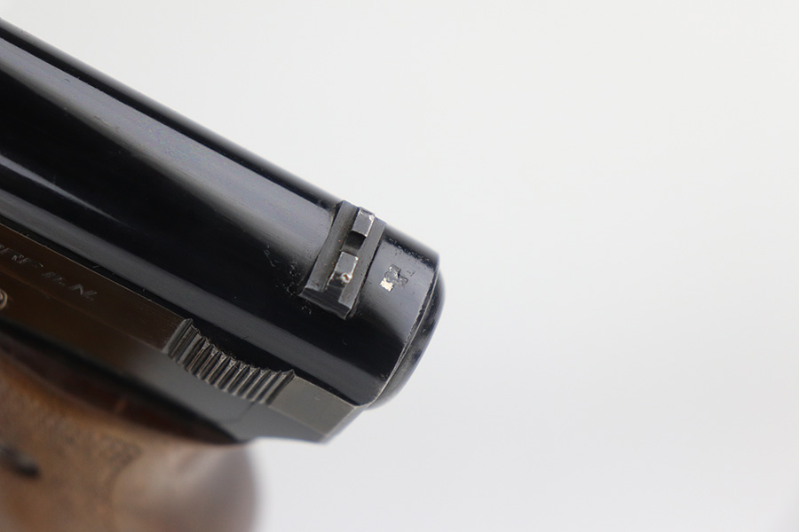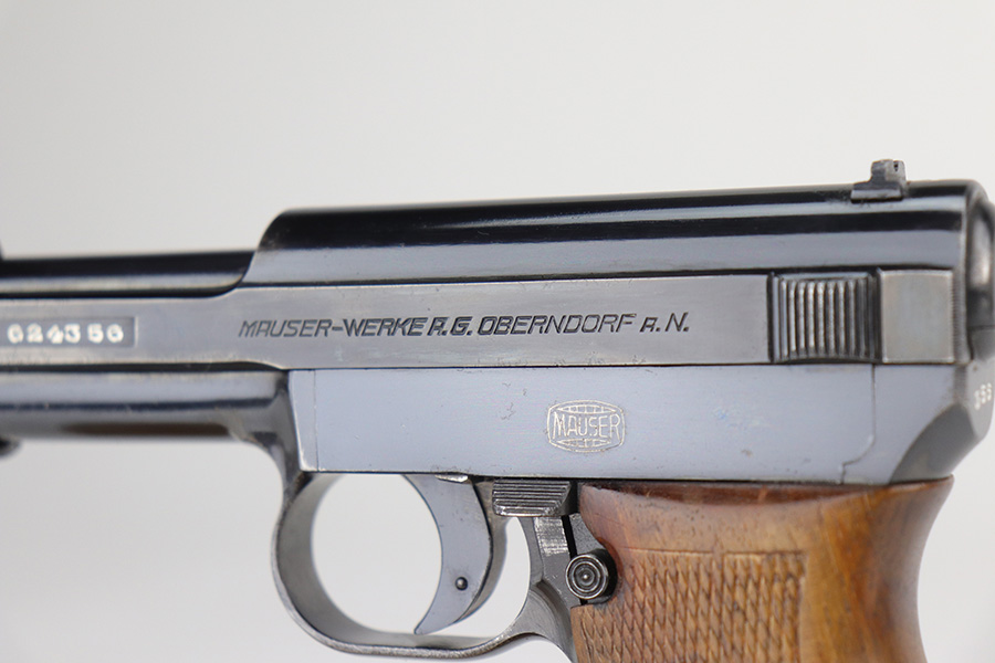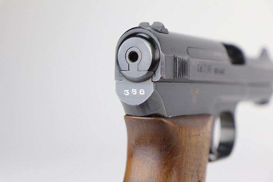 11/5/21 – This is a scarce Navy 1934 Mauser, in about 85-90% original condition. It is a variation 4 Navy 1934, meaning that it has the closed wing eagle on the right side of the frame, but no property mark on the front strap. There were only an estimated 6,000 of this variation procured, in the serial range 544390-627788, meaning this is one of the last Navy 1934 Mauser’s produced. Has holster wear on all the high edges, and notable finish loss on the trigger guard. There’s also some pinpricking on the left side of the slide. Nice, original grip aside from small stress crack near grip screw. Strong, shiny bore. Banner marked magazine. Also comes with a rare, original holster with Kriegsmarine eagle stamp.
