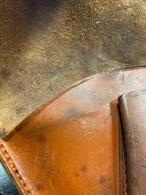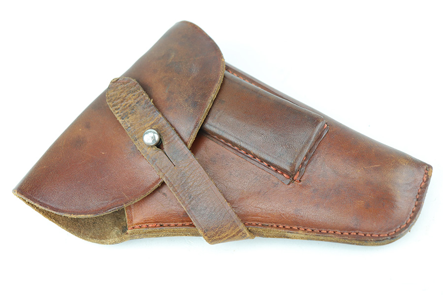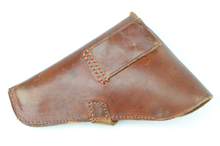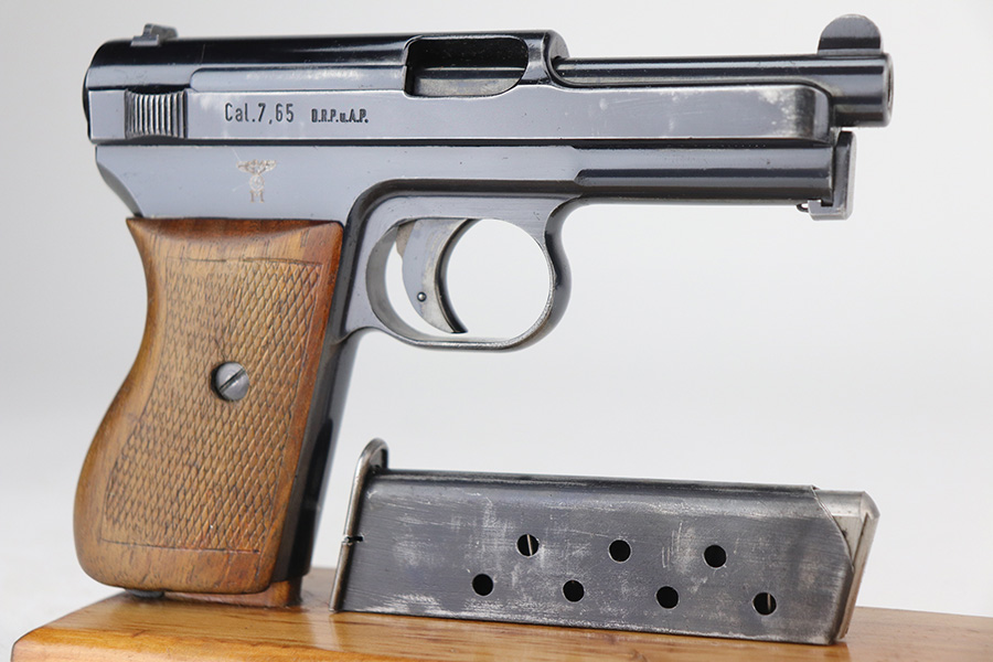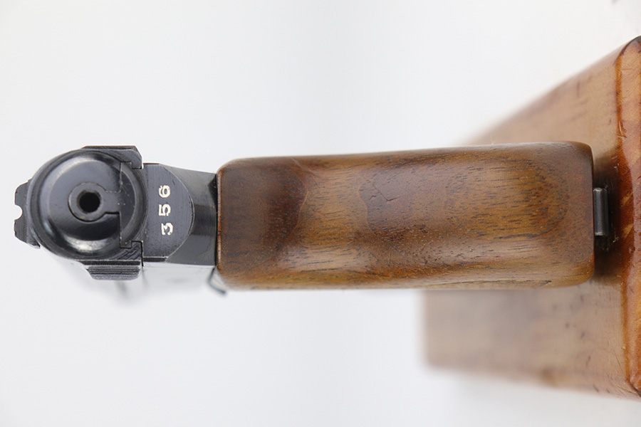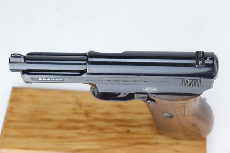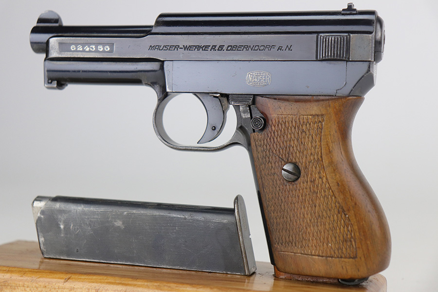 11/5/21 – This is a scarce Navy 1934 Mauser, in about 85-90% original condition. It is a variation 4 Navy 1934, meaning that it has the closed wing eagle on the right side of the frame, but no property mark on the front strap. There were only an estimated 6,000 of this variation procured, in the serial range 544390-627788, meaning this is one of the last Navy 1934 Mauser’s produced. Has holster wear on all the high edges, and notable finish loss on the trigger guard. There’s also some pinpricking on the left side of the slide. Nice, original grip aside from small stress crack near grip screw. Strong, shiny bore. Banner marked magazine. Also comes with a rare, original holster with Kriegsmarine eagle stamp.