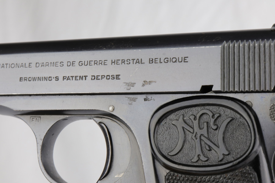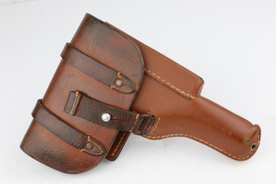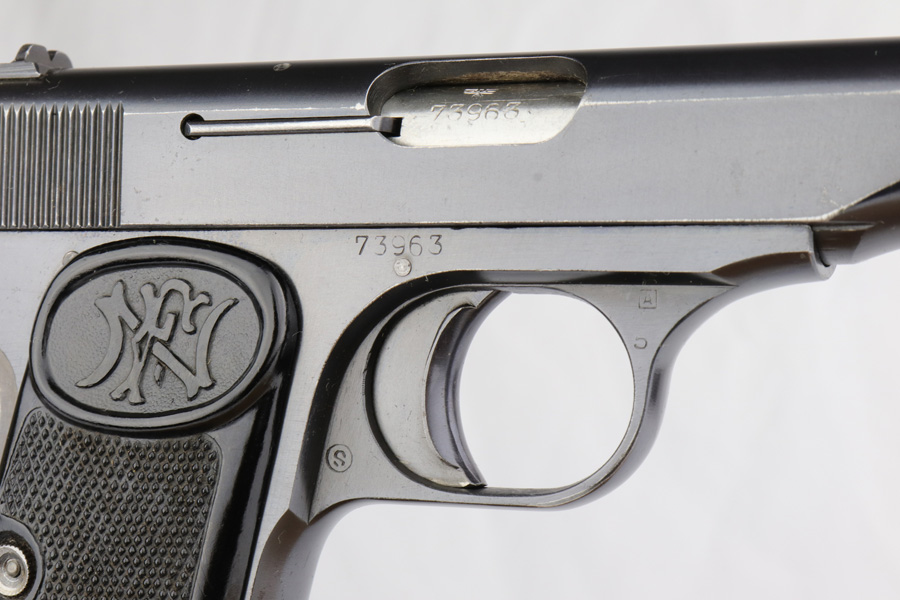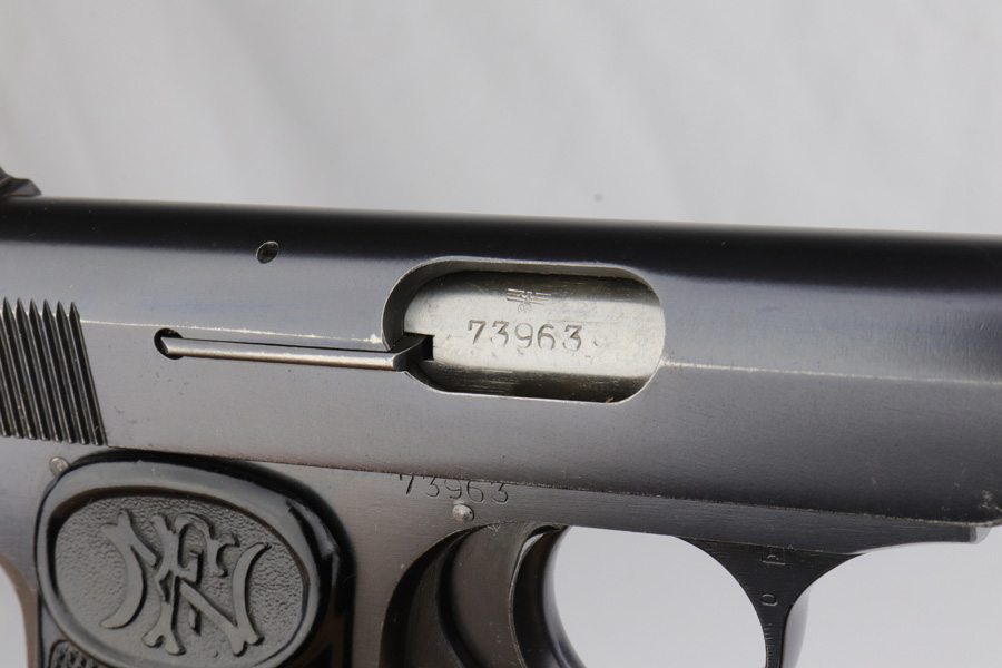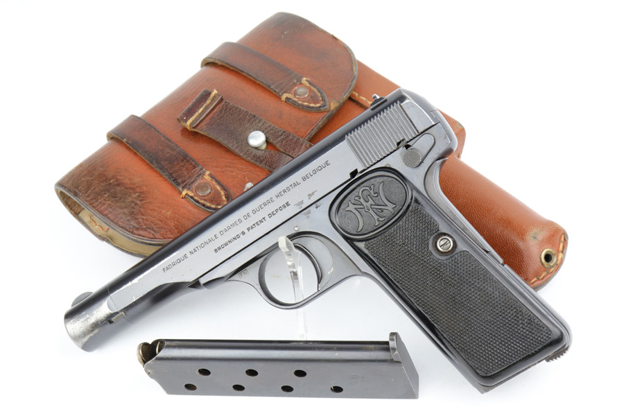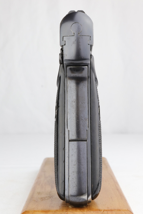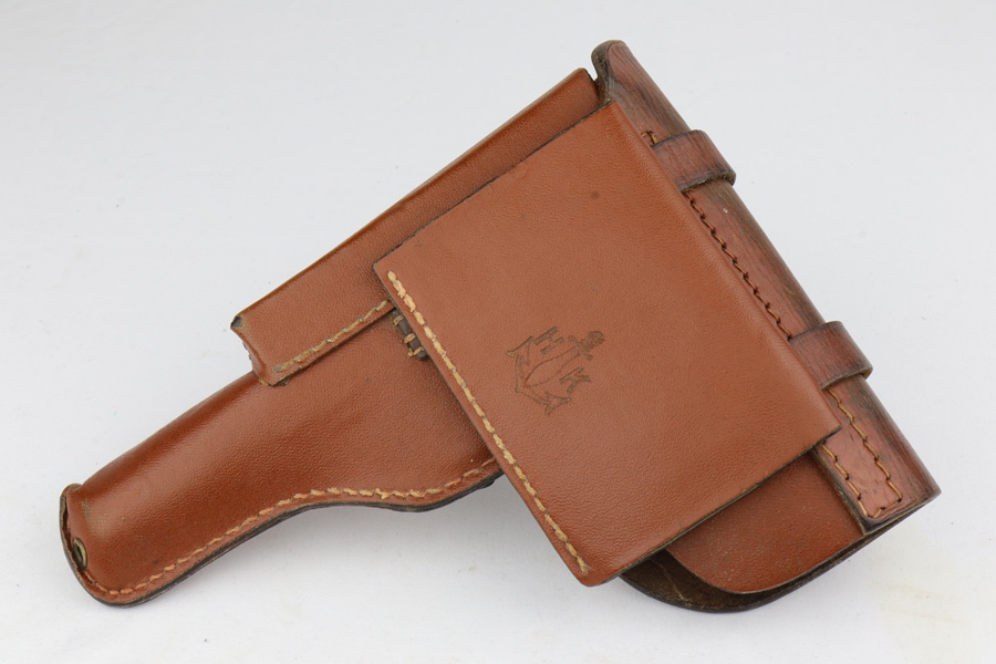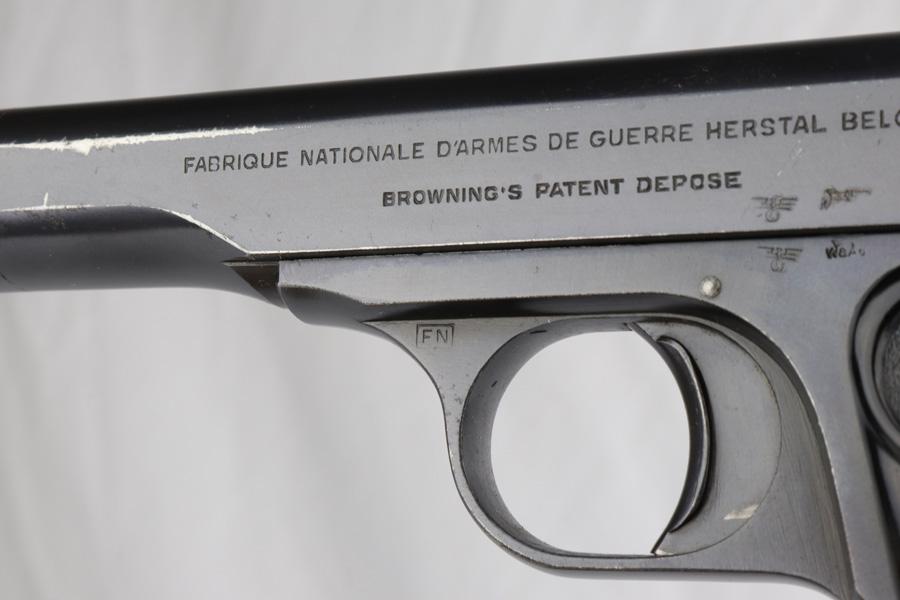 3/12/19 – This is an early and desirable Nazi 1922 Browning in 9mm kurz. Featuring WaA613 proofs, there were only an estimated 3,200 of this variation produced for the German Army, and this is the first we’ve offered in years. The pistol retains 93-95% polished blue, with the majority of finish loss seen on either side of the muzzle. This is very common for this model, as the holsters were notoriously tight in the toe portion. Also minor finish loss on the bottom of the back strap of this one. Minty bore and grips with proper 9mm magazine. Pistol comes with an excellent and original dropping style holster, which features faint internal inkstamp and very sharp HK marking with anchor.