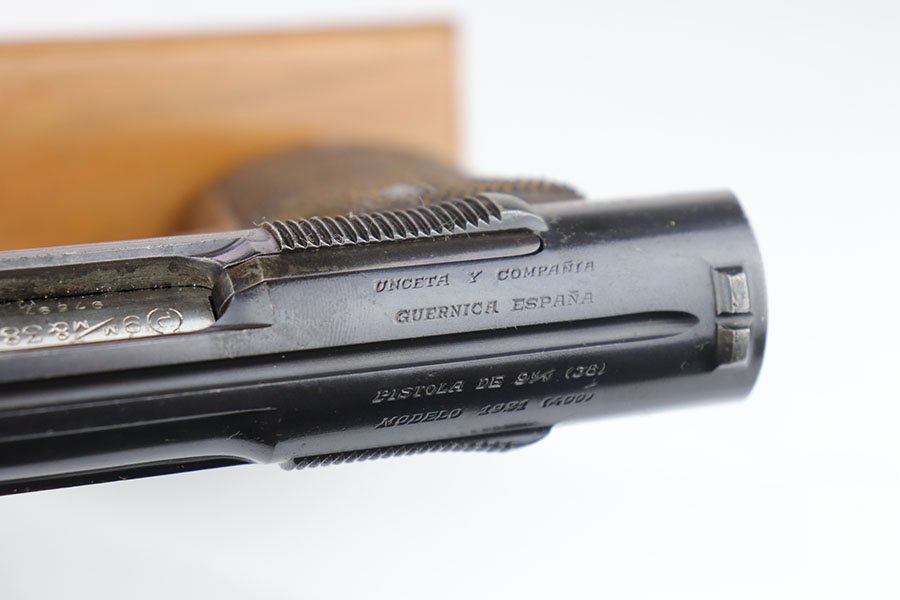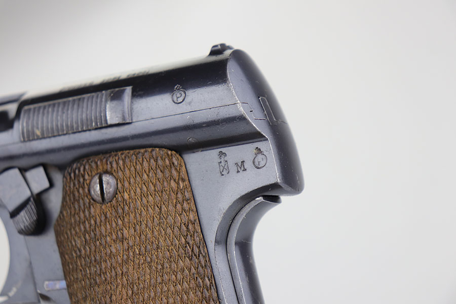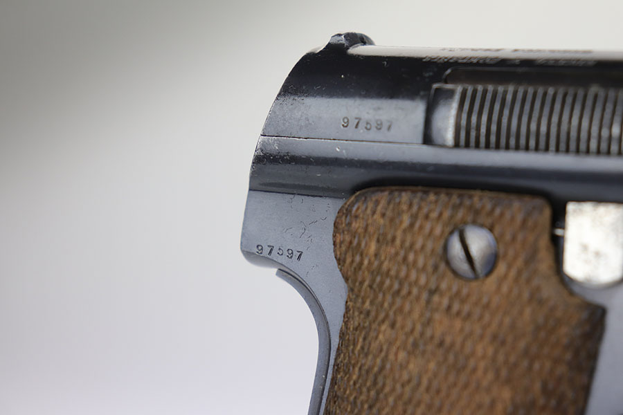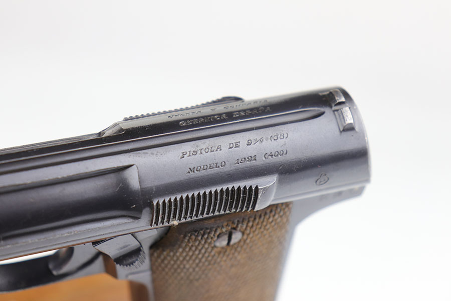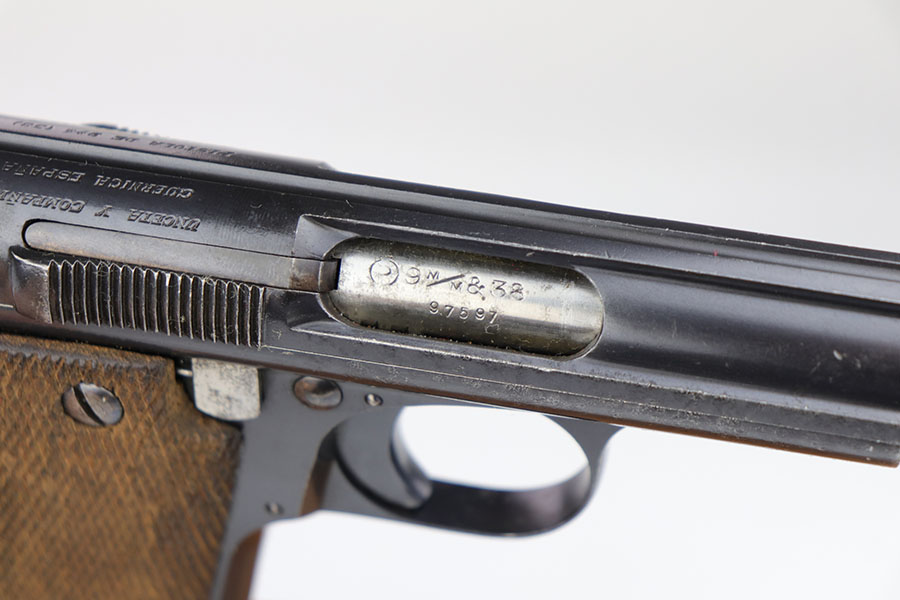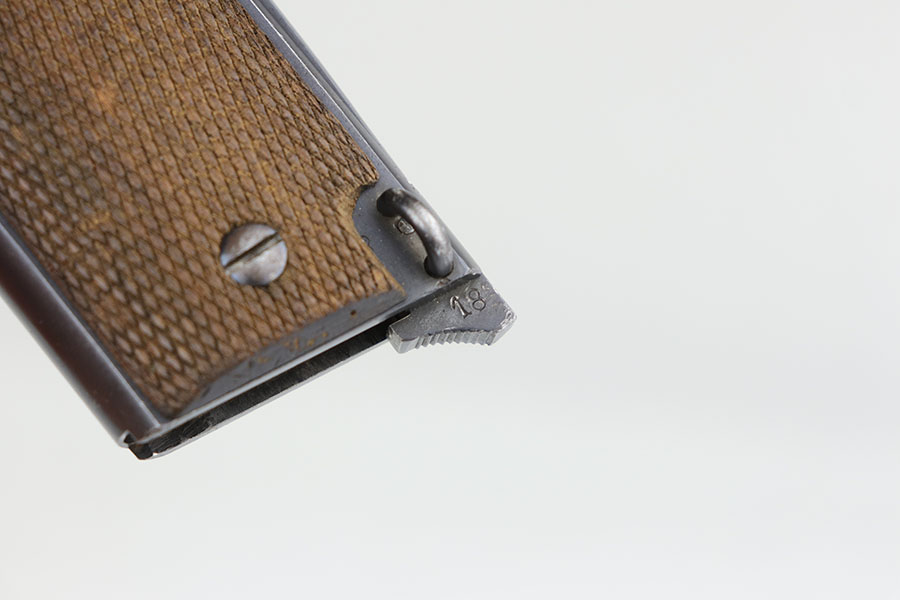4/17/20 – This is a terrific example of a rare Nazi contract pistol rig – the Spanish Astra 400.  There were only ~6,000 Astra 400’s produced for the Nazi contract, all in 1941, as evidenced by the Awschalom factory letter which detailed the serial range for this contract. The pistol shows hardly any finish loss to the original blue, but there are a few areas of surface pinpricking, mostly along the rails on each side of the pistol. The original grips are in excellent condition with only minor handling wear. Original magazine is present. Unfortunately, the bore wasn’t well cared for on this pistol. It has frost and freckling in the grooves, but does have strong rifling.