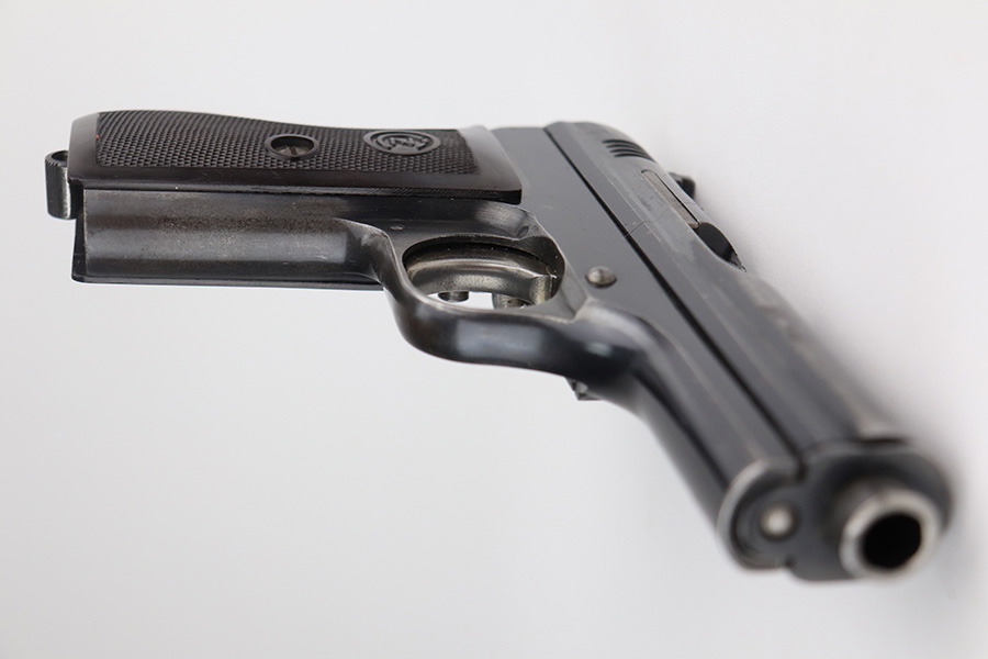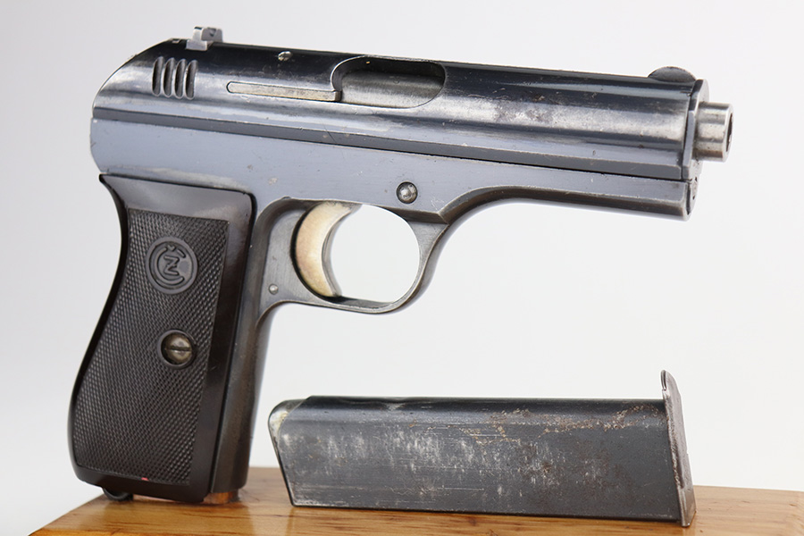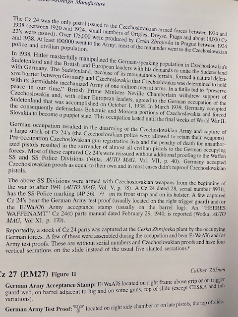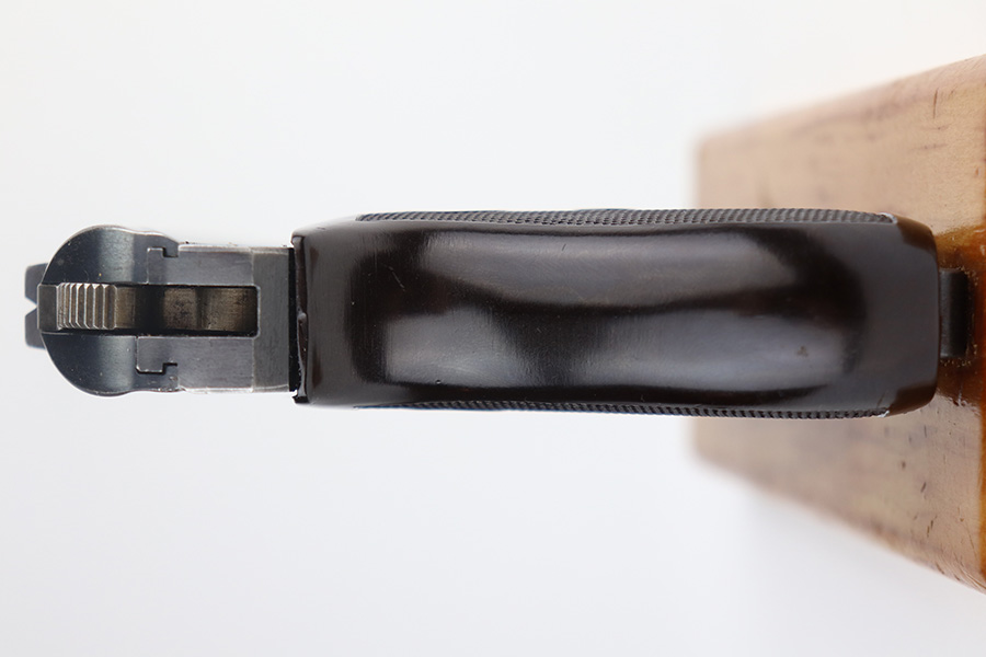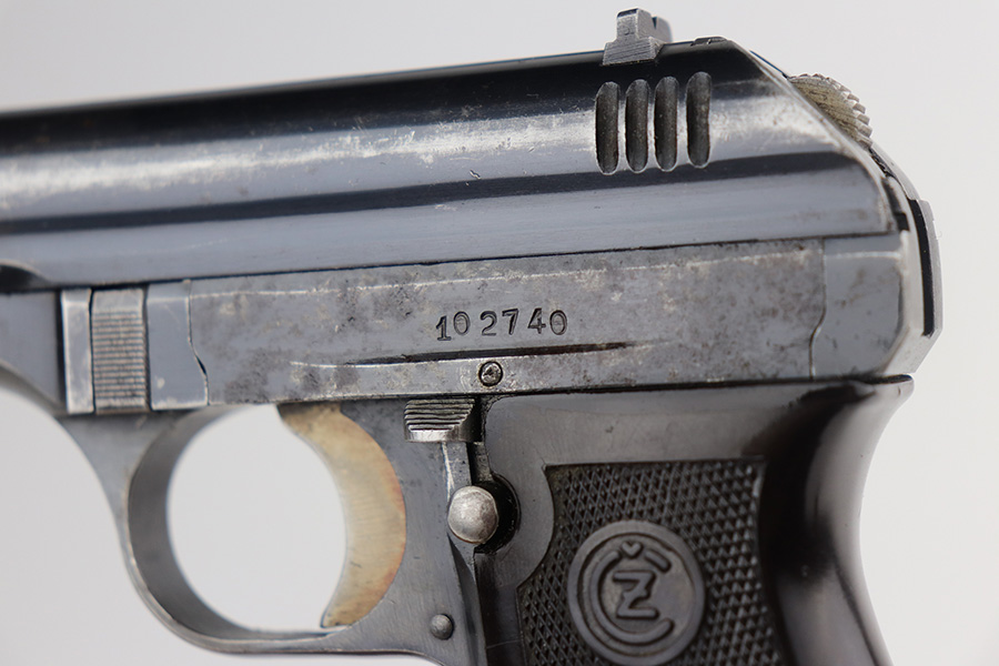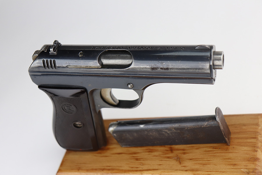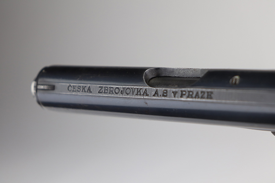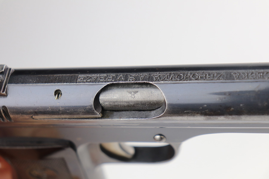 7/2/21 – This is a very rare CZ vz. 24 pistol that was left over in Czechoslovakia at the time of the Nazi invasion, and then issued to German military, likely the Waffen SS. An image showing Jan Still’s excerpt on these rare pistols is included in the photos for this listing, but they have rare characteristics such as the four vertical serrations on the slide, WaA76 and Nazi test proofs on barrel, and no Czech markings. This particular examples has some thinning throughout, and some freckling on the left side of the frame. Excellent, shiny bore. Very nice grip with no major defects. We could find very few comparable examples, whether in Still’s books or previous internet sales.