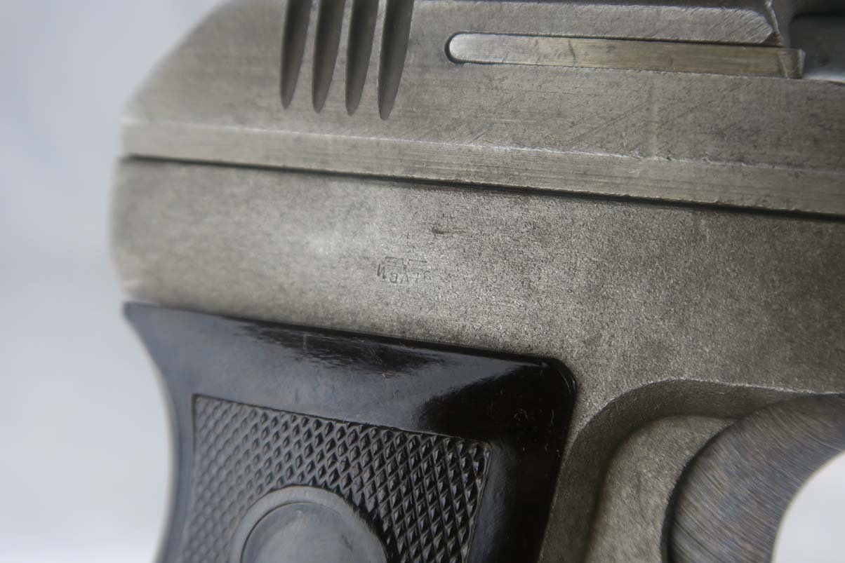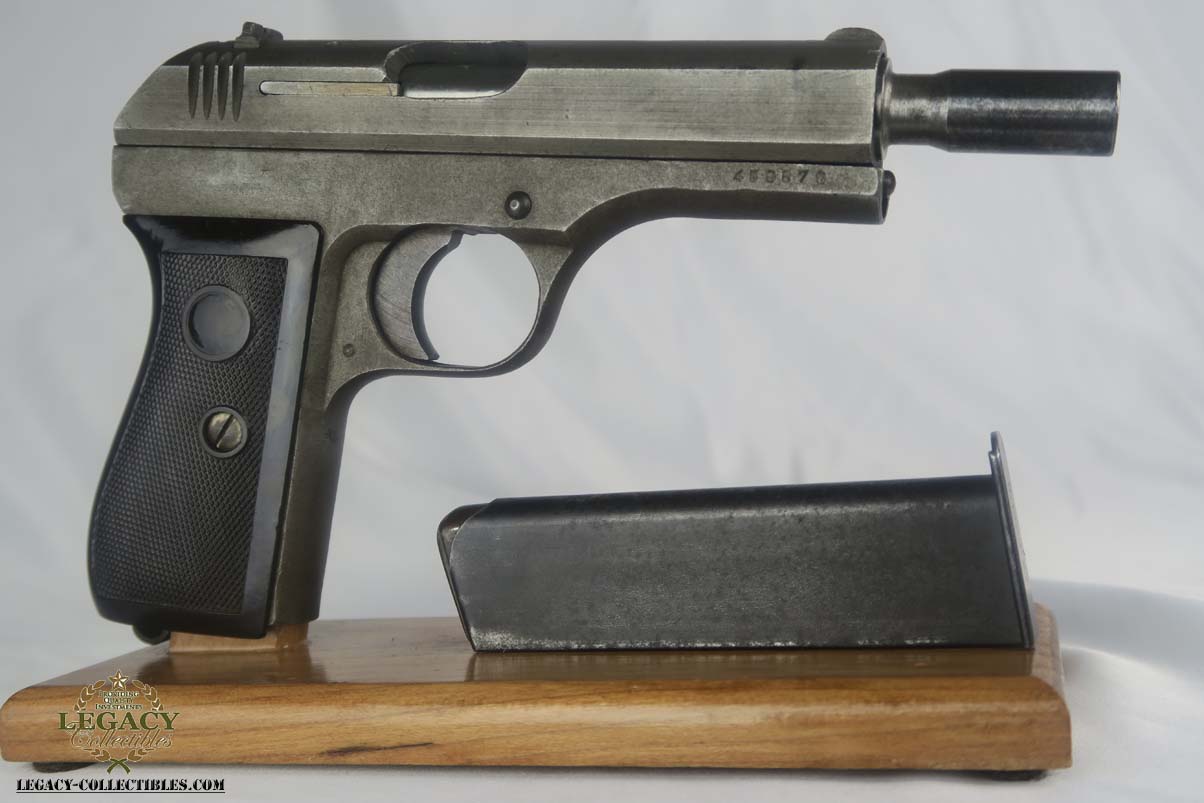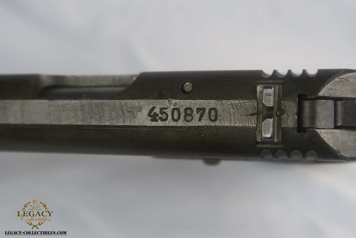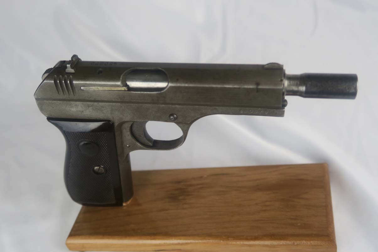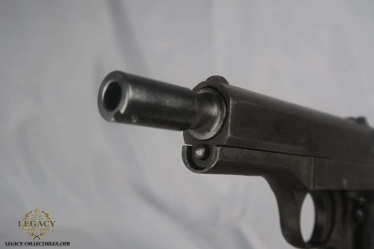 5/19/17 – .This is a rare, late-war CZ that falls into the correct serial range for the guns that were fitted for a silencer. These clandestine or “excecution” guns were thought to be issued to SS or Gestapo. They are very rare and documented in Jan Still book on Axis Pistols, as well as other places. Original Phosphate finish. Waffen proof on the top and the slide. 7.65 caliber and the good news is that it must not have been used much as it has a very good bore. Rifling is continuous and congruent thru the extension so you know it was not added later.  Grip is in good shape, though it does have a very minor corner chip.