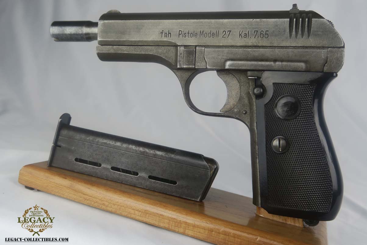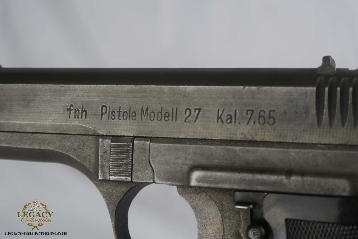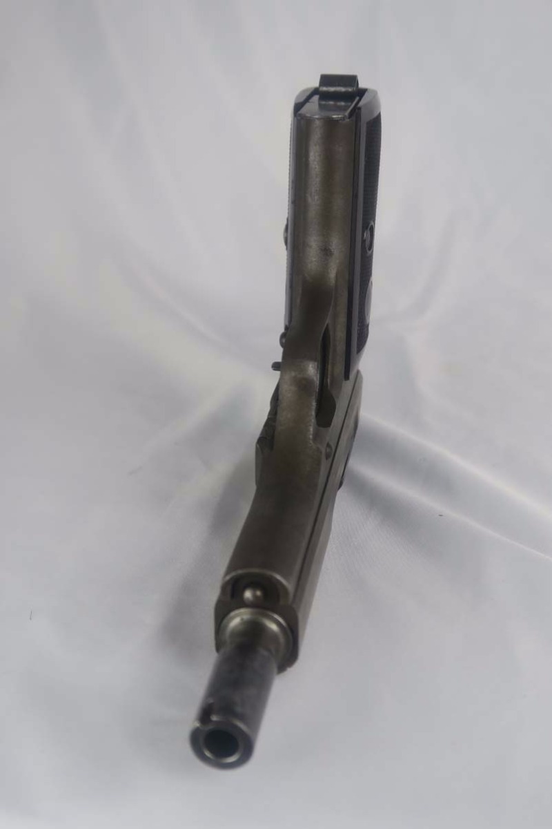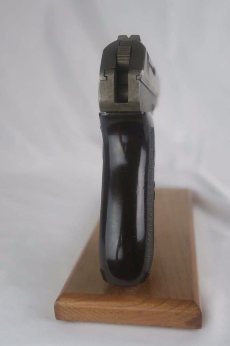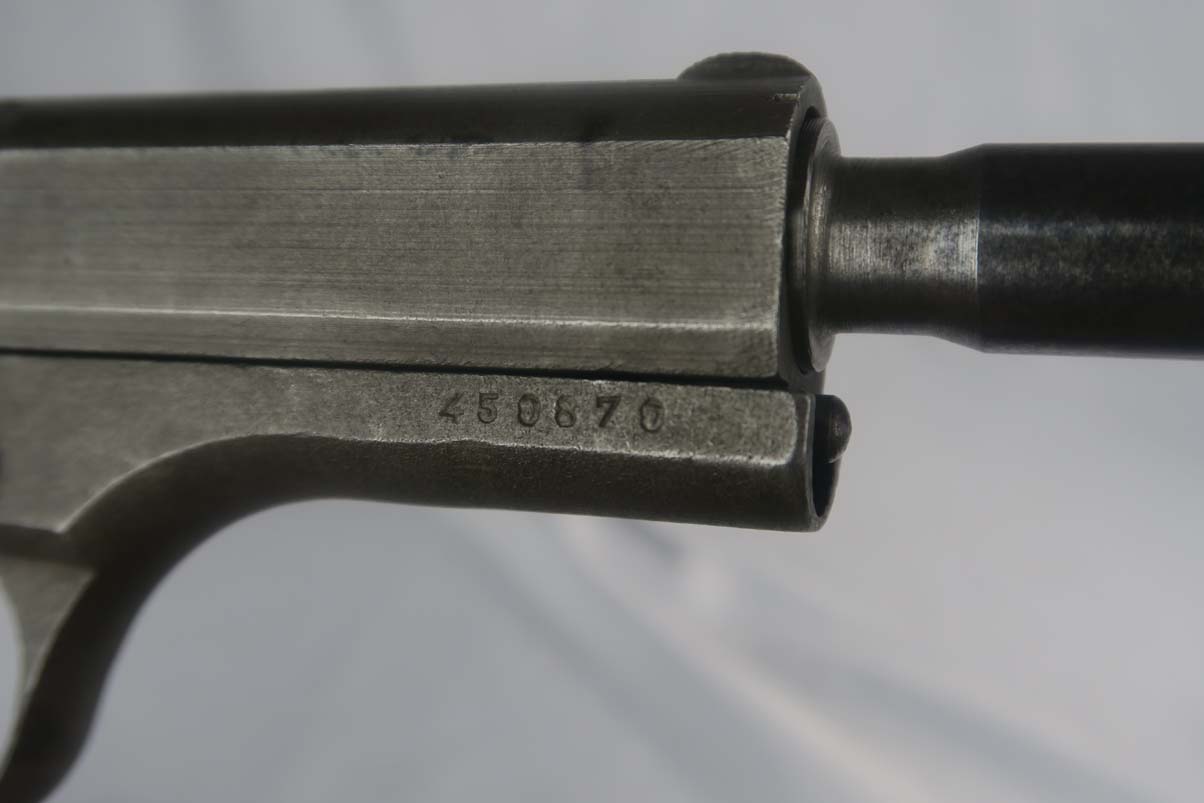 5/19/17 – .This is a rare, late-war CZ that falls into the correct serial range for the guns that were fitted for a silencer. These clandestine or “excecution” guns were thought to be issued to SS or Gestapo. They are very rare and documented in Jan Still book on Axis Pistols, as well as other places. Original Phosphate finish. Waffen proof on the top and the slide. 7.65 caliber and the good news is that it must not have been used much as it has a very good bore. Rifling is continuous and congruent thru the extension so you know it was not added later.  Grip is in good shape, though it does have a very minor corner chip.