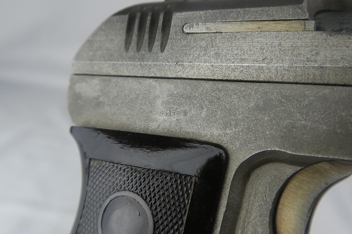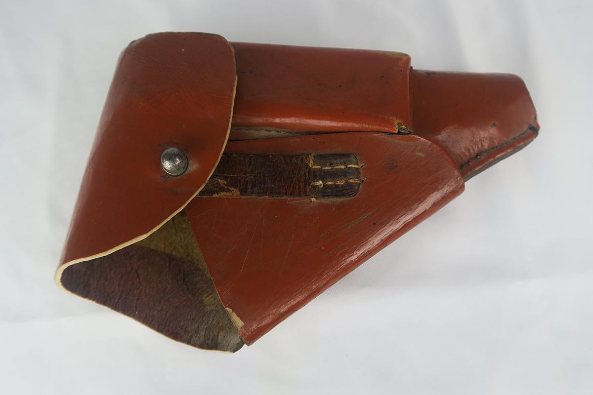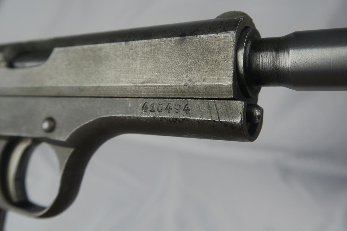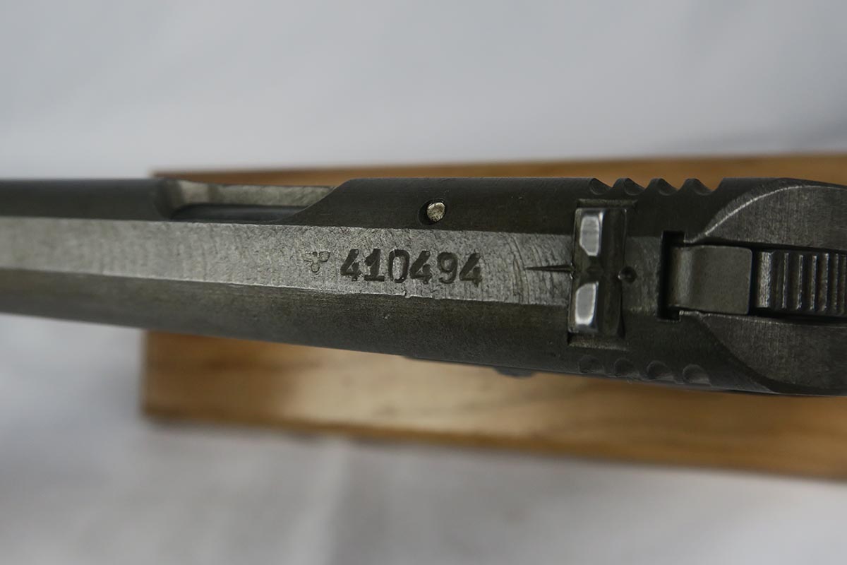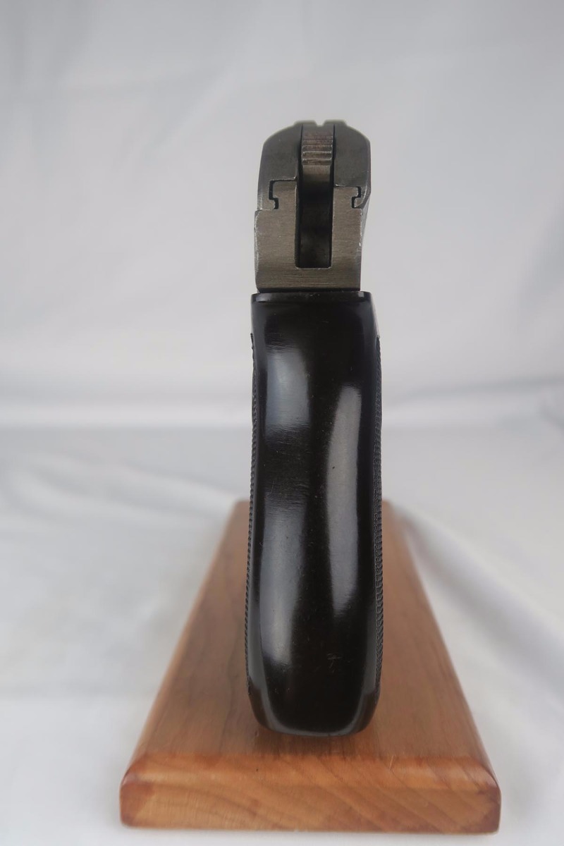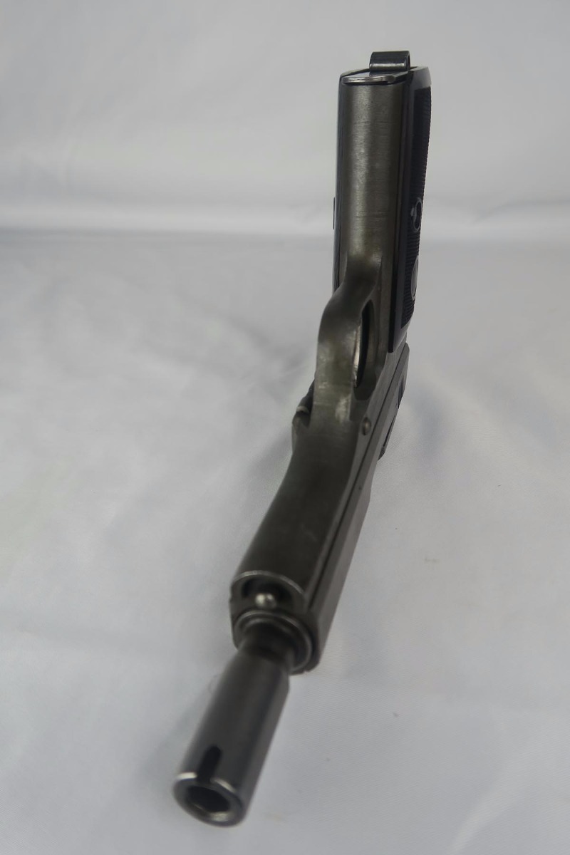 8/22/17 – This is a rare, late-war CZ that falls into the correct serial range for the guns that were fitted for a silencer. These clandestine or “excecution” guns were thought to be issued to SS or Gestapo. They are very rare and documented in Jan Still book on Axis Pistols, as well as other places. Original phosphate finish with waffen proof on the frame.  Some minor wear and discoloration from aging on both sides of the slide, but no major issues or pitting. Bore is very nice and the rifling is continuous and congruent thru the extension so you know it was not added later.  Grip is in good shape, though it does have a very minor corner chip.  Also included in the listing is a period original ersatz holster that has been modified to all room for the extended barrel/silencer.