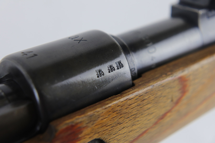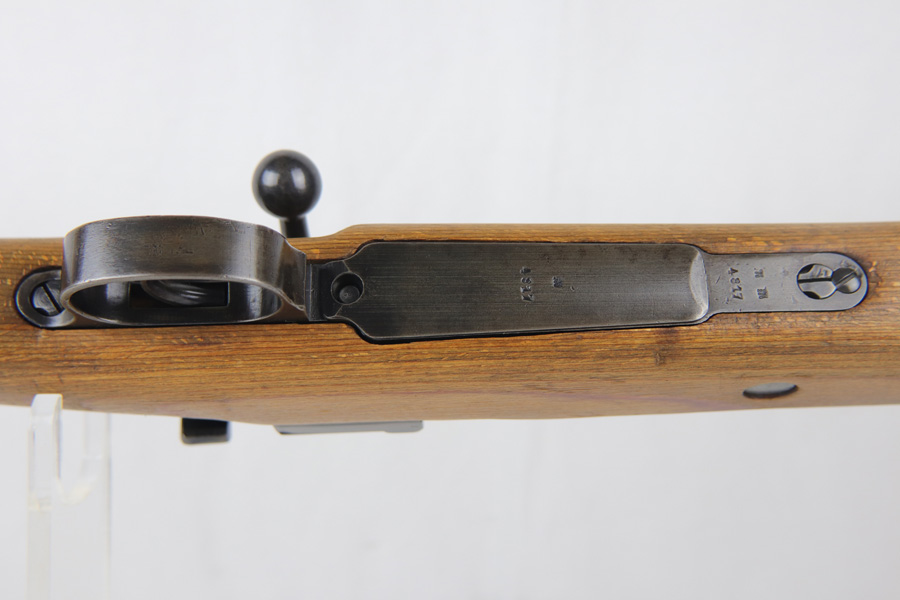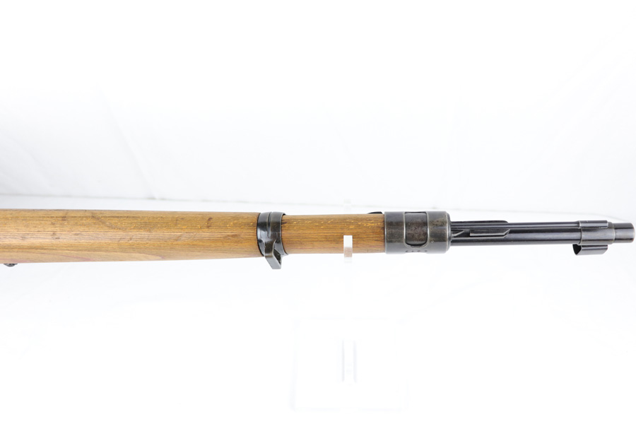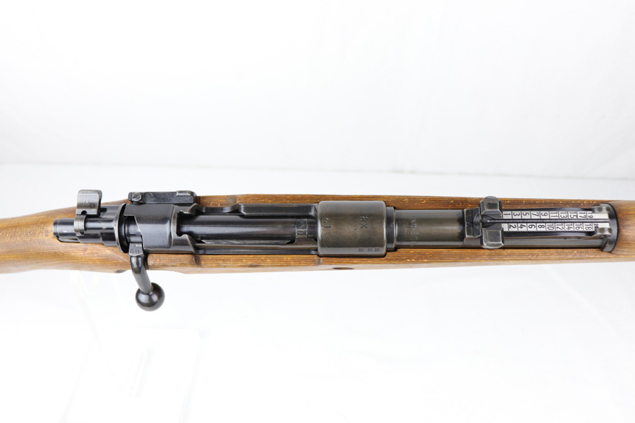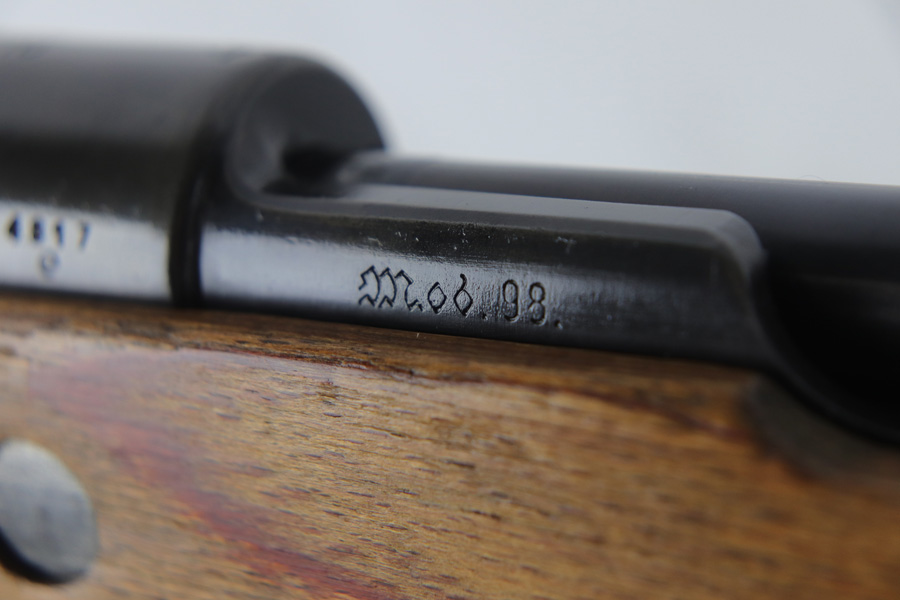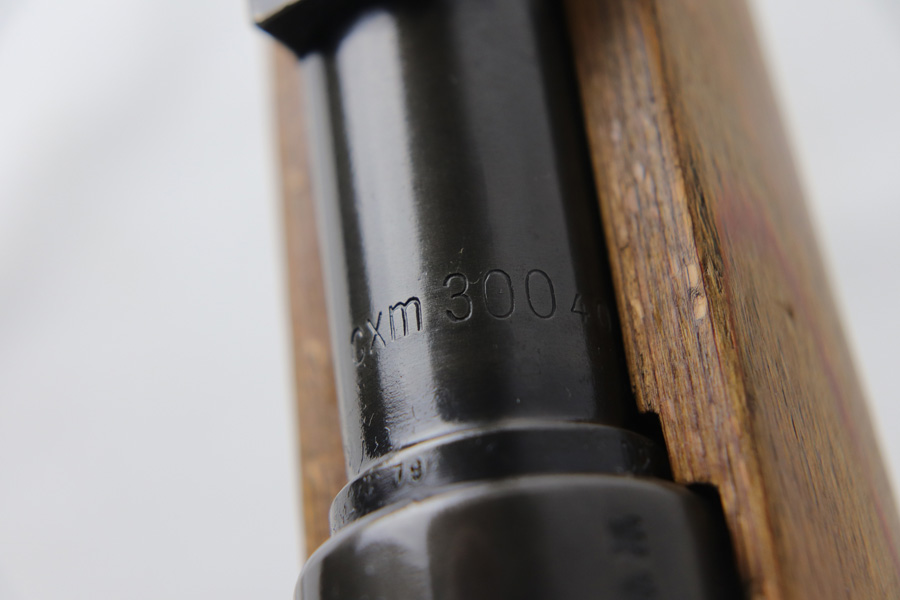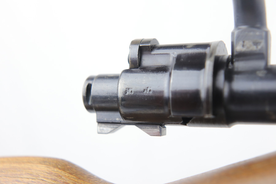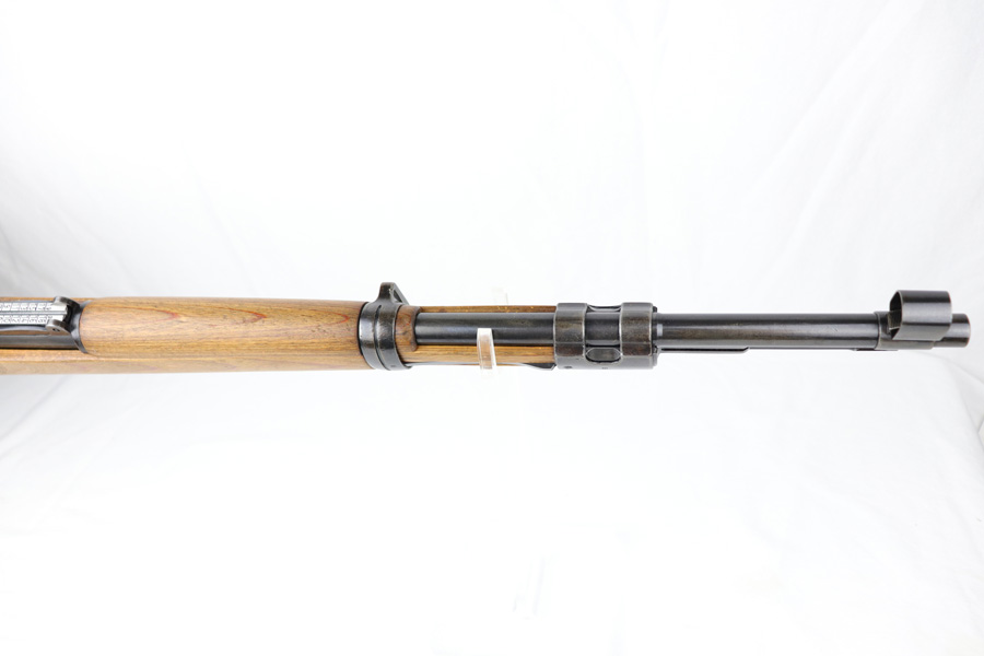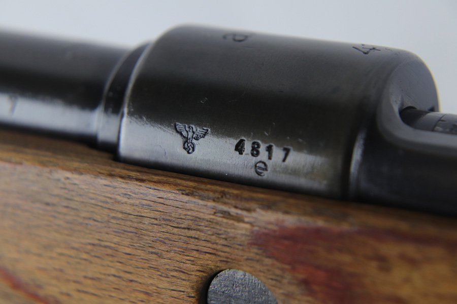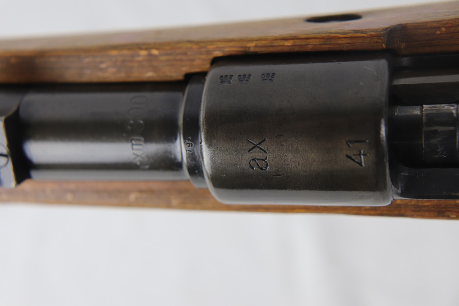 10/25/18 – This is a rare “ax” code k98 rifle manufactured by Feinmechanische Werke in 1941. It is estimated that fewer than 1% of K98s received this code. In mid 1940 the “27” code of Erma was replaced by the “ax” code of Feinmechansiche Werke. It is estimated that approximately 150,000 K98 rifles were produced in 1940 with both the “27/ax” code receiver markings, however the “ax” code k98 rifles are much rarer. The top of the receiver ring is marked “ax / 41”, the right side is marked with three “eagle/280” Waffenamt proofs and the left side is marked with the Nazi firing proof and the serial number. The rifle has all milled parts, most are proofed and the visible serial numbers match. Excellent stock that is original and internally numbered to the gun, including the hand guard. Excellent bore. Comes with sight hood and cleaning rod.
