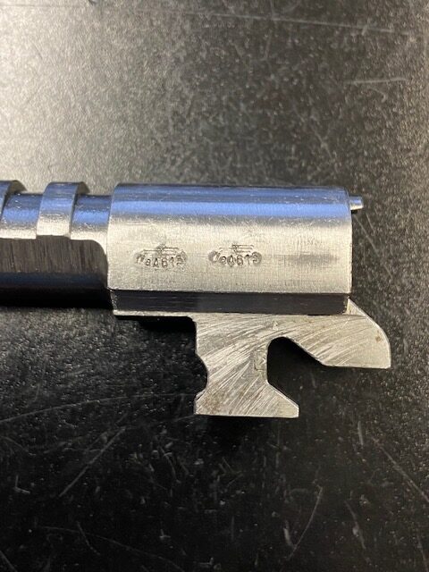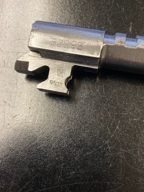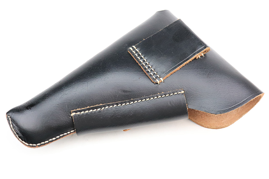 7/19/22 – This is a scarce and interesting FN Browning High Power with tangent rear sight from ~1941. The pistol has about 90-92% of the original blue remaining, with matching serialized barrel, slide and frame. Minor high edge wear on the slide and front strap, and a minor patch of thinning in the slide legend, as well. But the interesting aspects of this pistol involve the military inspection markings or lack thereof. Shortly after the Germans captured the FN factory, the first German military accepted High Powers were made using parts already produced and waiting on the factory floor. So the earliest and most desirable variation would have still have a stock slot in the frame, and some mix of Belgian proofs. The next variation featured a single WaA613 proof on the trigger guard, but this example is missing that proof. It’s in the proper serial range for such an example, and this one does feature the WaA613 proof on the slide, and several more on the barrel. So this appears to either be a military/factory oversight, or a transitional example of some sort. It has the proper early grips with red painted interior. The slide stop may be a replacement as the finish is somewhat incongruent with the rest of the pistol. Bore has strong rifling but some frost and freckling throughout. Unmarked magazine. Comes with a repro holster.
