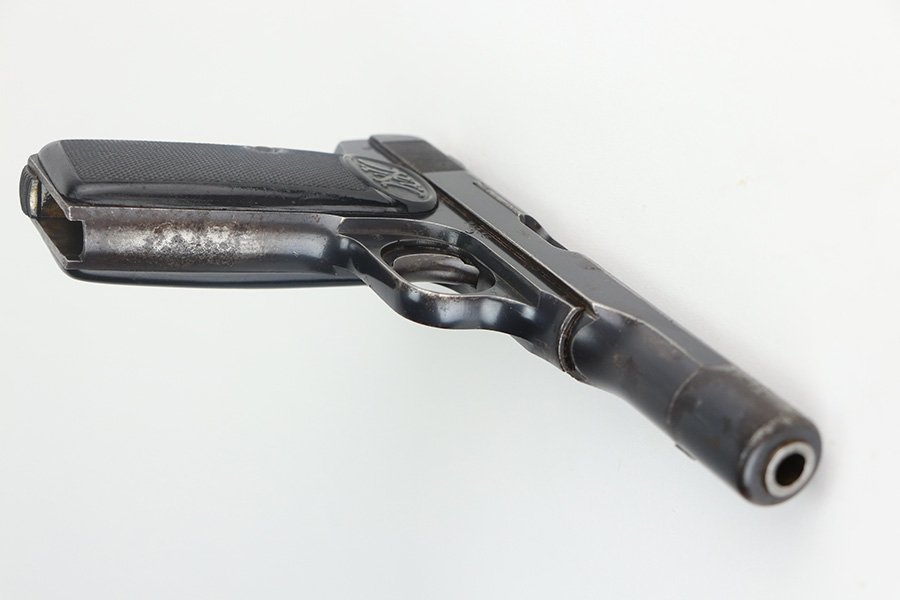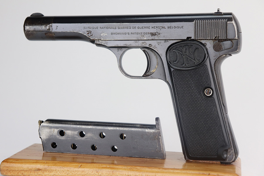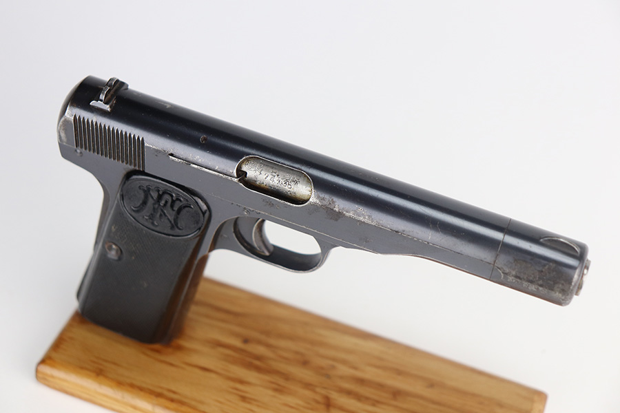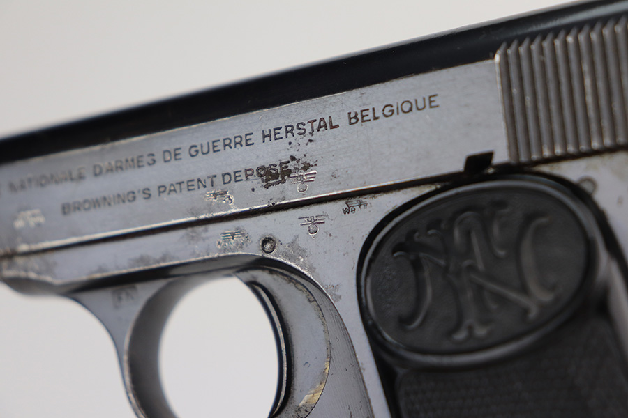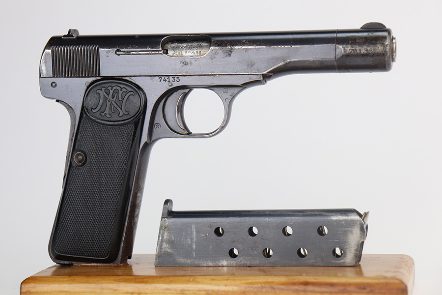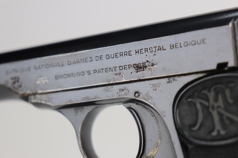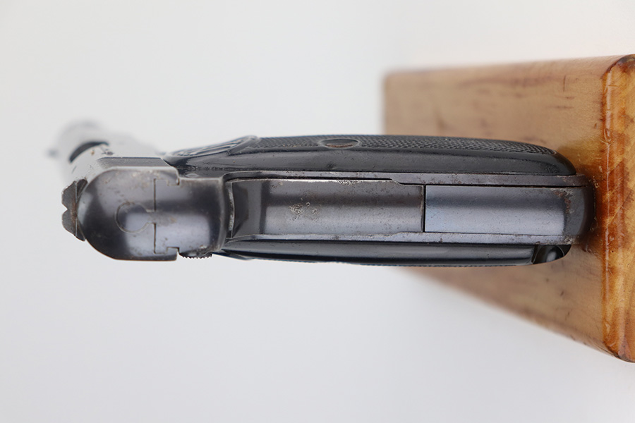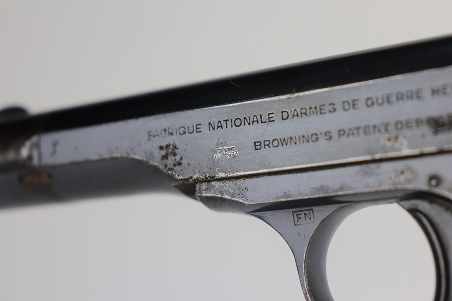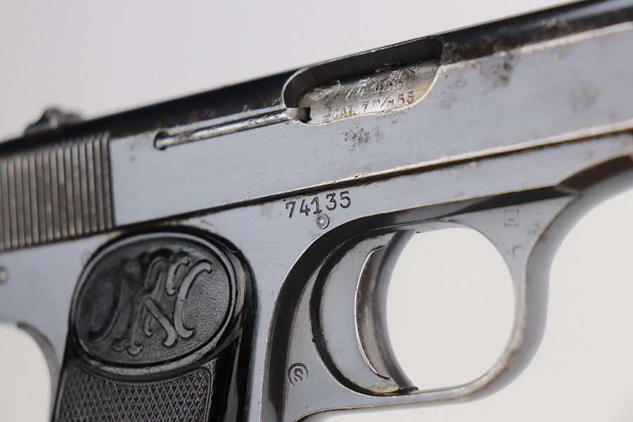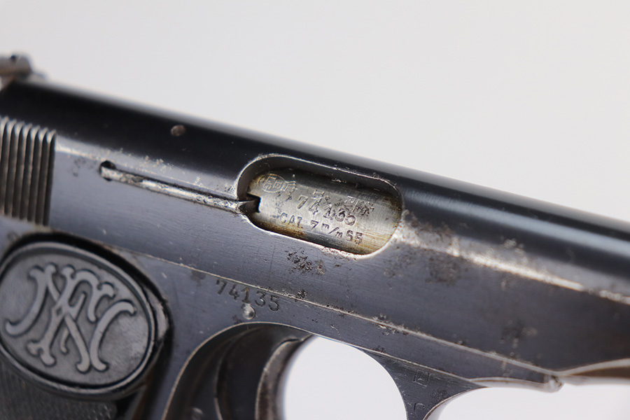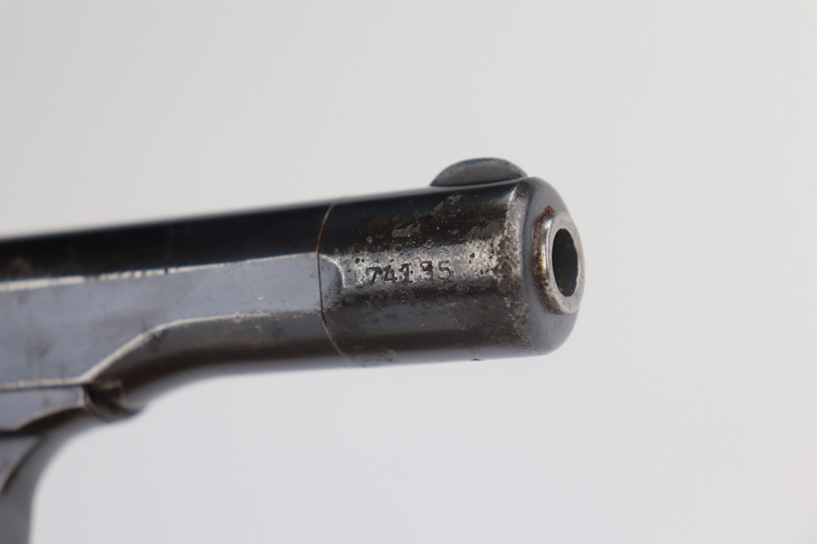 4/27/22 – This is an original example of one of the most rare variations of FN Browning Model 1922 pistol. This pistol falls in the known serial range of pistols that were on the production floor at the time of the German invasion, as originally intended to fulfill the prewar Dutch contract order. This sub-variant does not feature Wilhelmina crest and does not have the lanyard ring installed, but does have the proper grips which are designed to accommodate a lanyard ring. These pistols are actually more commonly found in 9mm, so this 7.65mm is a rare find. WaA613 proofs on slide and frame, which matching serial numbers throughout. While the bluing is original, this pistol does have notable pitting in various areas as our consignor lived outside New Orleans, and had many firearms in his collection damaged in Hurricane Katrina. The bore has strong rifling but also some pitting throughout. Magazine is WaA103 marked.