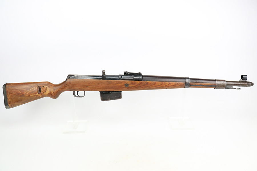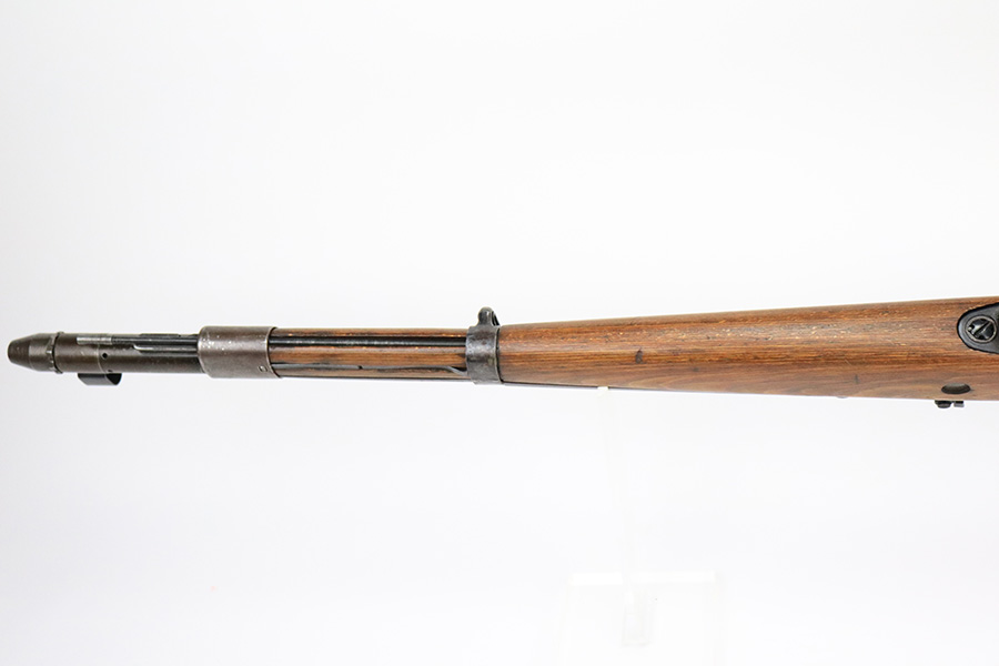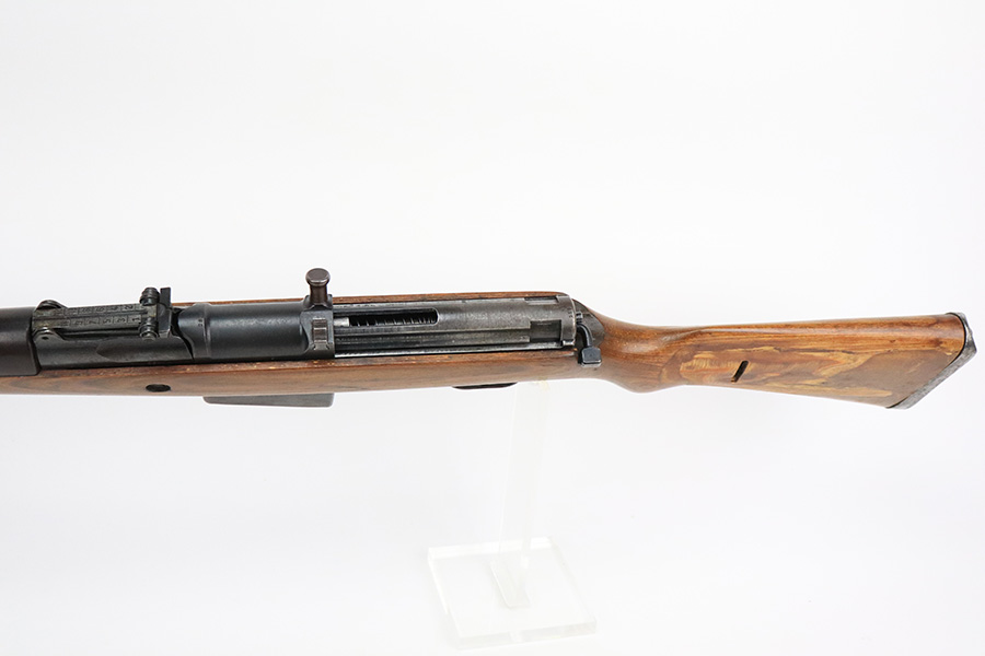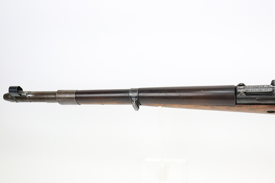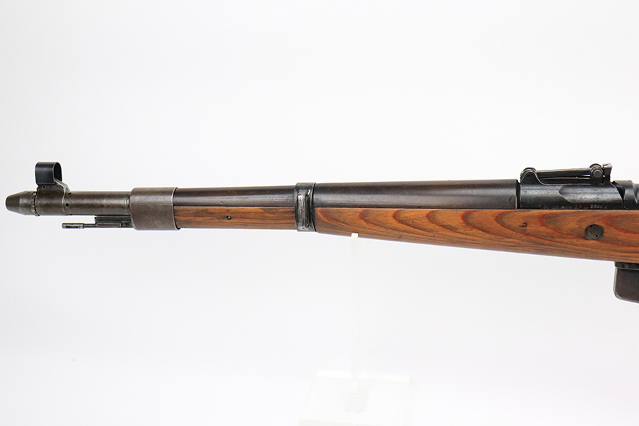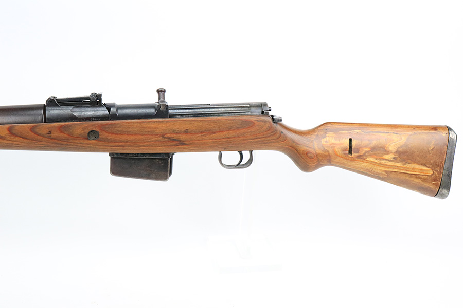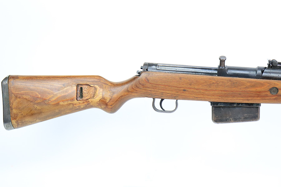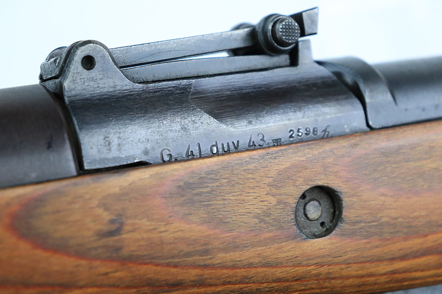 7/13/22 – This is a rare and desirable Walther Gewehr 41 (G41) rifle from World War II. The receiver is marked with ‘duv 43’ code, denoting it was manufactured at the Berlin-Lubecker factory. There were fewer than 10,000 estimated G41s produced before production switched to the G43/K43. These early G41 series of rifles used the “Bang Gas-Trap” system which employed a barrel mounted “Gas Trap” muzzle cone to trap hot gas that was bled off when the round was fired, which cycled the action. This entire series of rifles was very short lived however it was used extensively on the Eastern Front where a semi-automatic rifles was considered essential for “long-life”. Consequently, their survival rate is very low in any condition. The later series of G/K43 rifles did away with the earlier “Bang” gas trap style system and instead used a barrel mounted gas system, that was copied from the Russian Tokarev rifles, making them far more reliable and easier to produce. The Walther design was more successful than the Mauser design at least, as they removed the bolt and had a cleaner receiver area as a result. This particular rifle is all matching and correct, with fully matching numbered parts. The receiver and all numbered areas of the upper/barrel are matching, as is the stock, mag well and trigger assembly. E/214 proofs present on several metal parts. The finish on the metal parts is in nice condition but there is thinning and patina on the receiver, trigger group, magazine/mag well, bands and barrel. The stock sustained some form of cosmetic damage and was presumably sanded to make it look better, as there’s also a surface crack on the left side that was improved/fixed by sanding. The serial is still visible but it’s faint as a result. The buttplate doesn’t fit quite perfectly, possibly due to the sanding/cosmetic issue that had occurred. Includes a cleaning rod and sight hood. Bore has strong rifling but a little frost and freckling in the grooves. This rifle is also missing the dust cover on the bolt assembly, and a screw in the trigger guard.