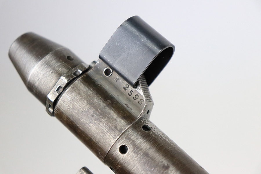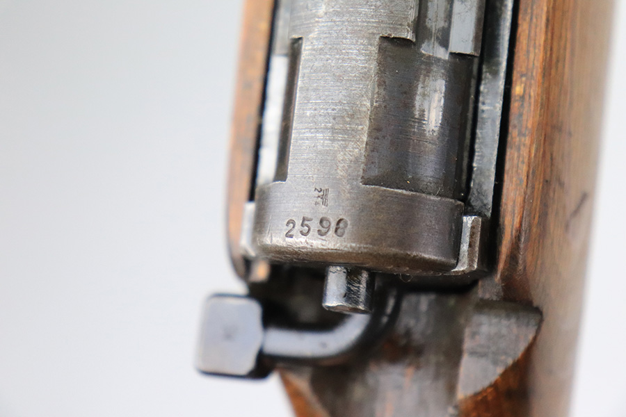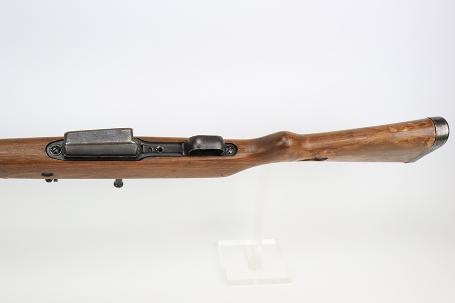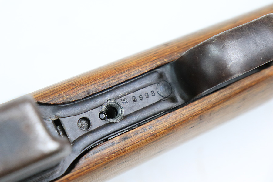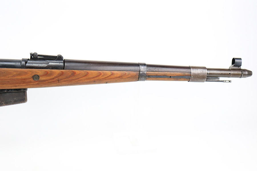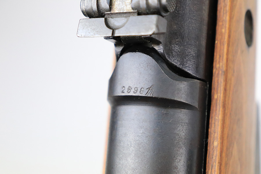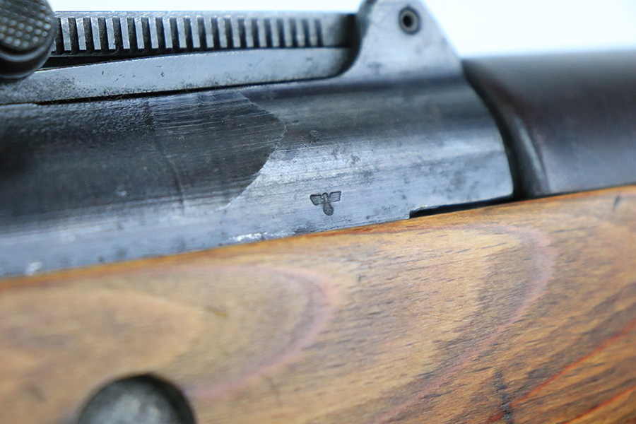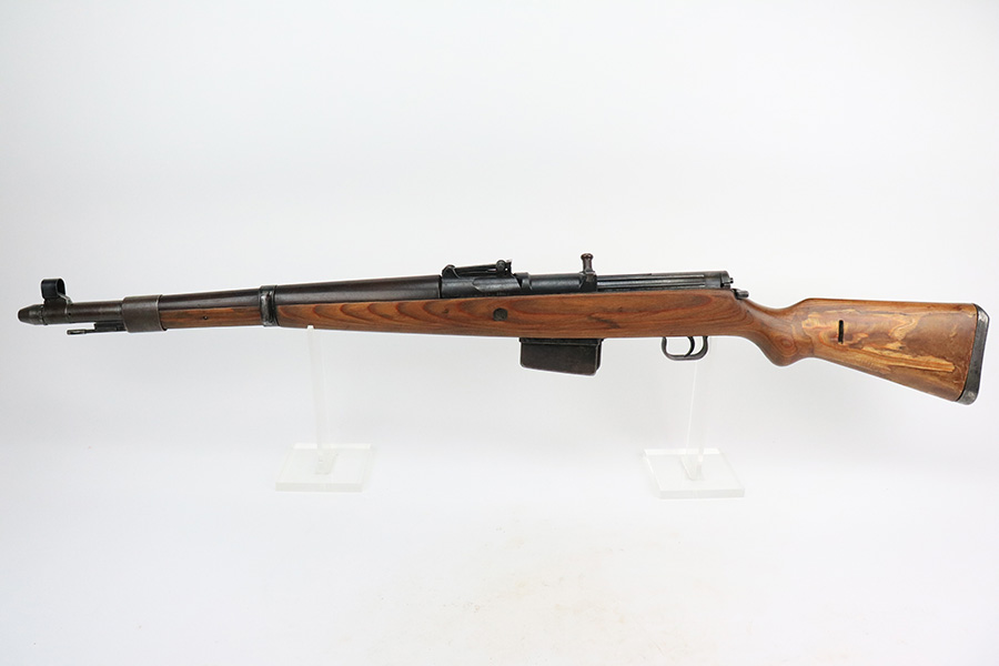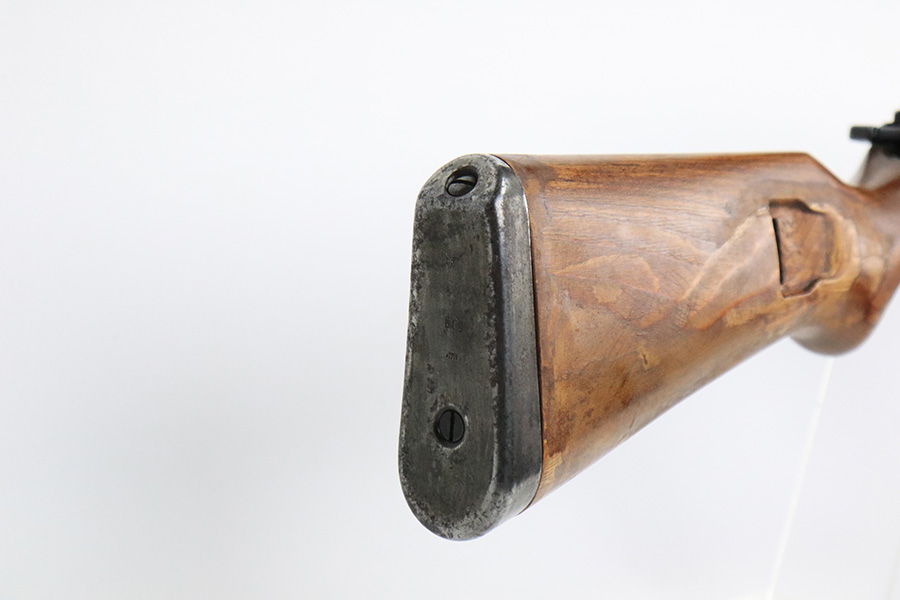 7/13/22 – This is a rare and desirable Walther Gewehr 41 (G41) rifle from World War II. The receiver is marked with ‘duv 43’ code, denoting it was manufactured at the Berlin-Lubecker factory. There were fewer than 10,000 estimated G41s produced before production switched to the G43/K43. These early G41 series of rifles used the “Bang Gas-Trap” system which employed a barrel mounted “Gas Trap” muzzle cone to trap hot gas that was bled off when the round was fired, which cycled the action. This entire series of rifles was very short lived however it was used extensively on the Eastern Front where a semi-automatic rifles was considered essential for “long-life”. Consequently, their survival rate is very low in any condition. The later series of G/K43 rifles did away with the earlier “Bang” gas trap style system and instead used a barrel mounted gas system, that was copied from the Russian Tokarev rifles, making them far more reliable and easier to produce. The Walther design was more successful than the Mauser design at least, as they removed the bolt and had a cleaner receiver area as a result. This particular rifle is all matching and correct, with fully matching numbered parts. The receiver and all numbered areas of the upper/barrel are matching, as is the stock, mag well and trigger assembly. E/214 proofs present on several metal parts. The finish on the metal parts is in nice condition but there is thinning and patina on the receiver, trigger group, magazine/mag well, bands and barrel. The stock sustained some form of cosmetic damage and was presumably sanded to make it look better, as there’s also a surface crack on the left side that was improved/fixed by sanding. The serial is still visible but it’s faint as a result. The buttplate doesn’t fit quite perfectly, possibly due to the sanding/cosmetic issue that had occurred. Includes a cleaning rod and sight hood. Bore has strong rifling but a little frost and freckling in the grooves. This rifle is also missing the dust cover on the bolt assembly, and a screw in the trigger guard.