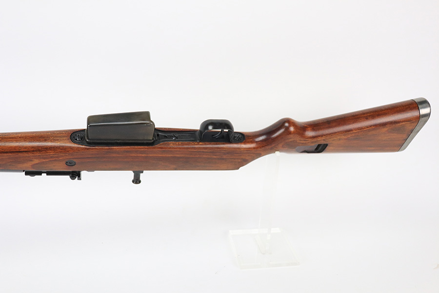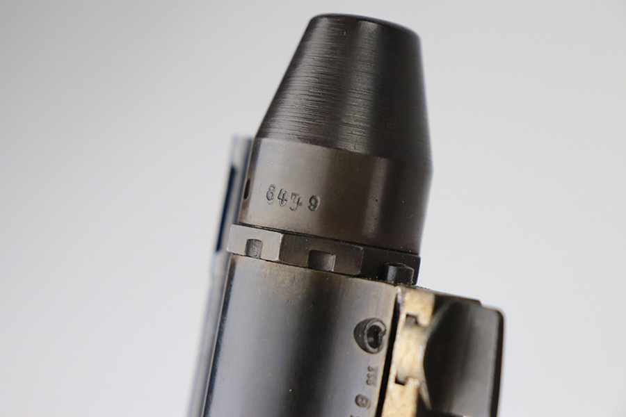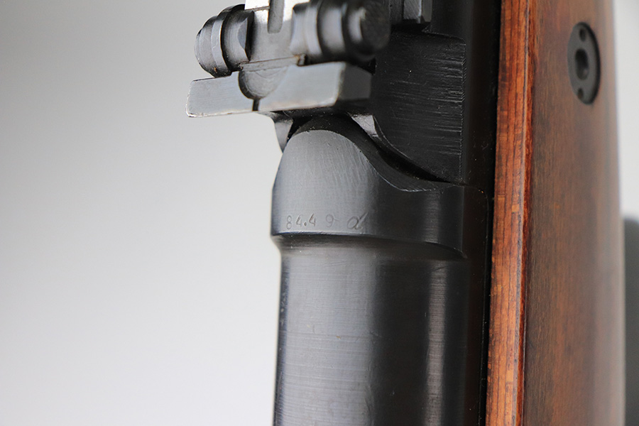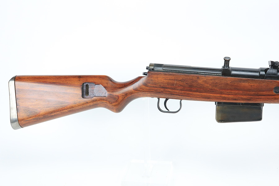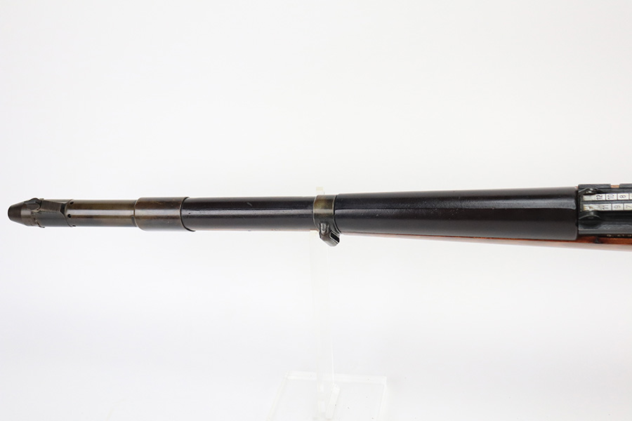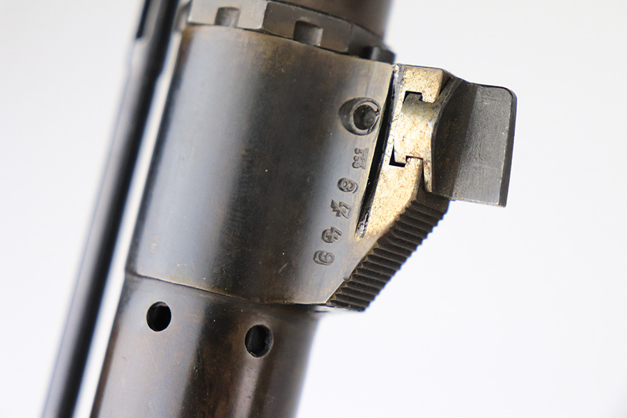 1/26/22 – This is a rare and desirable Walther Gewehr 41 (G41) rifle from World War II. The receiver is marked with ‘duv 43’ code, denoting it was manufactured at the Berlin-Lubecker factory. There were fewer than 10,000 estimated G41s produced before production switched to the G43/K43. These early G41 series of rifles used the “Bang Gas-Trap” system which employed a barrel mounted “Gas Trap” muzzle cone to trap hot gas that was bled off when the round was fired, which cycled the action. This entire series of rifles was very short lived however it was used extensively on the Eastern Front where a semi-automatic rifles was considered essential for “long-life”. Consequently, their survival rate is very low in any condition. The later series of G/K43 rifles did away with the earlier “Bang” gas trap style system and instead used a barrel mounted gas system, that was copied from the Russian Tokarev rifles, making them far more reliable and easier to produce. The Walther design was more successful than the Mauser design at least, as they removed the bolt and had a cleaner receiver area as a result. This particular rifle is all matching, with fully matching numbered parts. The receiver and all numbered areas of the upper/barrel are matching, as is the stock, mag well and trigger assembly, but it does appear that the front sight and muzzle cap are renumbered to match the rifle, and the mag well serial is electro-penciled on. E/214 proofs present on several metal parts. The finish on the metal parts is in great condition, but there is an area of cold blue around the front band and barrel. The stock is in excellent condition with no cracks and hardly any chips or dings, but was sanded throughout at some point. Excellent, shiny bore. Includes cleaning rod and sight hood.