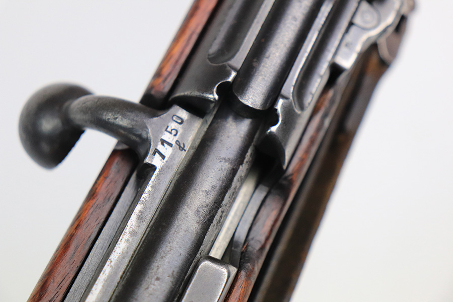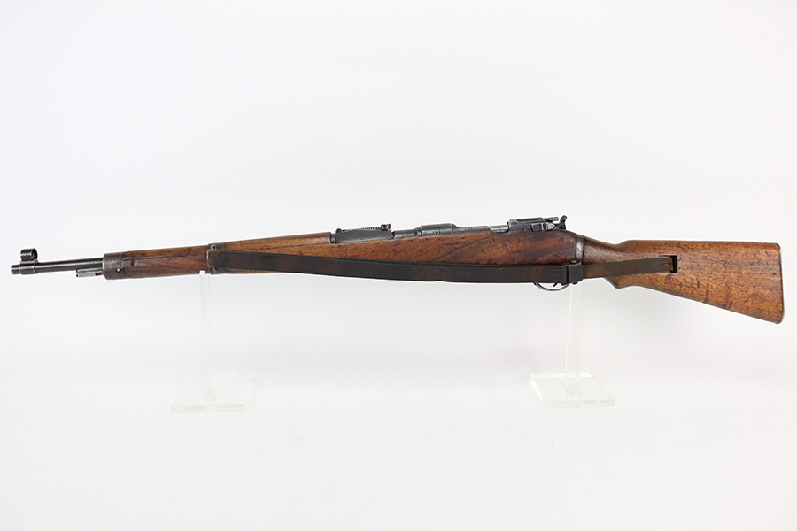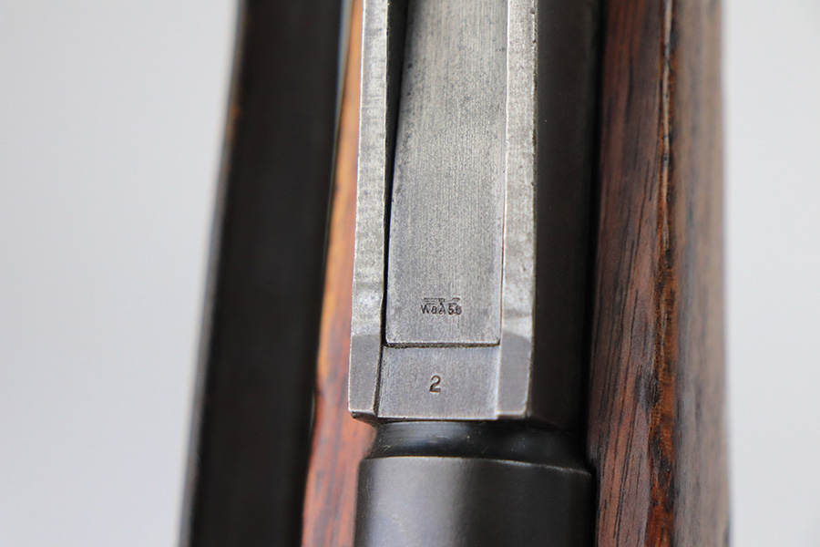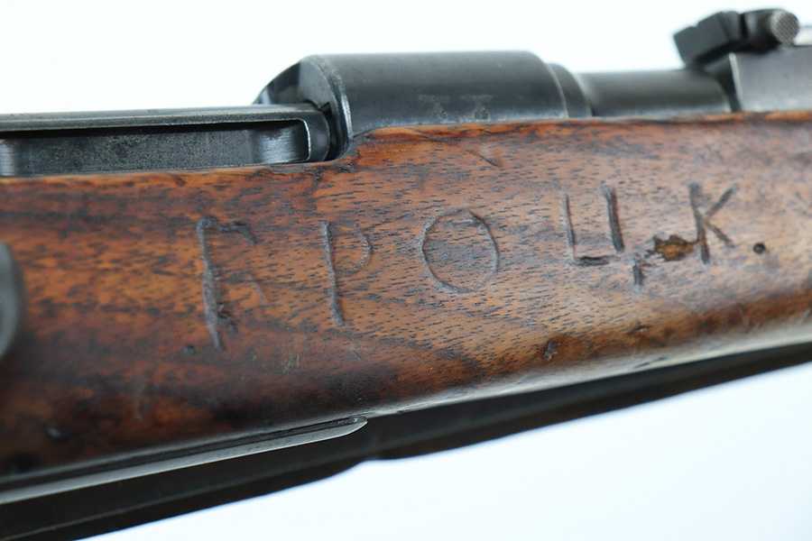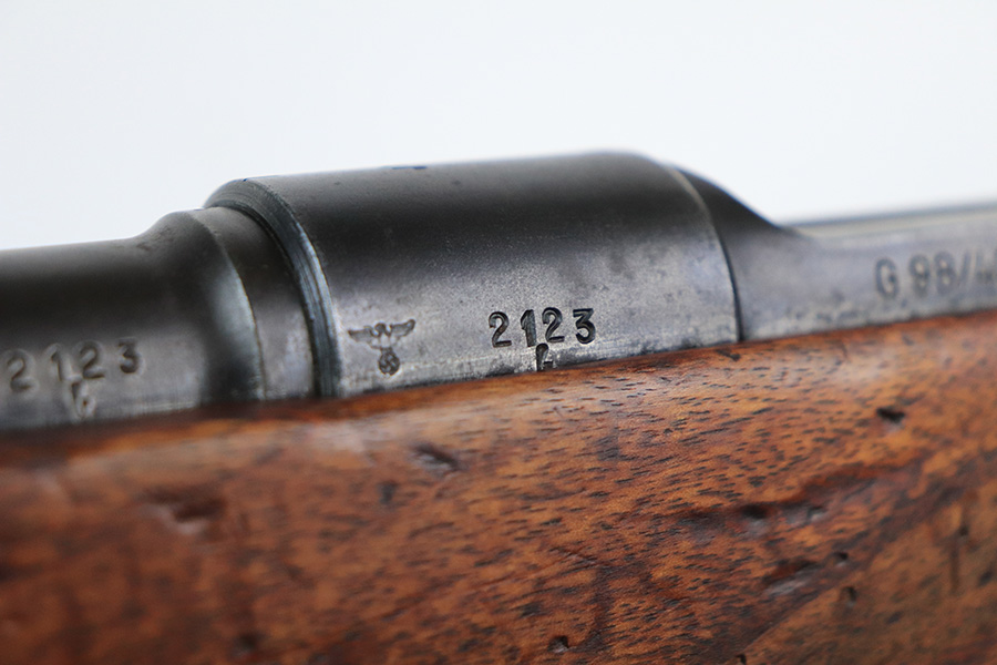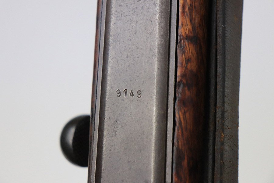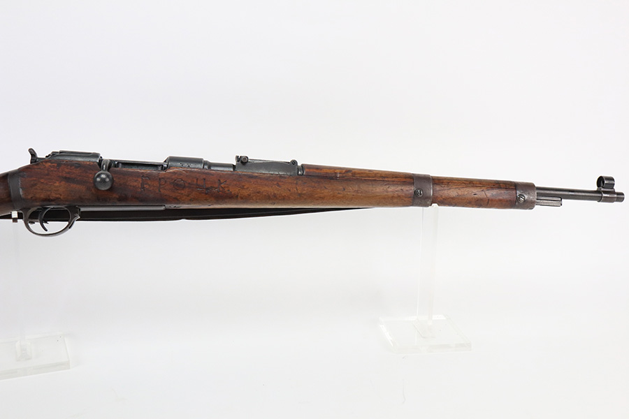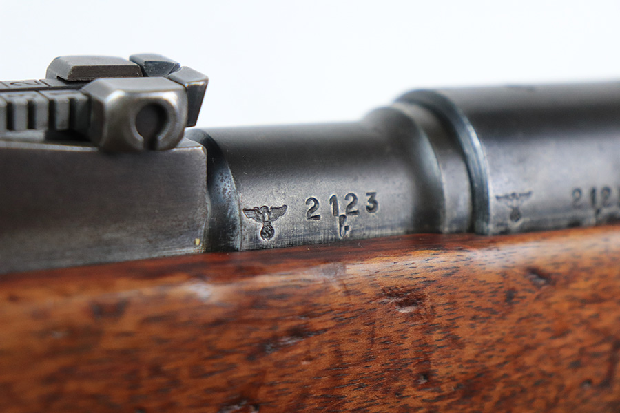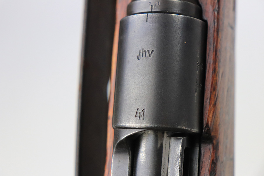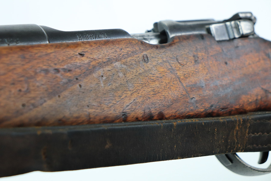 8/20/24 – This is a rare Nazi issued rifle, made in 1941 at the FEG factory in Hungary. These rifles were originally manufactured during the early part of WWII as the Hungarian model 35, at the Metal Goods and Weapons Factory, Budapest, Hungary. After the take over of the Hungarian factory by the Germans these rifles were designated the model G98/40 and the factory was given the wartime code of “jhv”. This rifle is similar in function and operation to the standard K98 rifle with nearly identical front and rear sights, making training and reissue very easy. The top of the receiver is marked “jhv/41” the wartime code for the Hungarian factory and 1941 for the year of manufacture. The left receiver side wall is marked “G98/40” and the left side of the receiver and barrel have the large German Eagle firing proof. This one has a mismatched bolt and floorplate. Matching numbers on the bands, receiver, barrel, rear sight, buttplate and trigger housing. Stock shows its age but doesn’t have any cracks. Many dings and scratches throughout, and a previous owner carved their name in the right side. Sharp waffenamts are present, at least. The bore has strong rifling but frost throughout and is in need of a thorough cleaning as it’s very dirty. Finish on the metal parts is original throughout but shows some general thinning in most areas, and minor freckling in a couple of areas. Comes with original sling.