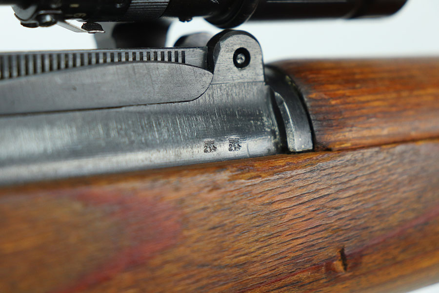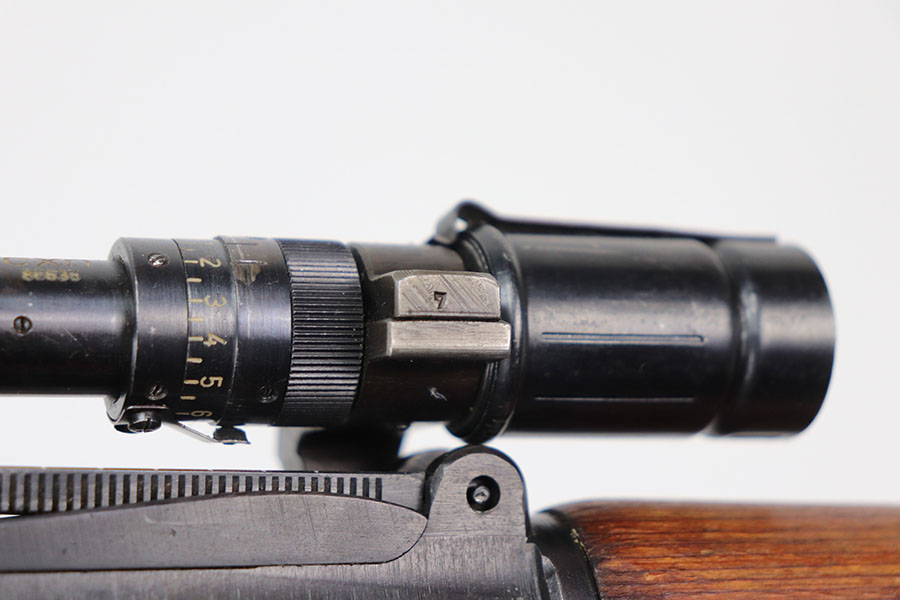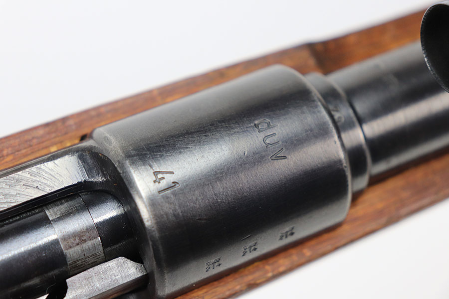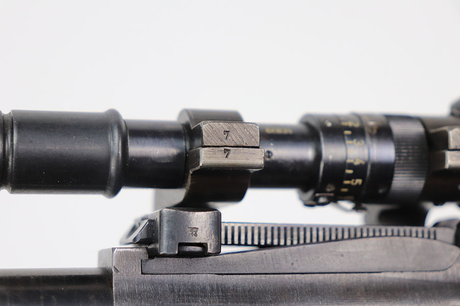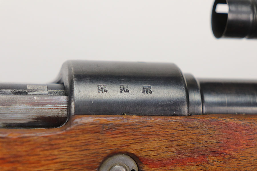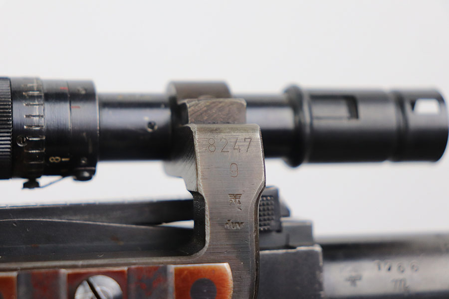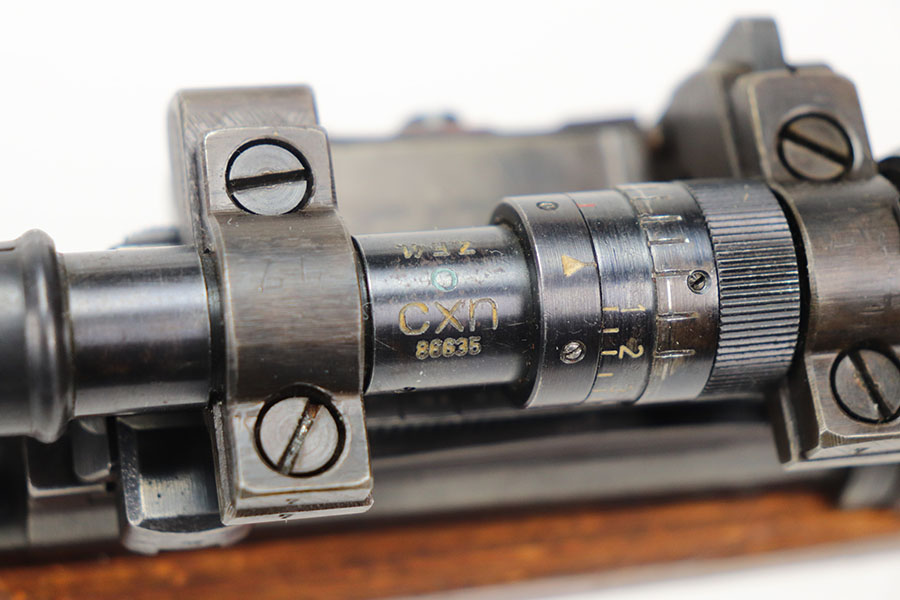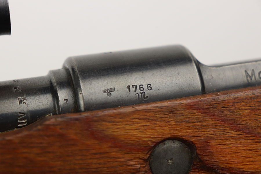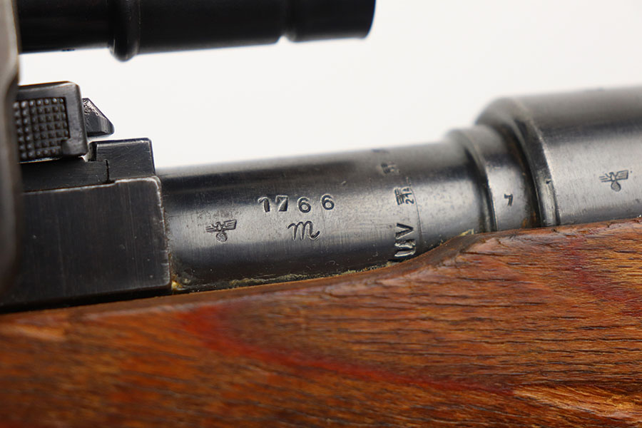 8/13/21 – This is an all matching and original example of a rare Nazi Mod 98K sniper rifle that was produced in 1941 at the Gustloff Werke factory. Matching receiver, barrel, bands, trigger group, bolt assembly, stock and buttplate. The safety and bolt head are unnumbered, and likely should be numbered. Possible they are correct, possible they were field replacement parts. Sharp waffenamts, including the Heer Army proof on the right side of the stock. Original sling, cleaning rod and sight hood are all present. Comes with original scope and mount. Mount is serialized and also ‘duv’ maker marked. The Z.F.41 scope is original and ‘cxn’ maker marked. Optics are pretty clear, just slight cloudiness. Comes with the original scope case, too, which is matching serial number to the mount.