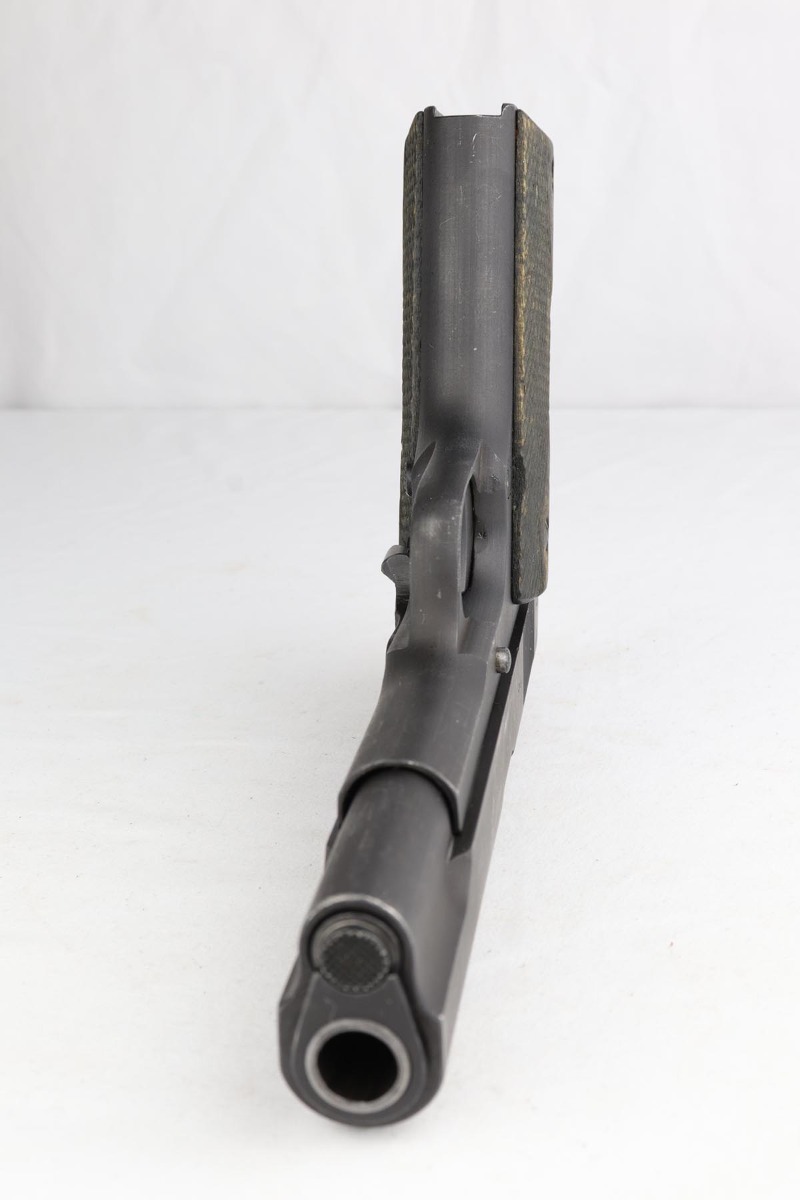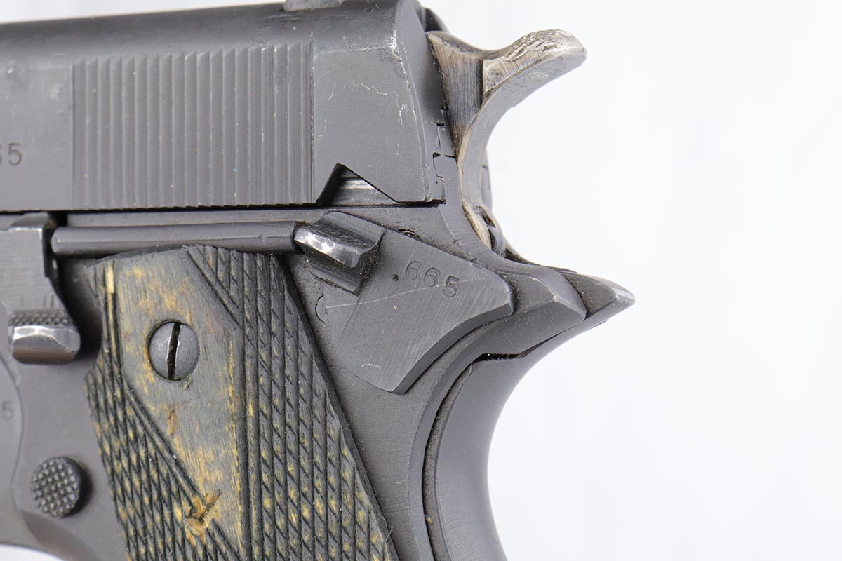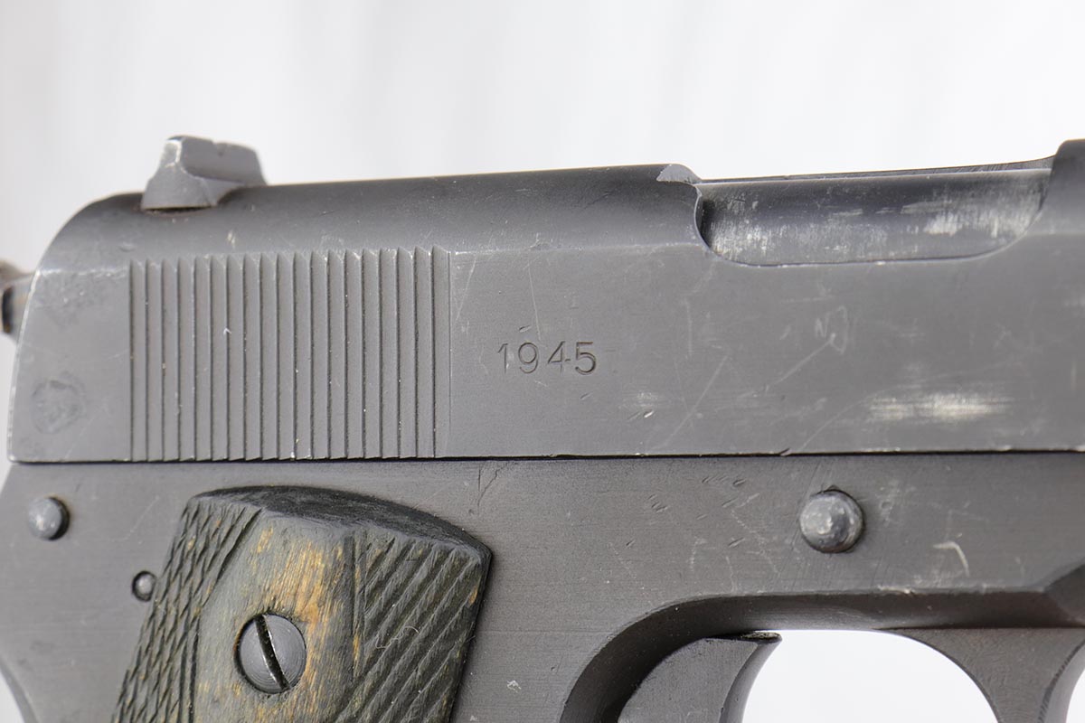 3/21/19 – This is an excellent Kongsberg Colt model 1914, manufactured in 1945 and issued to the Nazi Army. These are rare pistols, and this one is all original and correct. The finish rates at 96-97% with minor scuff marks on the slide and frame, and minor high edge wear. Colt licensed out production of the 1911 to Kongsberg Vaapenfabrik in Norway, who in 1945 produced less than 1,000 of this waffen variation according to Jan Still’s book. This particular piece falls in the documented serial range of 29261-30523, where only ~75 have been reported. It has the original matte blue finish and stained birch grips, which have retained a good portion of the dark stain finish. The gun is 1945 dated, and it is stamped along the left side of the slide “11.25m/m AUT. PISTOL M/1914” followed by the serial number, above which is a crown/K inspector proof. To the left of this stamp is an E/WaA84 nazi proof, showing this gun was delivered to the German occupying forces in Norway. The barrel is numbered to the pistol. Bore is excellent, all parts are original and matching and gun comes with original loop magazine, though the loop has been removed. Grips do have some dings/gouges.