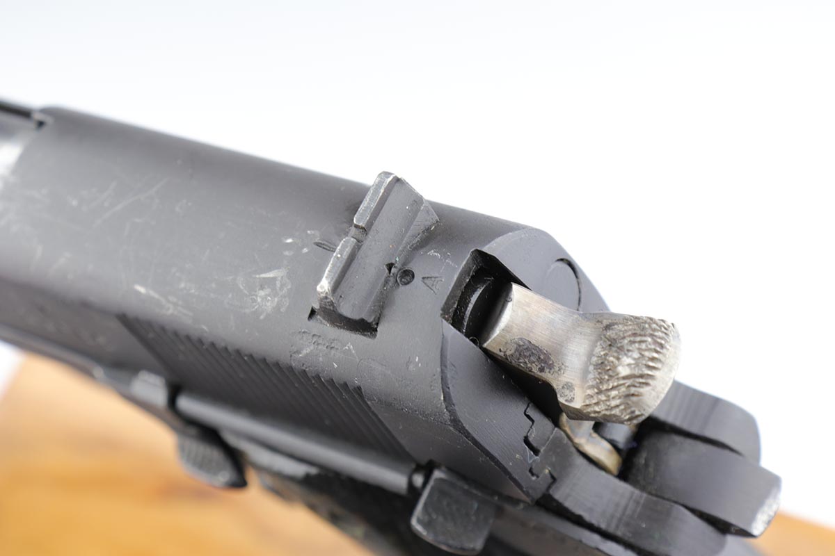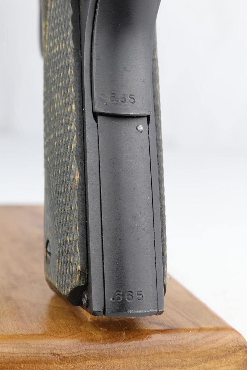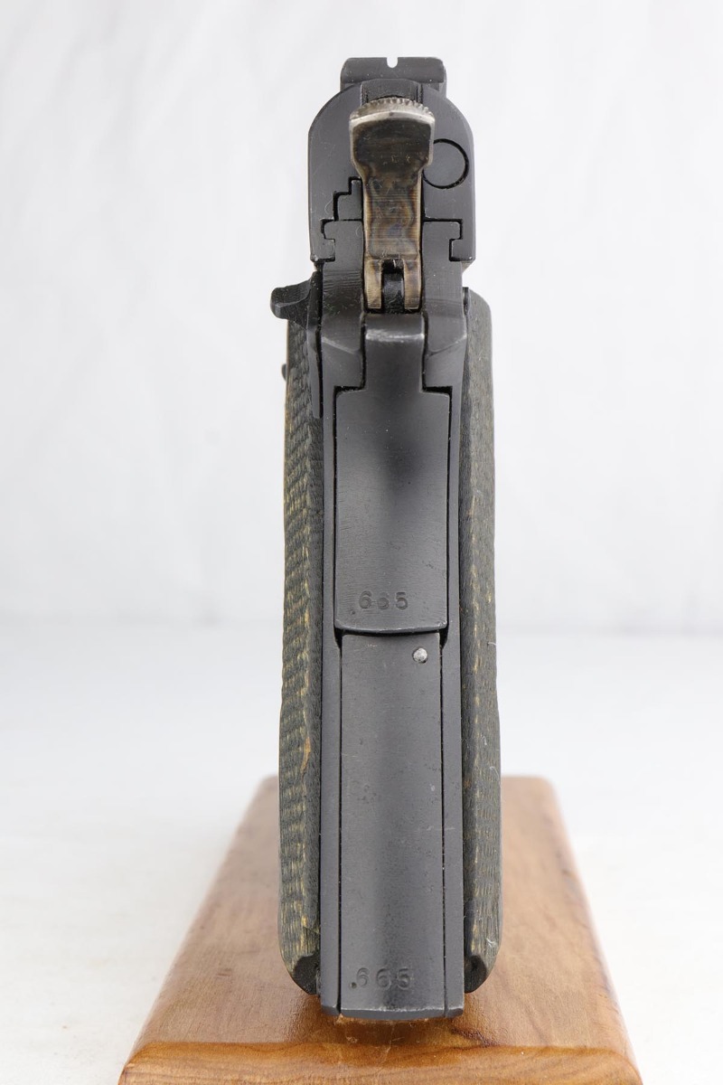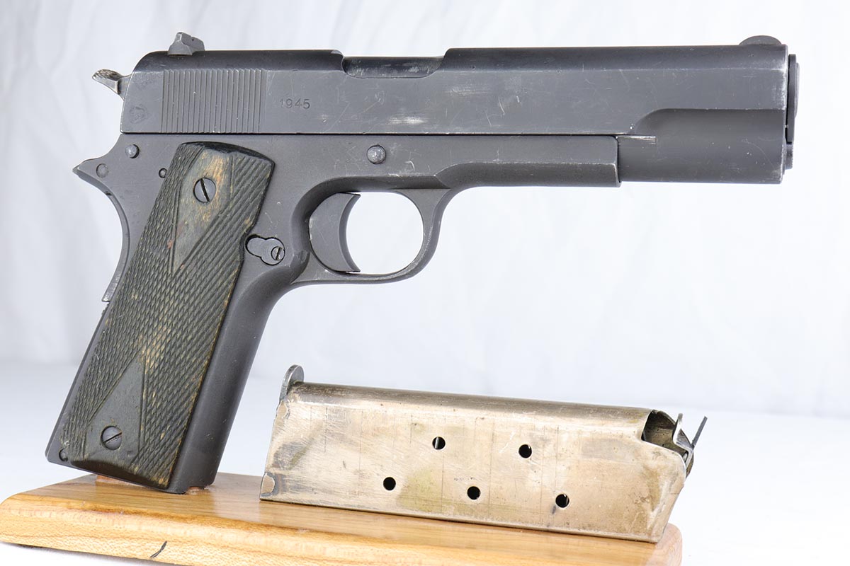3/21/19 – This is an excellent Kongsberg Colt model 1914, manufactured in 1945 and issued to the Nazi Army. These are rare pistols, and this one is all original and correct. The finish rates at 96-97% with minor scuff marks on the slide and frame, and minor high edge wear. Colt licensed out production of the 1911 to Kongsberg Vaapenfabrik in Norway, who in 1945 produced less than 1,000 of this waffen variation according to Jan Still’s book. This particular piece falls in the documented serial range of 29261-30523, where only ~75 have been reported. It has the original matte blue finish and stained birch grips, which have retained a good portion of the dark stain finish. The gun is 1945 dated, and it is stamped along the left side of the slide “11.25m/m AUT. PISTOL M/1914” followed by the serial number, above which is a crown/K inspector proof. To the left of this stamp is an E/WaA84 nazi proof, showing this gun was delivered to the German occupying forces in Norway. The barrel is numbered to the pistol. Bore is excellent, all parts are original and matching and gun comes with original loop magazine, though the loop has been removed. Grips do have some dings/gouges.