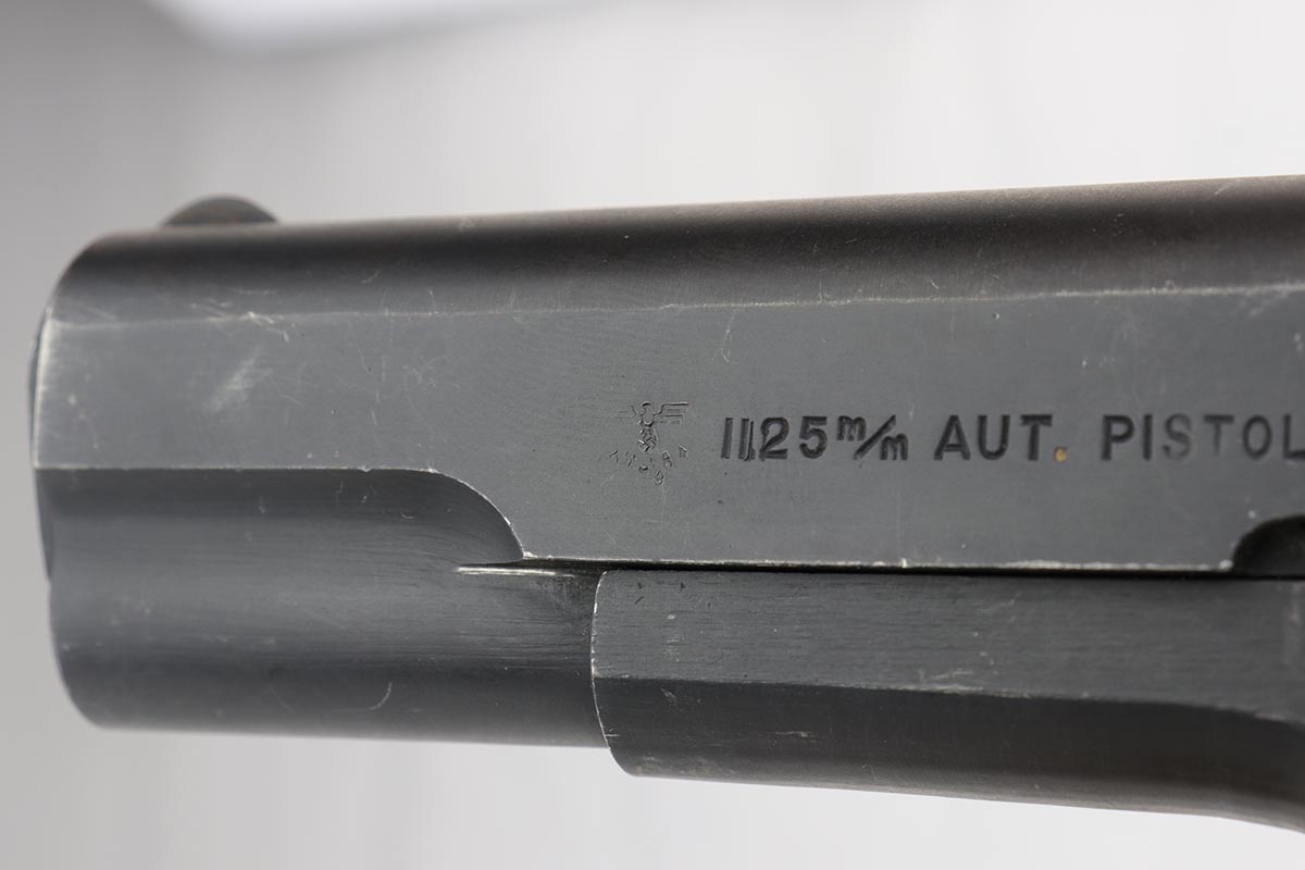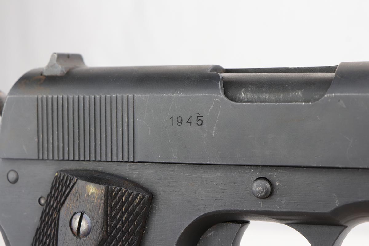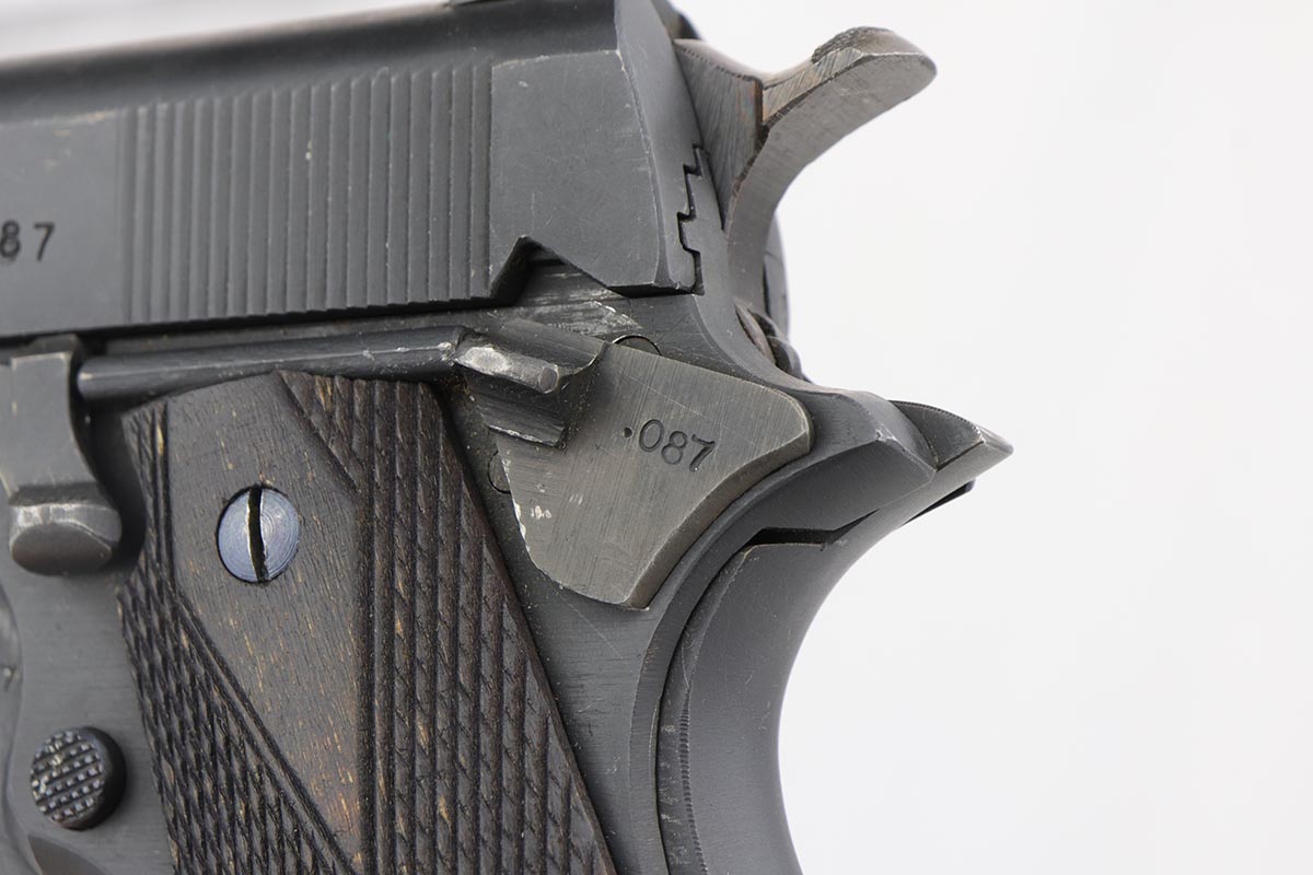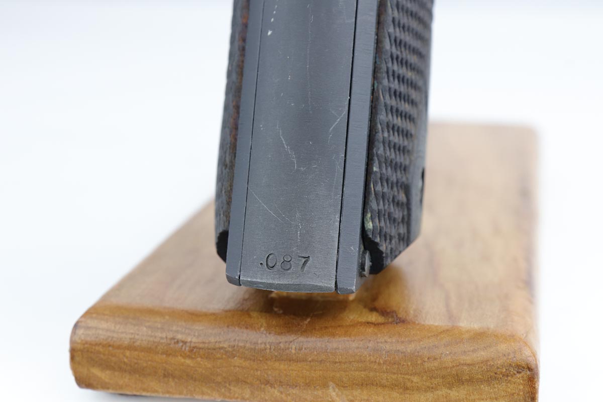 11/21/19 – This is an excellent Kongsberg Colt model 1914, manufactured in 1945 and issued to the Nazi Army. These are rare pistols, and this one is all original and correct. The finish rates at 98-99% with virtually zero finish loss, but it is important to note that the top and right side of the slide must’ve been exposed to some moisture, as there is some pitting along the forward third of the slide. Colt licensed out production of the 1911 to Kongsberg Vaapenfabrik in Norway, who in 1945 produced less than 1,000 of this waffen variation according to Jan Still’s book. This particular piece falls in the documented serial range of 29261-30523, where only ~75 have been reported. It has the original matte blue finish and stained birch grips, which have retained a good portion of the dark stain finish. The gun is 1945 dated, and it is stamped along the left side of the slide “11.25m/m AUT. PISTOL M/1914” followed by the serial number, above which is a crown/K inspector proof. To the left of this stamp is an E/WaA84 nazi proof, showing this gun was delivered to the German occupying forces in Norway. The barrel is numbered to the pistol, and it does have a faint eagle proof on the left side of the lug. Bore is excellent, all parts are original and matching. Excellent grips. After market magazine.