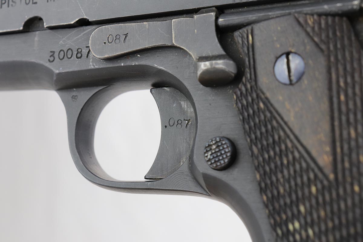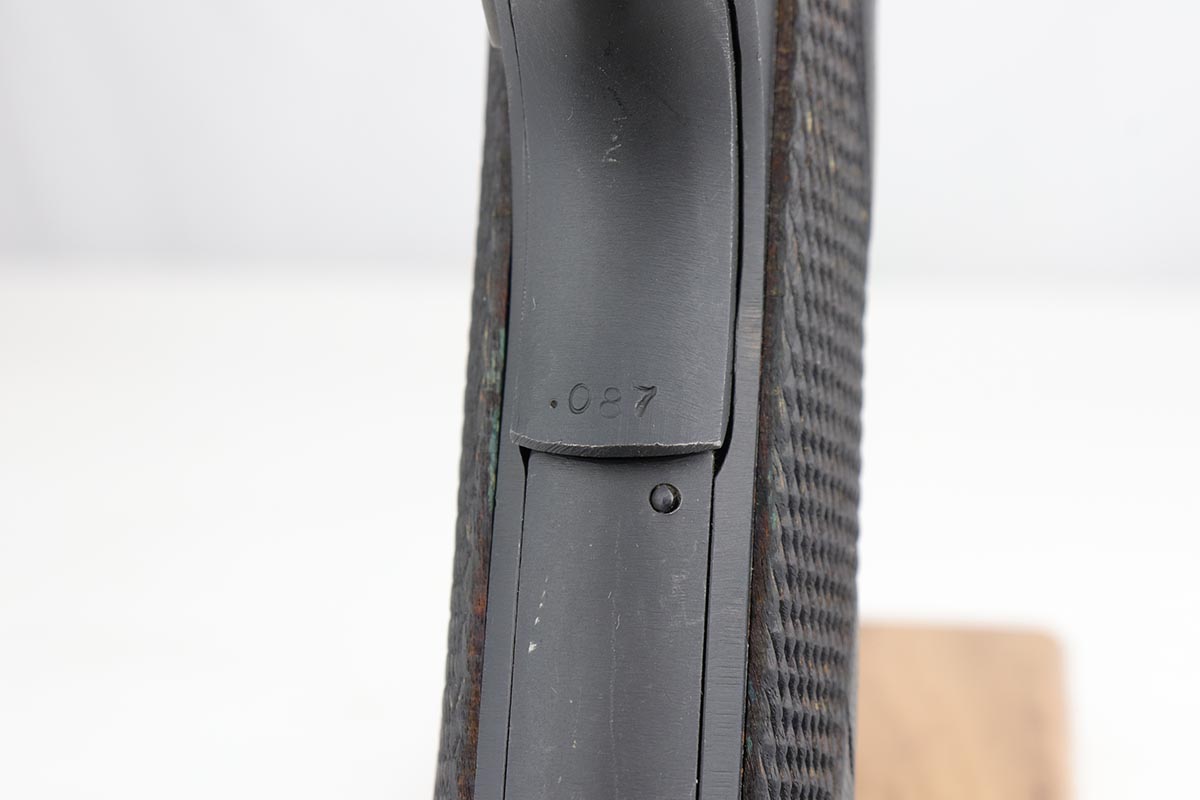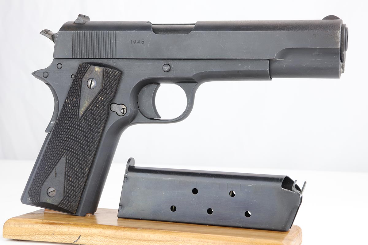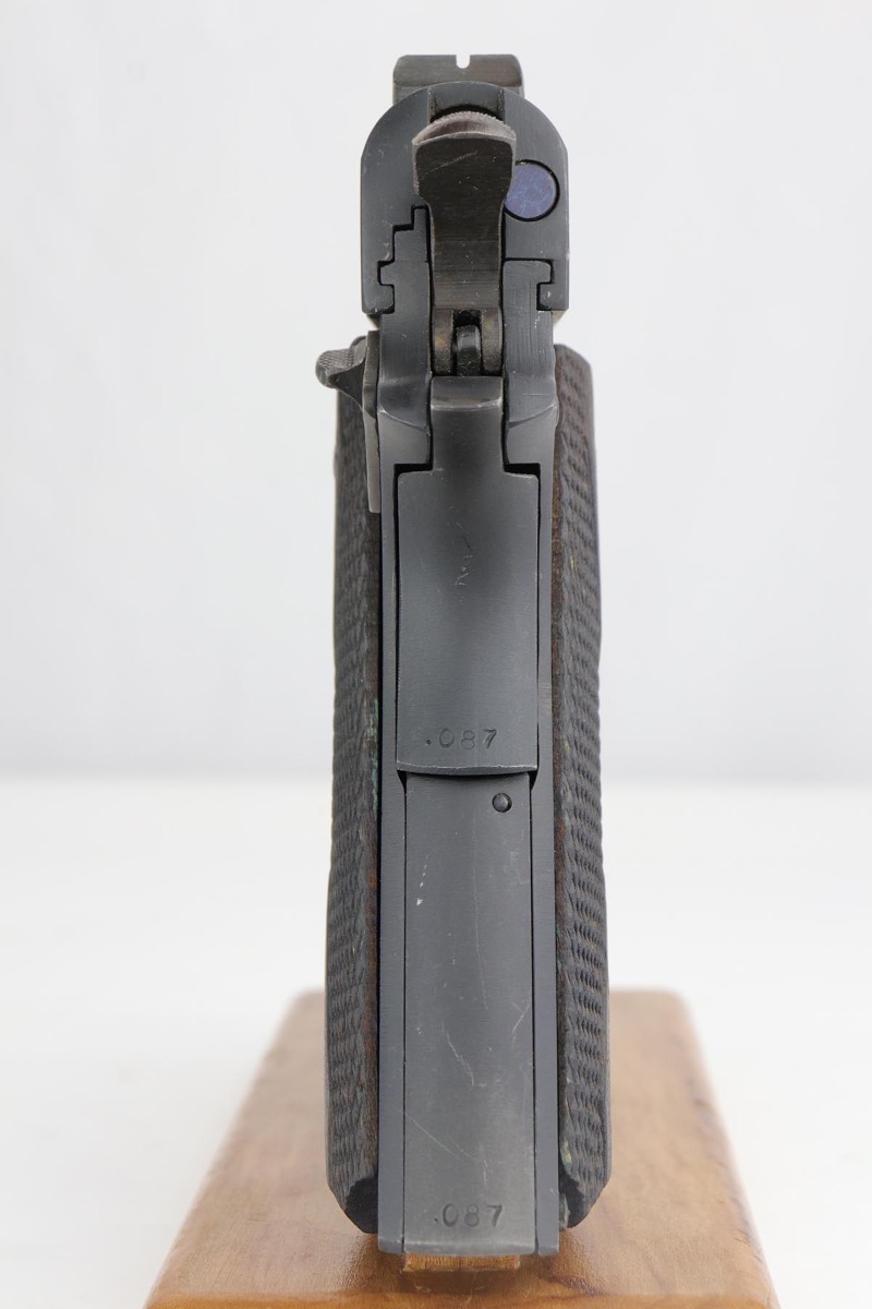 11/21/19 – This is an excellent Kongsberg Colt model 1914, manufactured in 1945 and issued to the Nazi Army. These are rare pistols, and this one is all original and correct. The finish rates at 98-99% with virtually zero finish loss, but it is important to note that the top and right side of the slide must’ve been exposed to some moisture, as there is some pitting along the forward third of the slide. Colt licensed out production of the 1911 to Kongsberg Vaapenfabrik in Norway, who in 1945 produced less than 1,000 of this waffen variation according to Jan Still’s book. This particular piece falls in the documented serial range of 29261-30523, where only ~75 have been reported. It has the original matte blue finish and stained birch grips, which have retained a good portion of the dark stain finish. The gun is 1945 dated, and it is stamped along the left side of the slide “11.25m/m AUT. PISTOL M/1914” followed by the serial number, above which is a crown/K inspector proof. To the left of this stamp is an E/WaA84 nazi proof, showing this gun was delivered to the German occupying forces in Norway. The barrel is numbered to the pistol, and it does have a faint eagle proof on the left side of the lug. Bore is excellent, all parts are original and matching. Excellent grips. After market magazine.